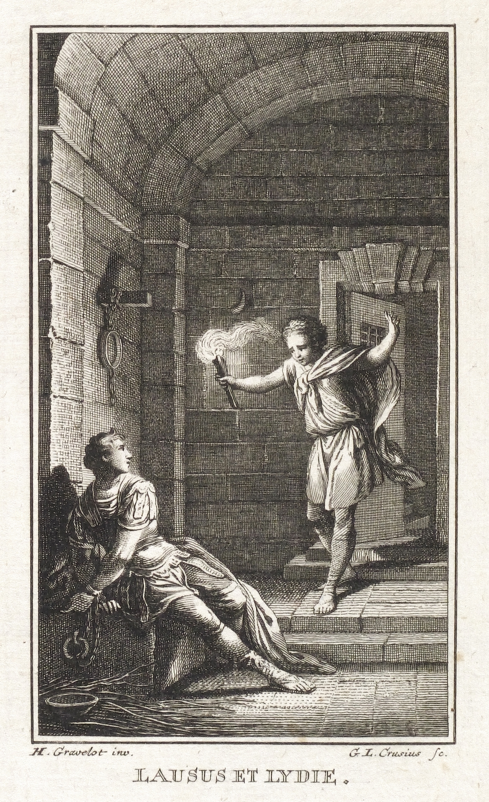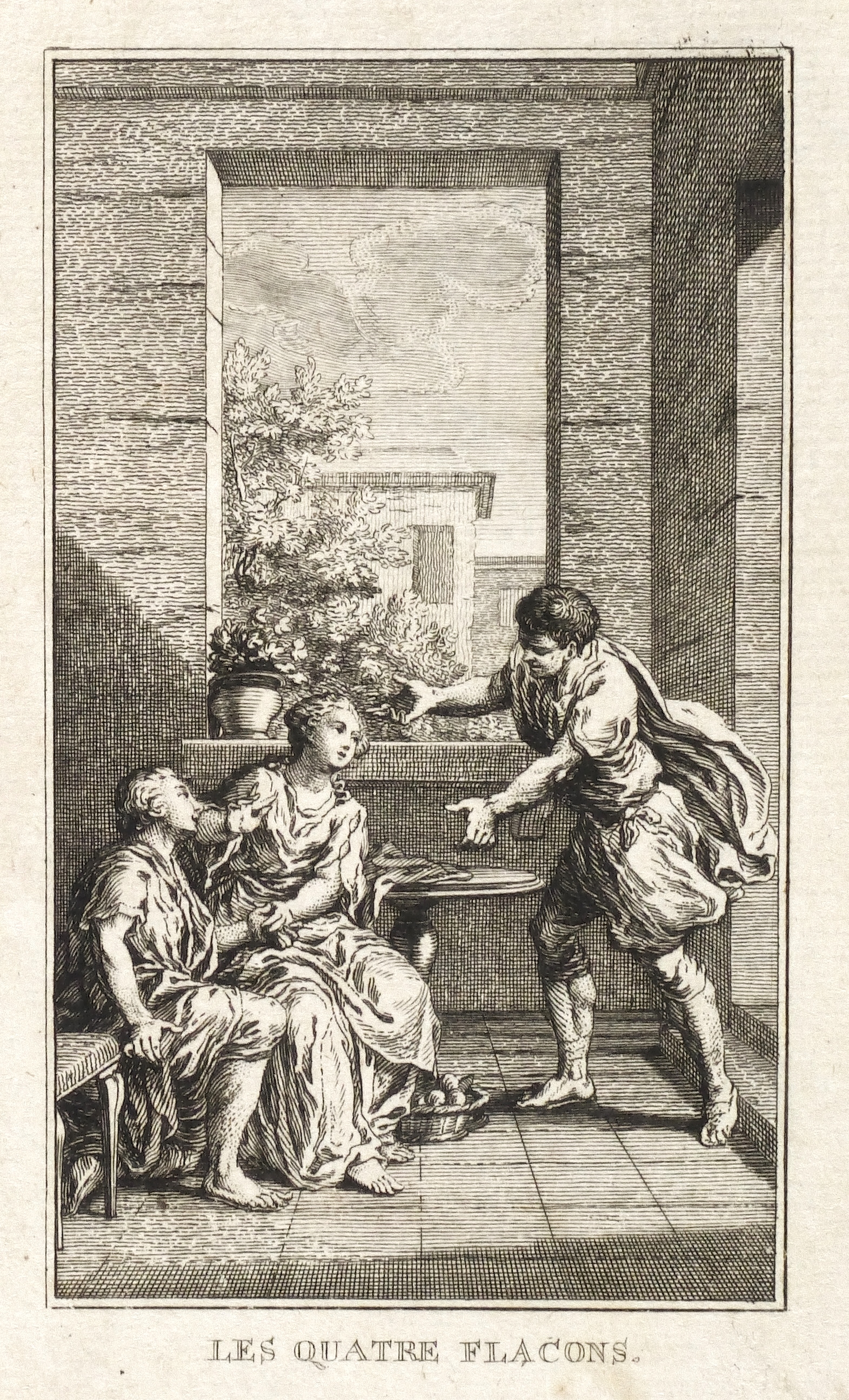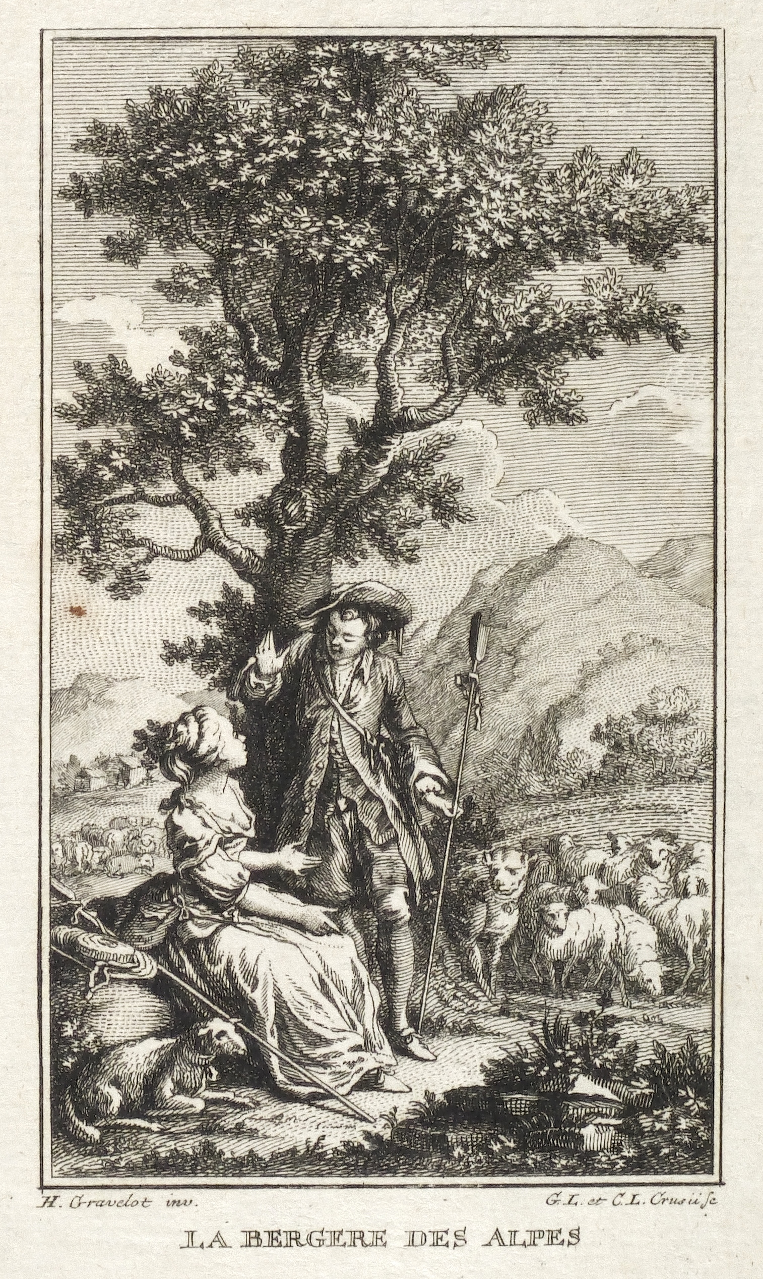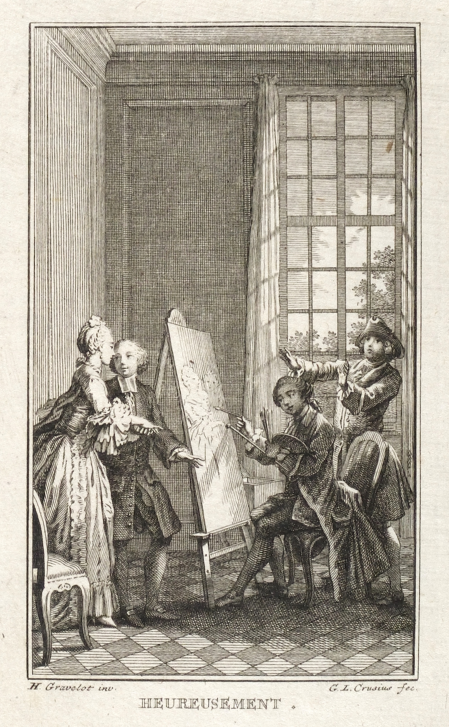 Hubert-François Gravelot (1699 Paris - 1773 Paris). Französischer Maler, Zeichner und Kupferstecher. Gravelot ist einer der bedeutensten Buchillustratoren des französischen Rokoko. Sein Bruder ist der Kartograf Jean-Baptiste Bourguignon d’Anville. Gravelot erhielt eine Ausbildung am Collège des Quatre Nations. Dann war zunächst auf Betreiben des Vaters mehrere Jahre als Kartenzeichner tätig. Ab 1729 lernte er zunächst bei Jean Restout, darauf bei François Boucher. 1732 siedelt Gravelot nach England über und arbeitete dort für den Verleger Claude Dubosc. Er profilierte sich als Illustrator, beschäftigte sich aber auch mit Malerei. So unterrichtete er zeitweise als Professor an der St. Martin’s Lane Academy. 1746 kehrte Gravelot nach Frankreich zurück. Er illustrierte unter anderem Werke von Rousseau, Corneille, Voltaire, Marmontel, Racine und Tasso.