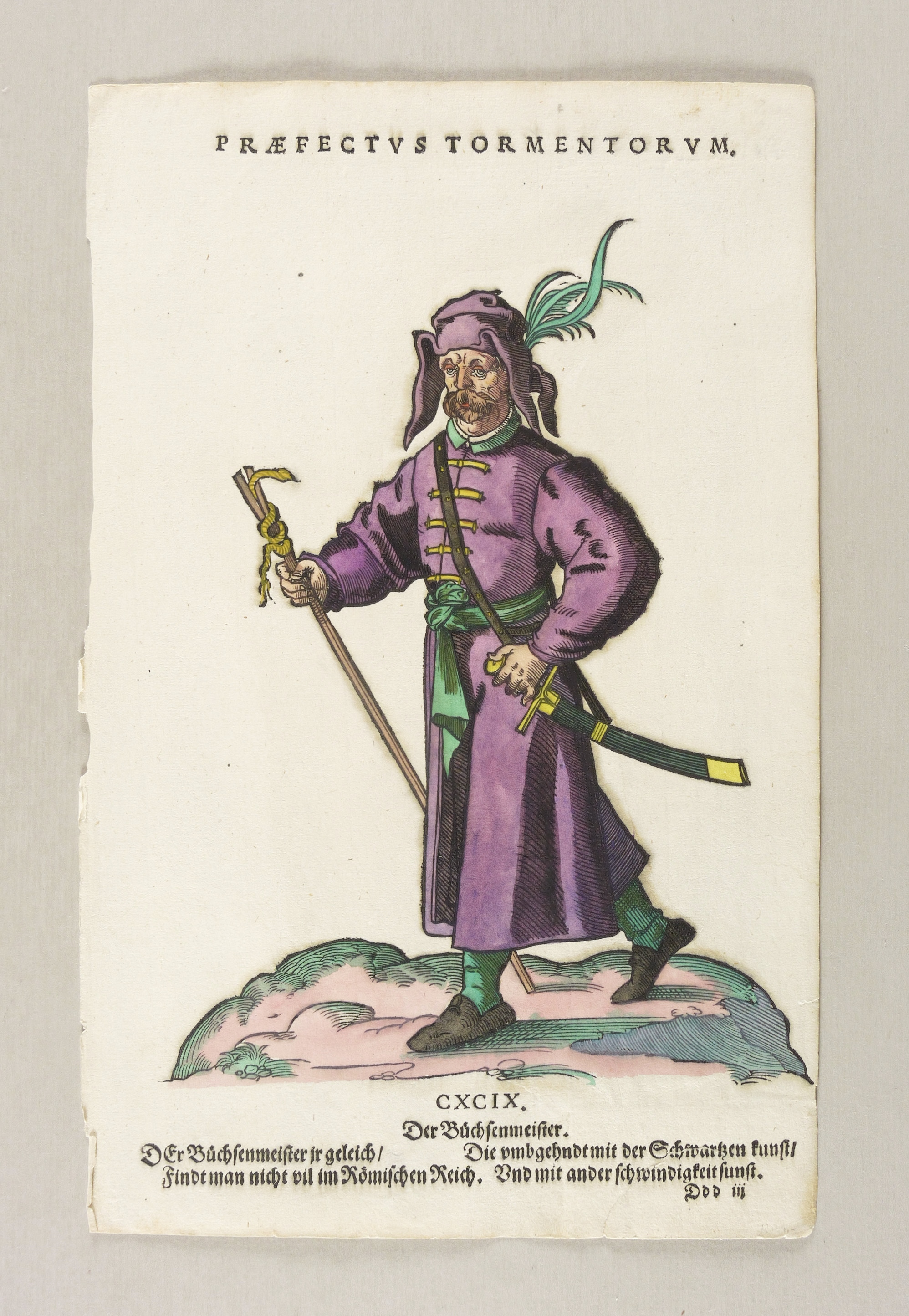 Aus: Habitus praecipuorum populorum. tam virorum quam fœminarum singulari arte depicti . Trachtenbuch: darin fast allerley und der fürnembsten Nationen, die heutigs tags bekandt sein, Kleidungen, beyde wie es bey Manns und Weibspersonen gebreuchlich, mit allem vleiß abgerissen sein, seh (Hans Weigel: Nürmberg 1577). – Oberhalb und unterhalb der Darstellung bezeichnet, zudem nummeriert: ″CXCIX.″ und mit Vierzeiler: ″Der Büchsenmeister ir gleich/ Findt man nicht vil im Römischen Reich. Die umbgehndt mit der Schwartzen kunst / Und mit ander schwindigkeit sunst.″ – Guter Zustand.