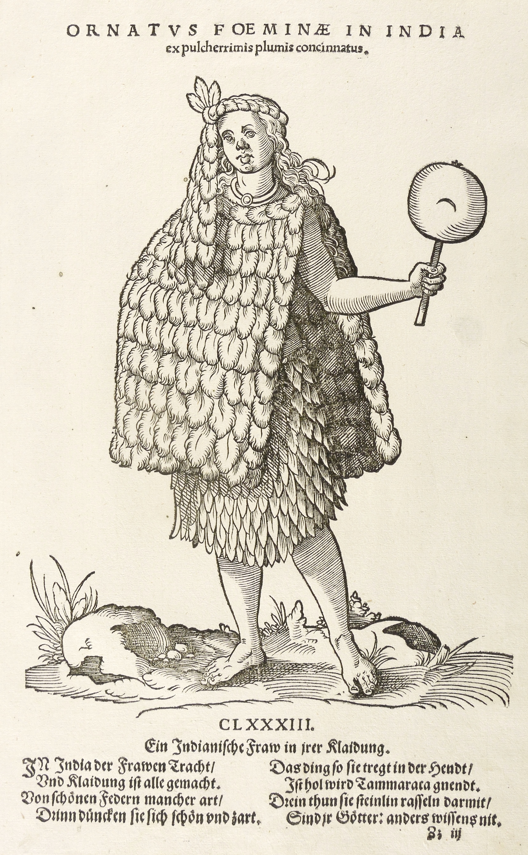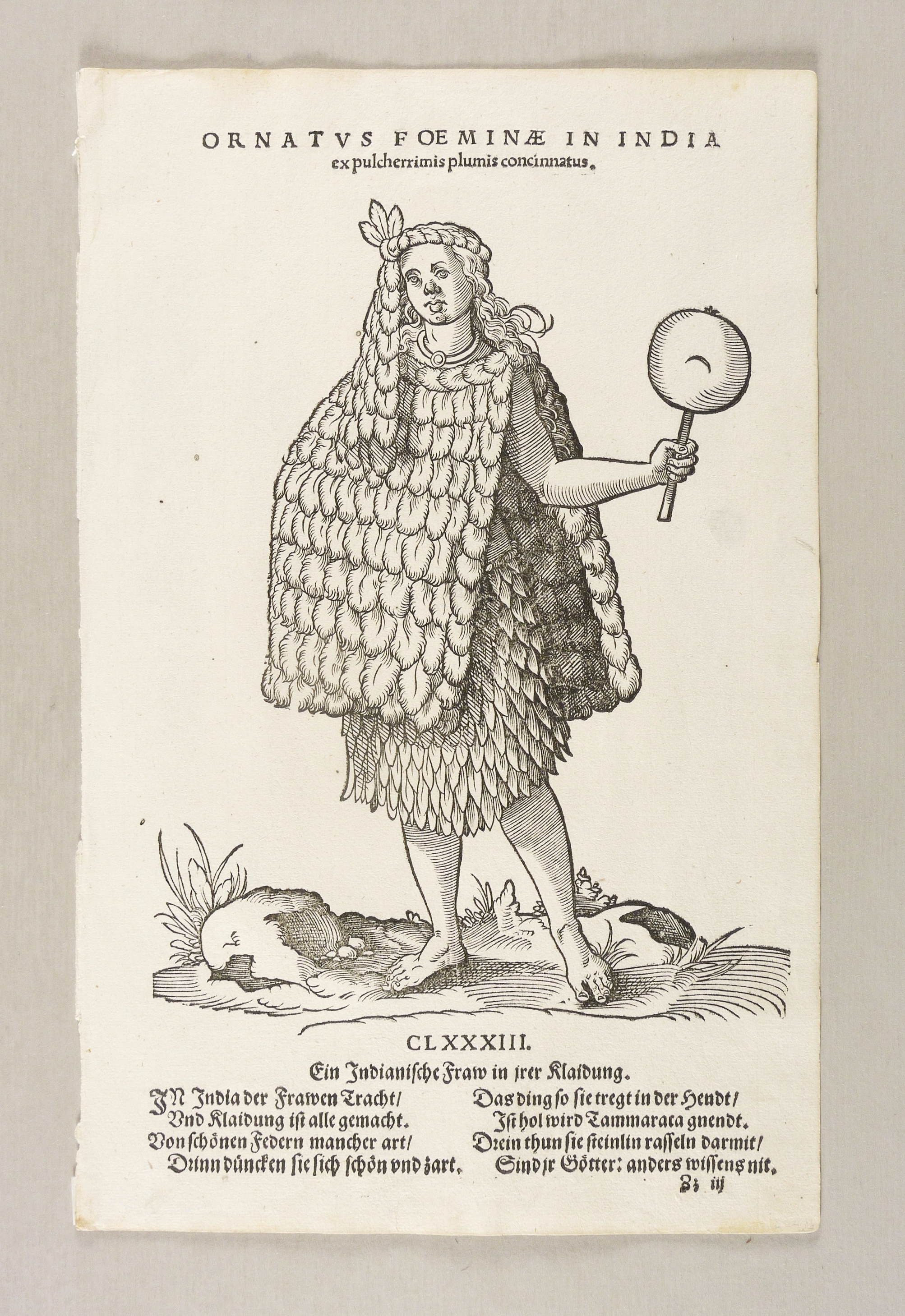 Aus: Habitus praecipuorum populorum. tam virorum quam fœminarum singulari arte depicti . Trachtenbuch: darin fast allerley und der fürnembsten Nationen, die heutigs tags bekandt sein, Kleidungen, beyde wie es bey Manns und Weibspersonen gebreuchlich, mit allem vleiß abgerissen sein, seh (Hans Weigel: Nürmberg 1577). – Oberhalb und unterhalb der Darstellung bezeichnet, zudem nummeriert: ″CLXXXIII.″ und mit Mehrzeiler: ″In India der Frawen Tracht / Und Klaidung ist alle gemacht. Von schönen Federn mancher art / Drinn düncken sie sich schön und zart. Das ding so sie tregt in der Hendt / Ist hol wird Tammaraca gnendt. Drein thun sie steinlin rasseln damit / Sind ir Götter: anders wissens nit.″ – Guter Zustand.