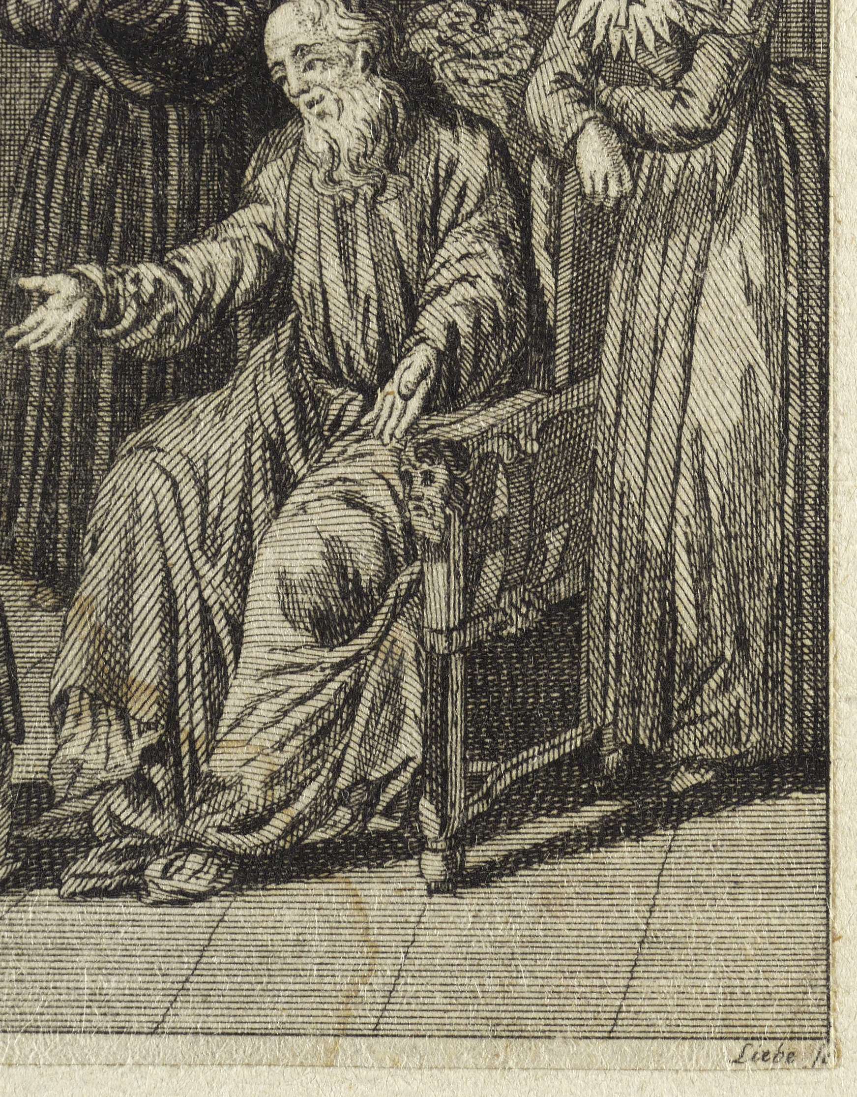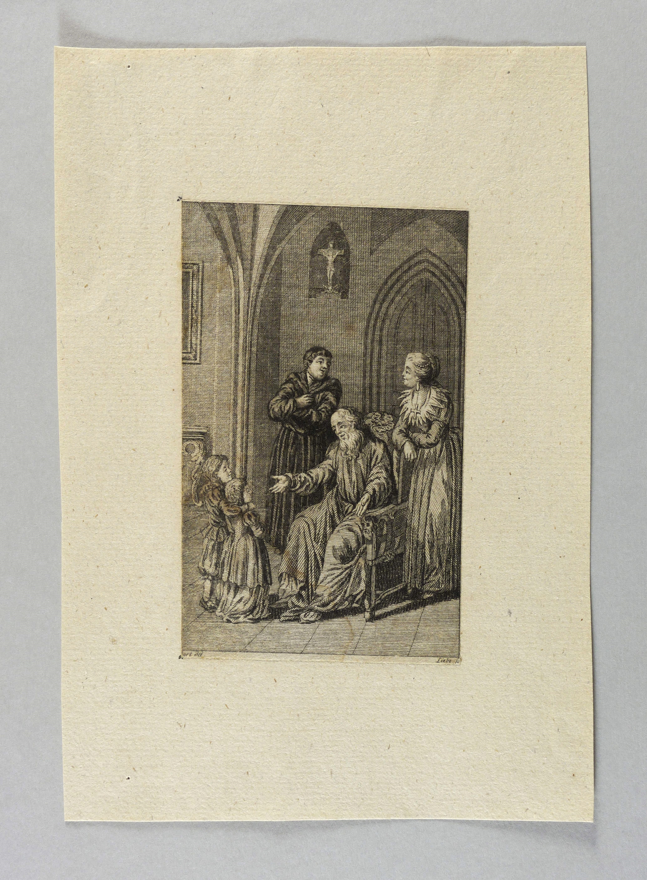 Aus: Christiane Benedikte Naubert, Hatto, Bischoff von Maynz. Eine Legende des zehnten Jahrhunderts (Leipzig: Weygandsche Buchhandlung 1789). – Rechts unten signiert: ″Liebe sc.″ – Blatt auf den Rand der Darstellung beschnitten und alt auf Trägerbütten (1824-54, Papiermühle Christian Friedrich Hempel in Stadtroda / Zeitzbach) montiert. Sonst guter Zustand.