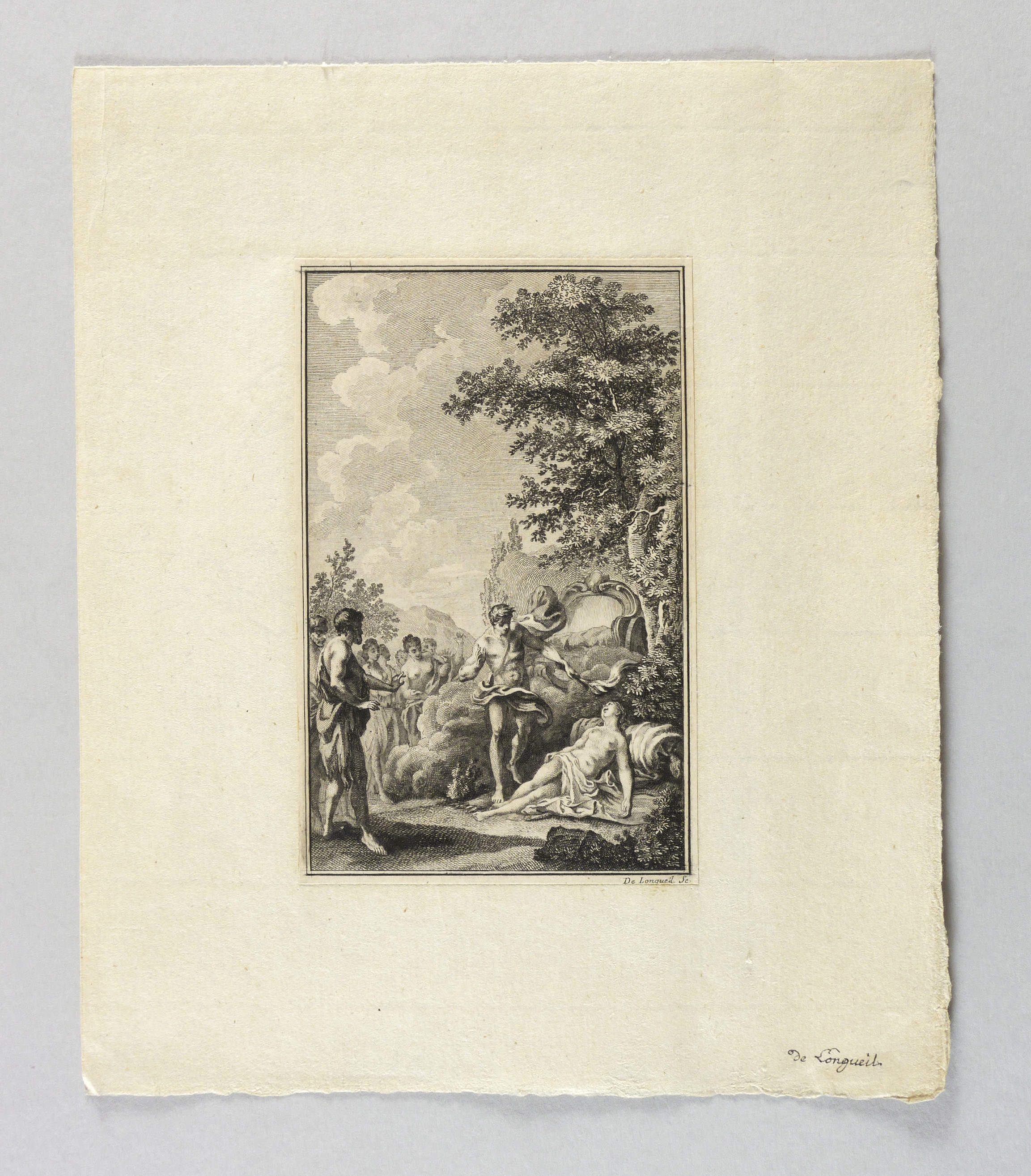Rechts unten signiert: ″De Longueil Sc″. – Blatt mit schmalem Rand um die Darstellung und alt auf Trägerbütten (1824-54, Papiermühle Christian Friedrich Hempel in Stadtroda / Zeitzbach) montiert. Sonst guter Zustand.