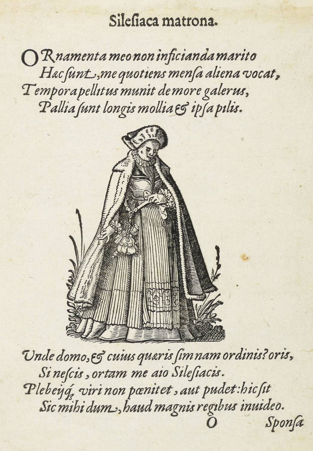 Aus: Franciscus Modius, Gynaeceum, Sive Theatrum mulierum. in quo praecipuarum omnium per Europam in primis, nationum, gentium, popularumque cuiuscumque dignitatis, ordinis, status ... foemineos habitus videre est (Frankfurt: Sigismund Feyerabend 1586). – Oberhalb der Darstellung bezeichnet und umgebender lateinischer Text. – Verso geringe Montagereste. Sonst guter Zustand.