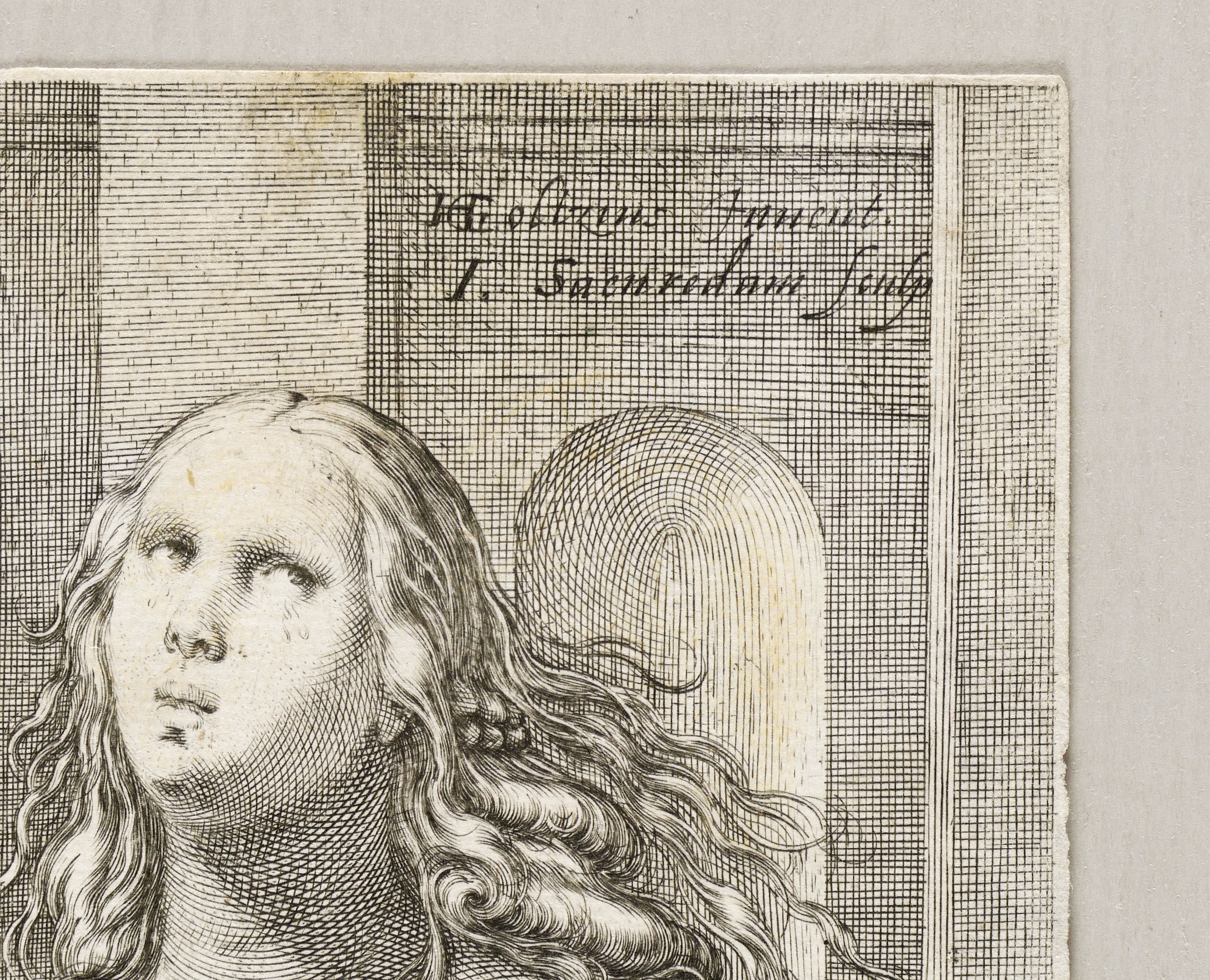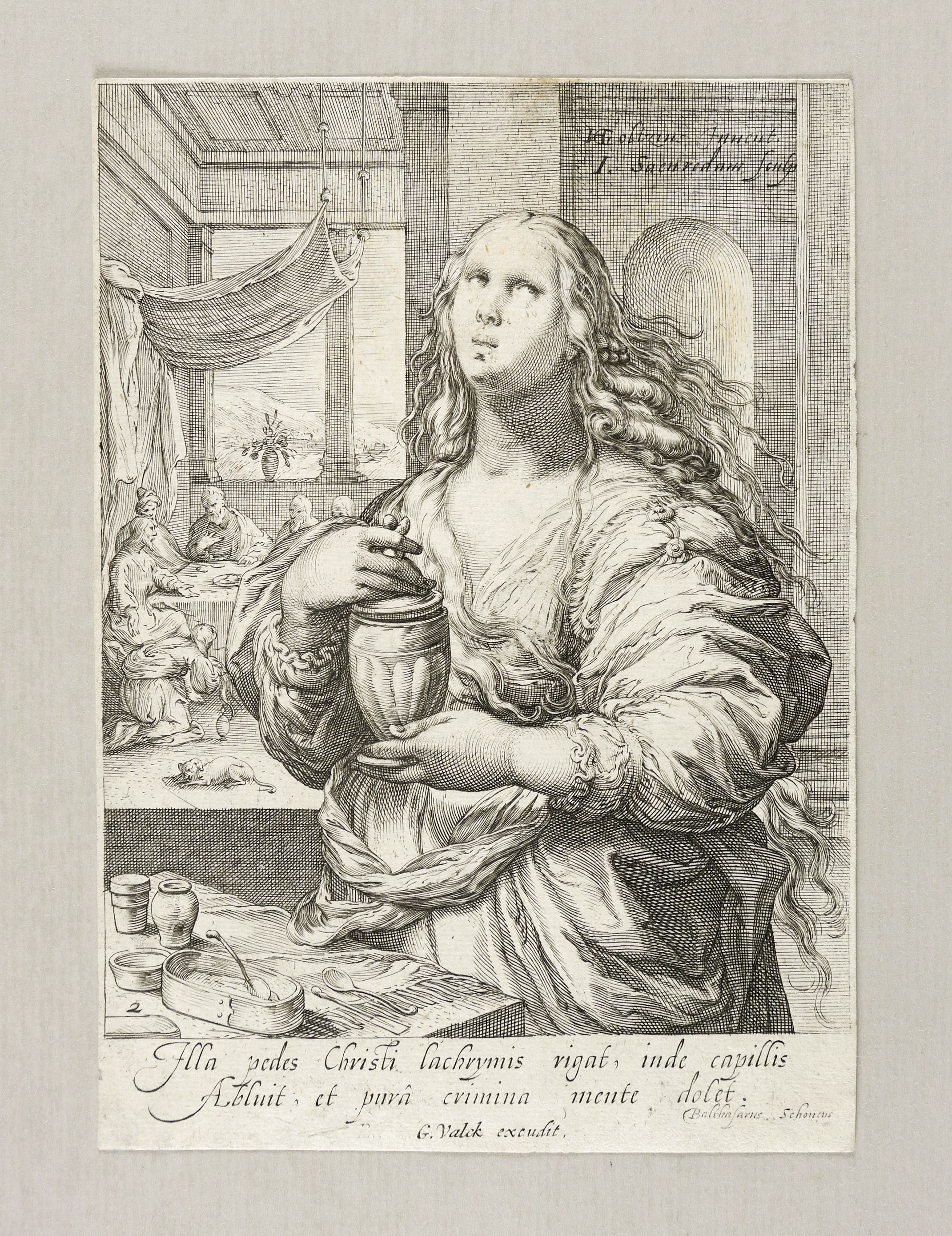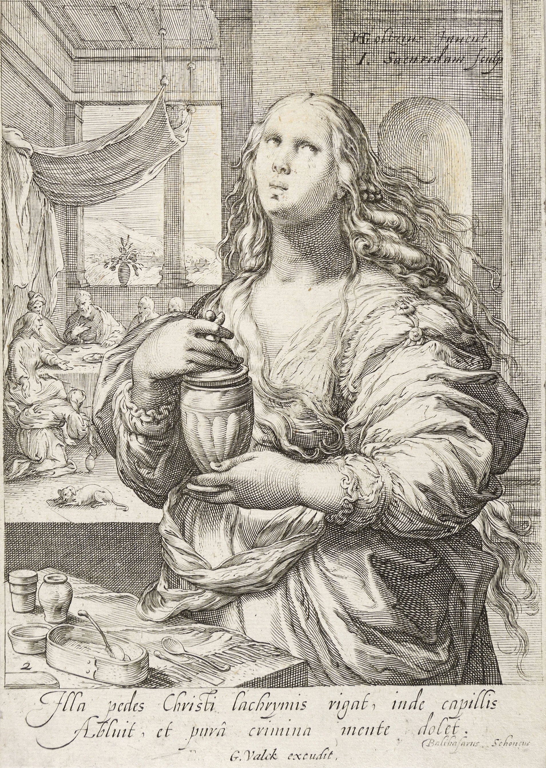 Saendram, Jan. – Maria Magdalena. – nach Goltzius. – „Illa pedes Christi lachrymis rigat, inde capillis | Abluit, et pura crimina mente dolet”.
