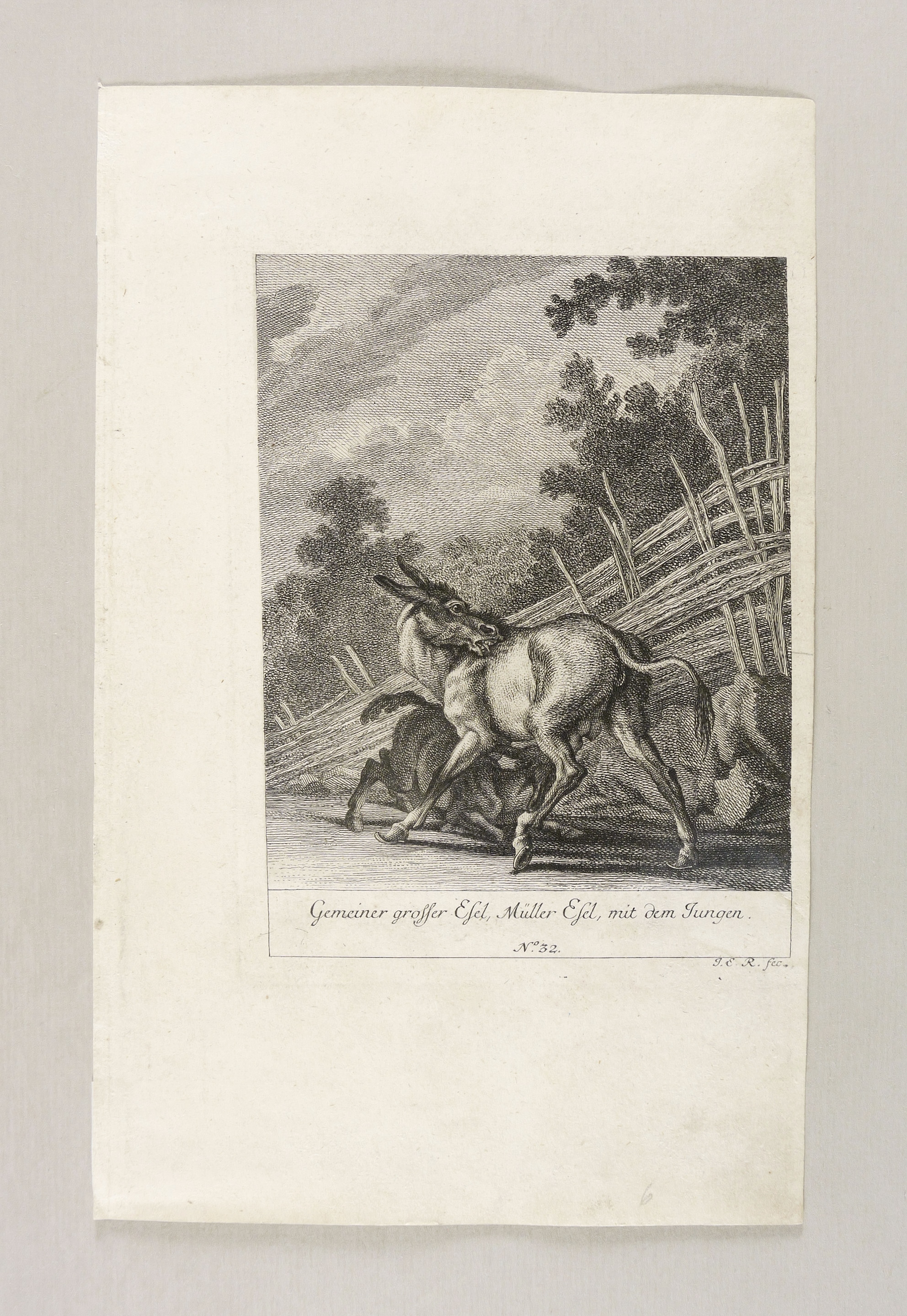Thienemann 512. – Aus: Entwurff einiger Thiere. wie solche nach ihren unterschiedenen Arten, Actionen und Leidenschafften, nach dem Leben gezeichnet, samt beygefügten Anmerckungen (Augsburg: Mahlern 1738-1754). – Rechts unten monogrammiert: ″J. E. R. fec.″ Unterhalb der Darstellung betitelt und nummeriert: ″N.o 32.″ – Blatt im unteren Rand schwach fingerfleckig. Sonst aber guter Zustand.