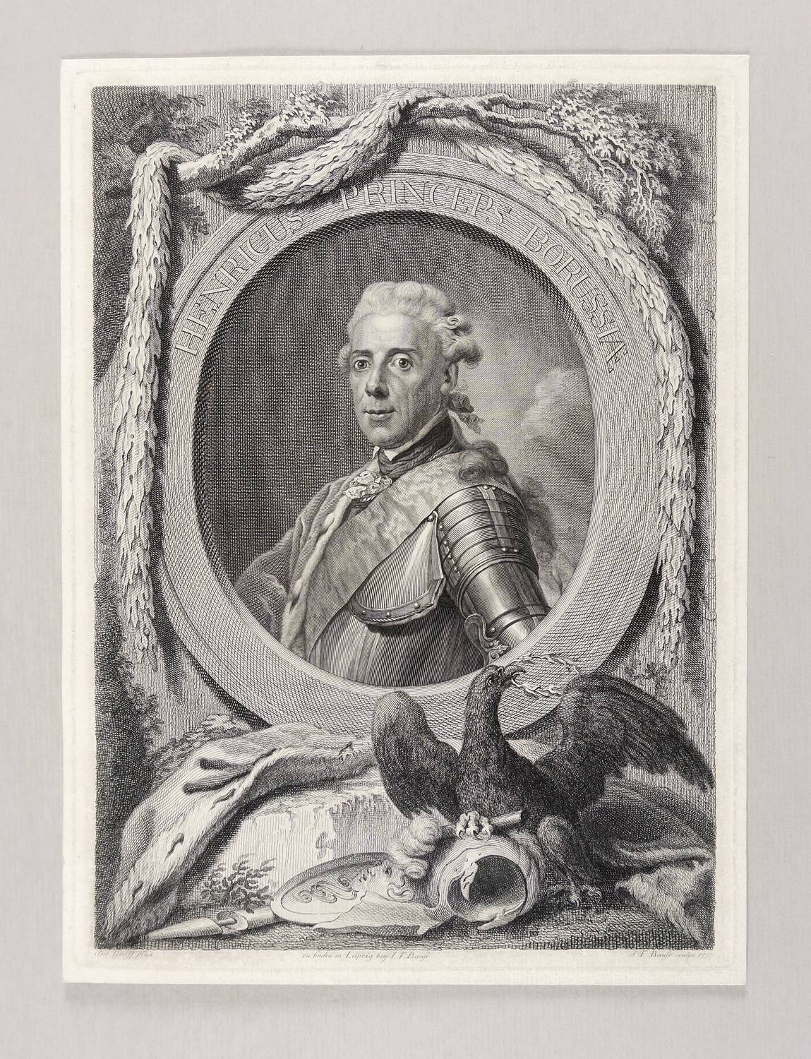 Rechts unten signiert: ″J. F. Bause sculps. 1779.″ In einem Oval innerhalb der Darstellung bezeichnet. Unterhalb der Darstellung Verlegeradresse. – Blatt mit schmalem Rand um die Platte. Sonst aber guter Zustand.