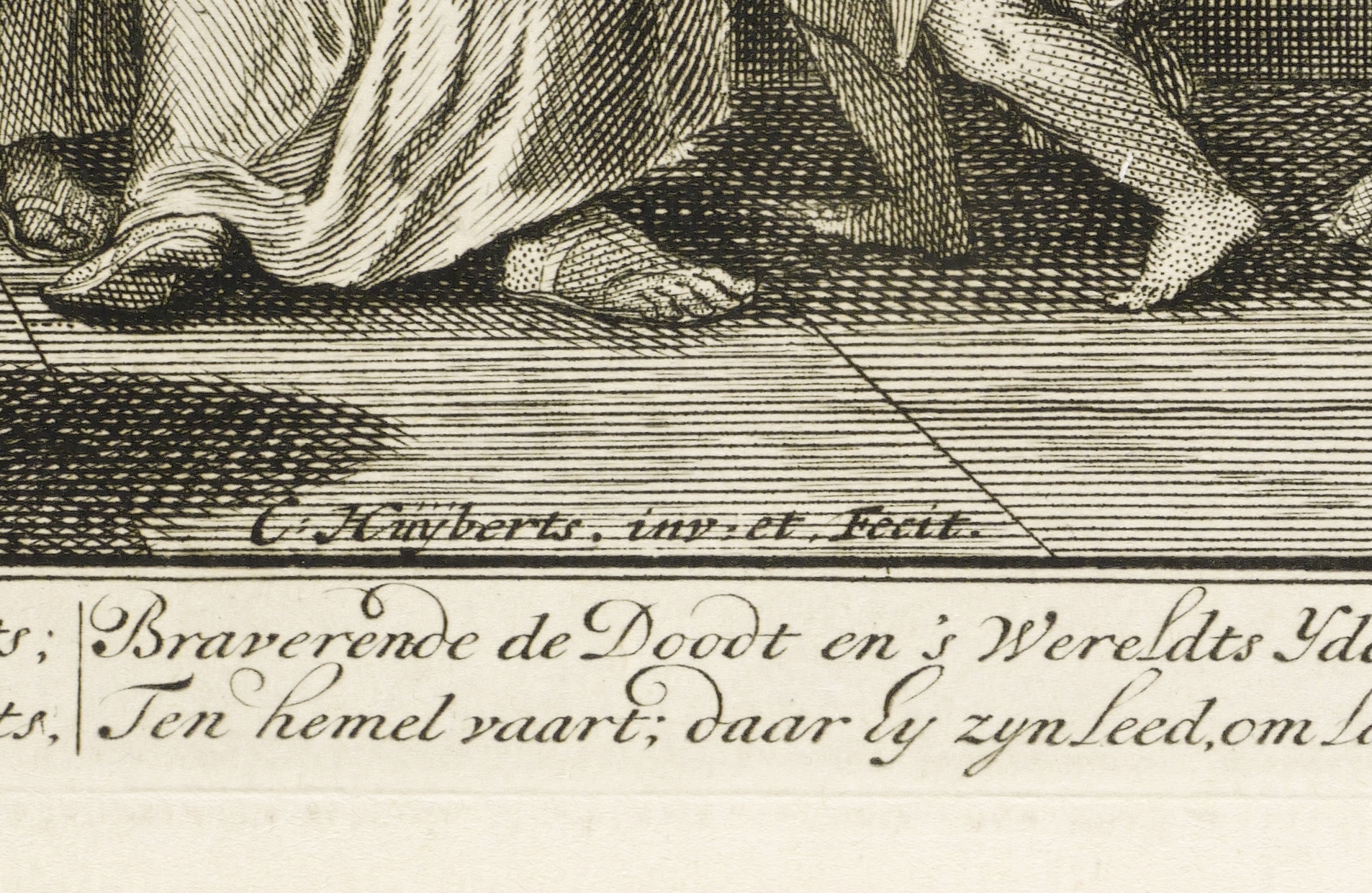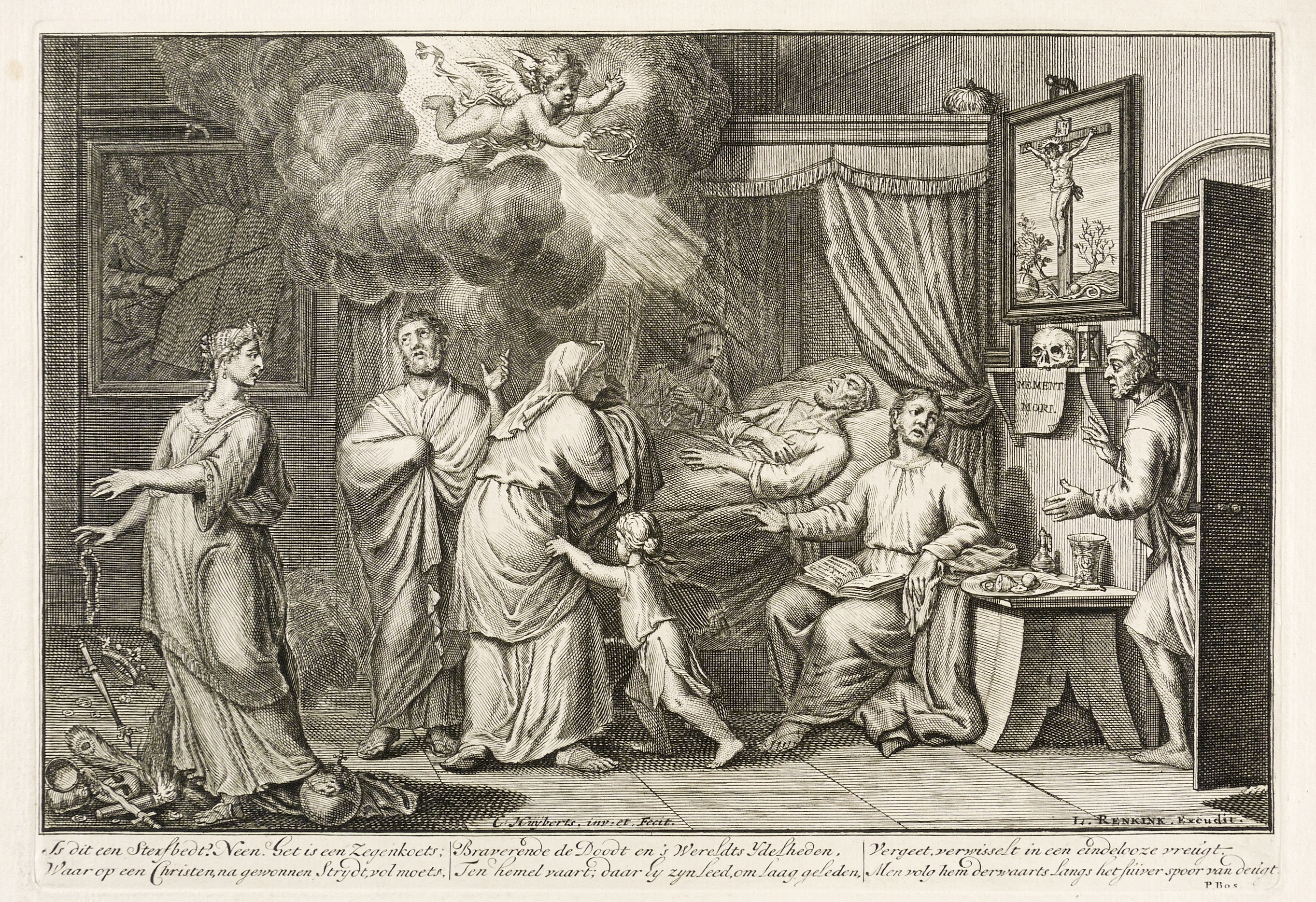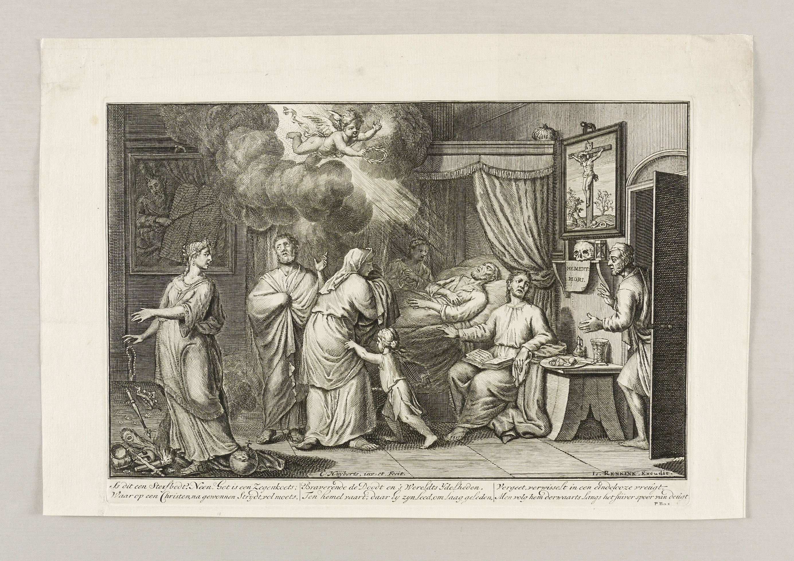 Unten mittig signiert: ″C. Huyberts. inv. et. fecit.″ Unterhalb der Darstellung niedrländischer Text:″Is dit een Sterfbedt. Neen. Het is een Zegenkoets; Waar op een Christen, na gewonnen Strydt, vol moets Braverende de Doodt en 's Wereldts Ydelheden, Ten hemel vaart; daar hy zyn leed, om laag geleden Vergeet, verwisselt in een eindelooze vreugt. Men volg hem derwaarts langs het suiver spoor van deugt.″ – Der dreispaltige Text von C. Bruin fehlt hier. – Verso mit geringen Montageresten. Sonst aber guter Zustand.