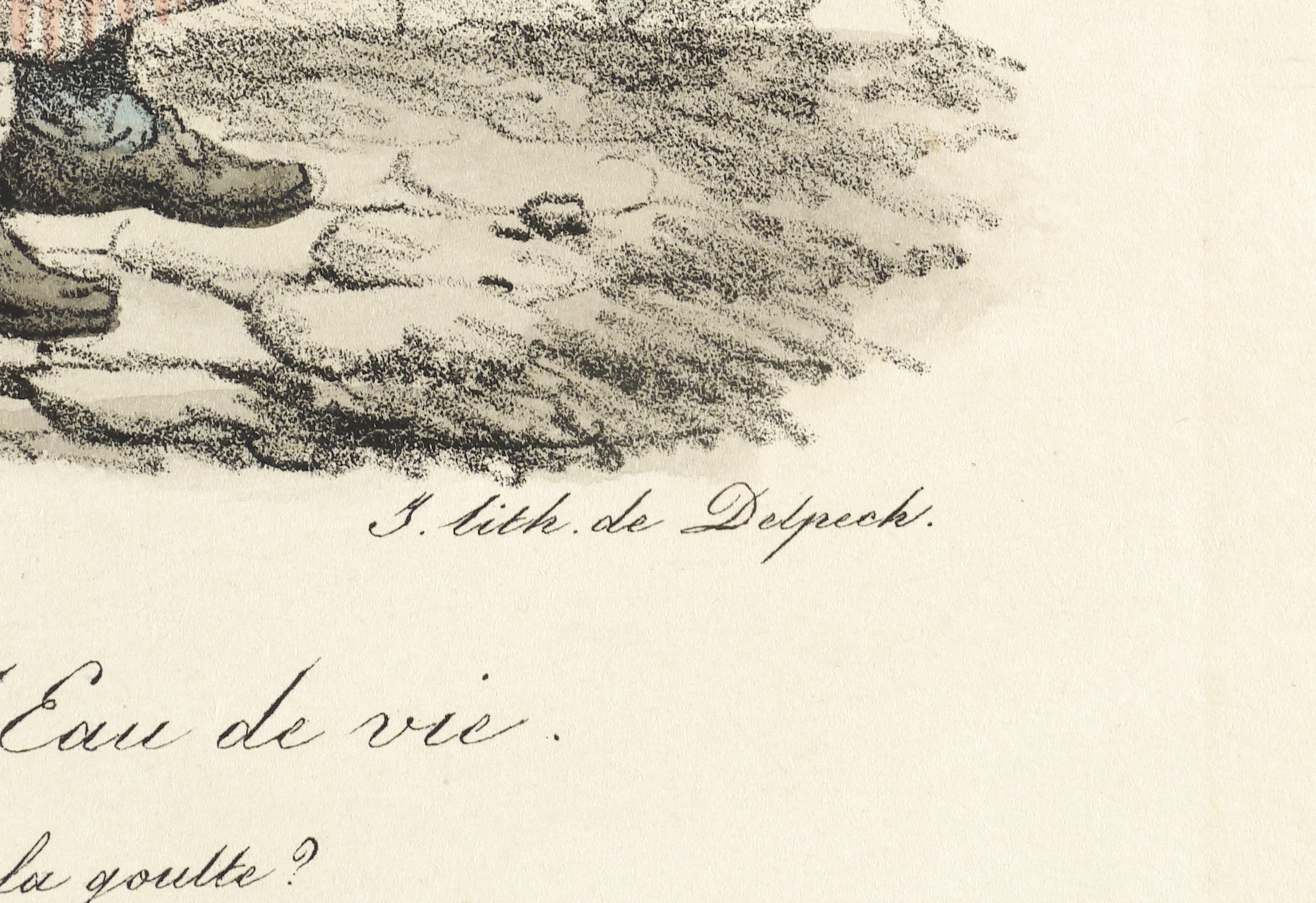 Rechts unten signiert: ″I. lith. de Delpech.″ Unterhalb der Darstellung französisch betitelt. – Blatt Nr.: 83 aus der Folge ″Rufe von Pariser Straßenhändlern″ – Blatt mit schwachem Lichtrand und kleinerem Einriss im linken Rand. Guter Zustand.