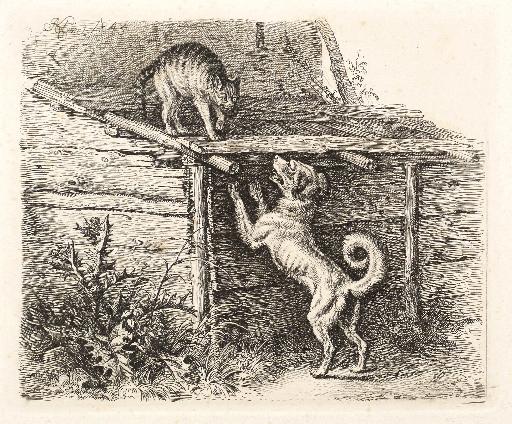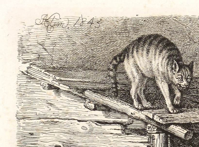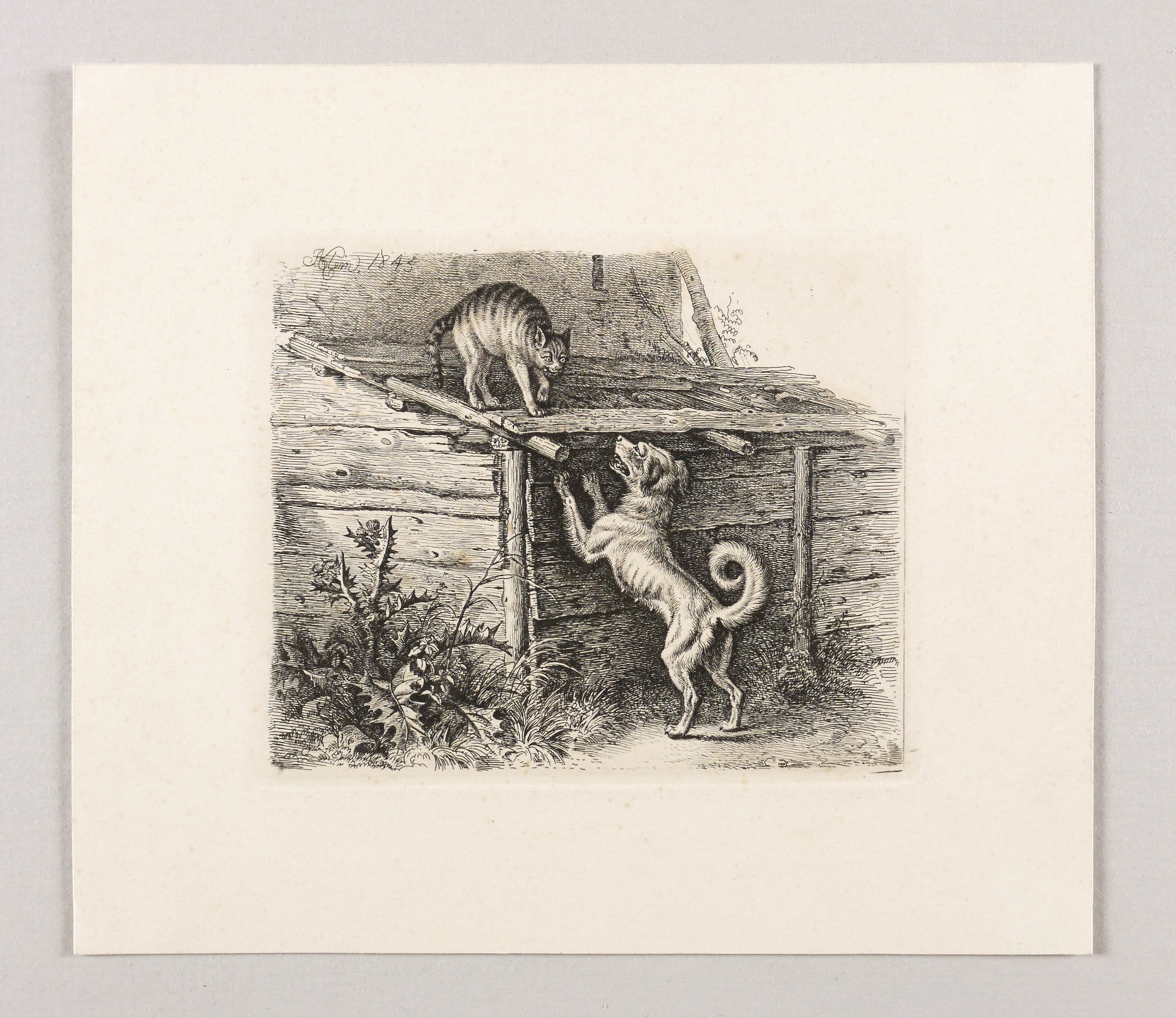 Jahn 340 II (von II). – In der Platte oben links signiert & datiert: ″JAKlein 1845″. Verso Sammlerstempel: ″Heymann″. – Bei Jahn beschrieben als: ″Die Katze auf dem Stall, von einer bellenden, in die Höhe gerichteten Hündin gestellt.″ – Schönes Exemplar. Verso etwas fleckig, wohl Abklatsch eines anderen Druckes. Sonst tadellos. Guter Zustand.