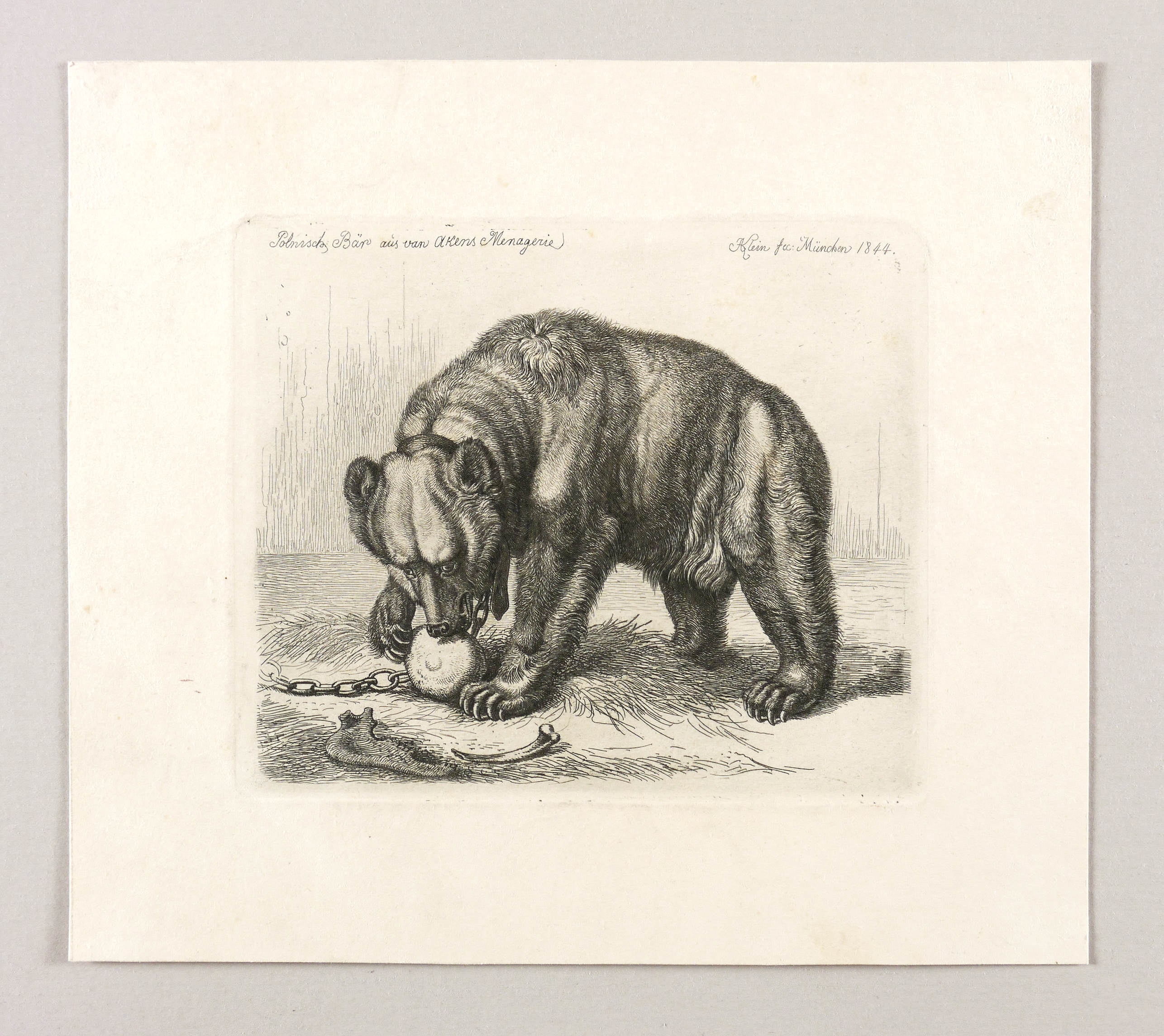 Jahn 332 III (von III). – In der Platte oben rechts signiert & datiert: ″JAKlein fec: München 1844.″ Links bezeichnet: ″Polnisch[er]: Bär aus van Akens Menagerie. – Durchgehend knickspurig. Verso etwas angestaubt. Mäßig guter Zustand.