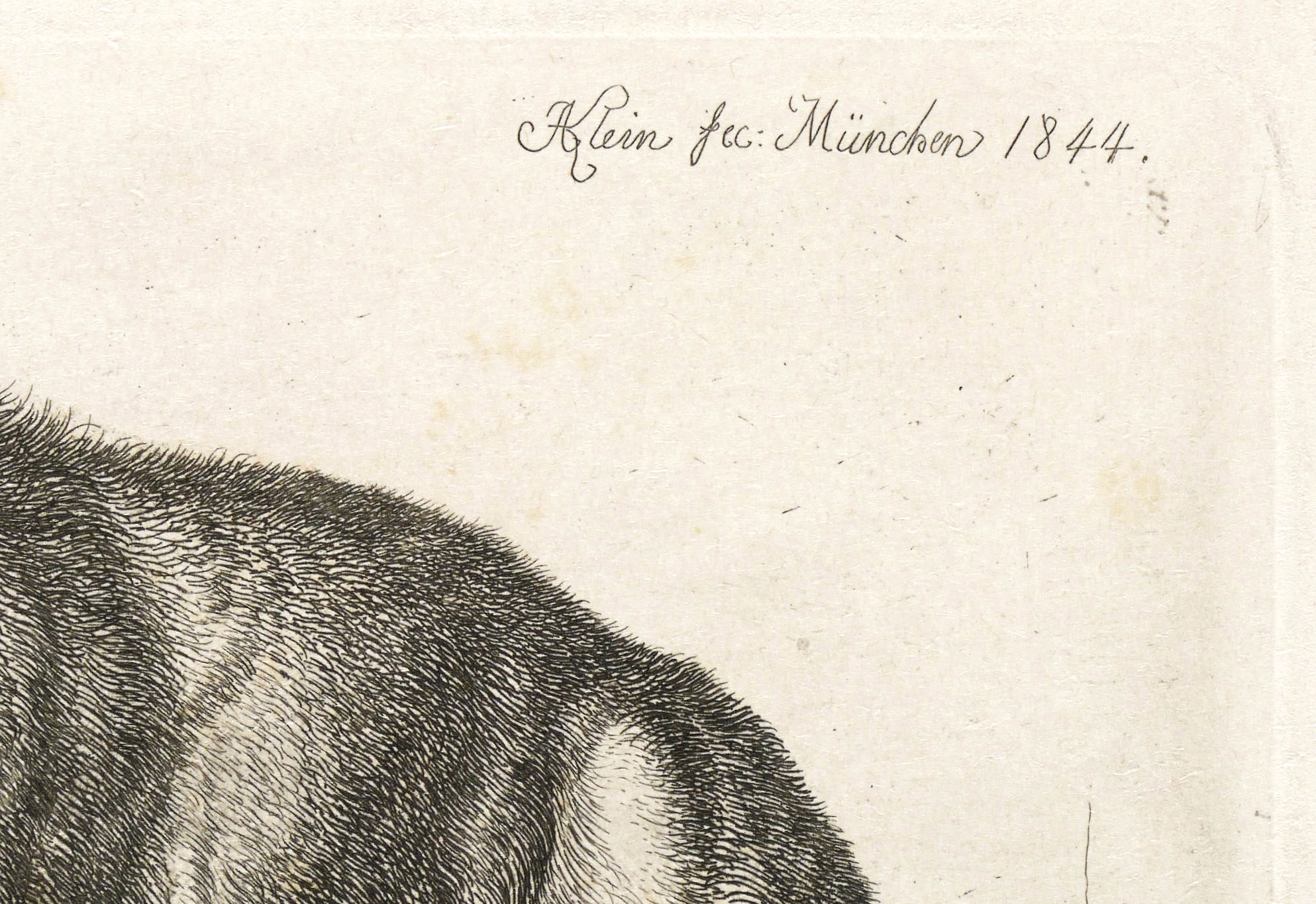 Johann Adam Klein (1792 Nürnberg - 1875 München). Deutscher Maler und Radierkünstler des Biedermeier. Erster Zeichenunterricht mit 8 Jahren bei dem Maler Georg Christoph von Bemmel. Ab 1805 Lehrling im Atelier des Kupferstechers Ambrosius Gabler. 1811 Schüler der von Gustav Philipp Zwinger geleiteten Nürnberger Zeichenschule. 1811-18 Studium an der Kunstakademie in Wien. Während einer Reise an Rhein und Main 1815 Begegnung mit dem Werk des Malers Wilhelm von Kobell. 1818 Reise ins Salzkammergut mit Johann Christoph Erhard, den Brüdern Friedrich Philipp und Heinrich Reinhold und Ernst Welker. 1819/20 Italienaufenthalt. 1839 Umsiedelung nach München und Heirat der Tochter des Kupferstechers Wolf. Mit seinen zahlreichen Tierstücken zählt Klein zu den wichtigsten Radierkünstlern des frühen 19. Jahrhunderts.