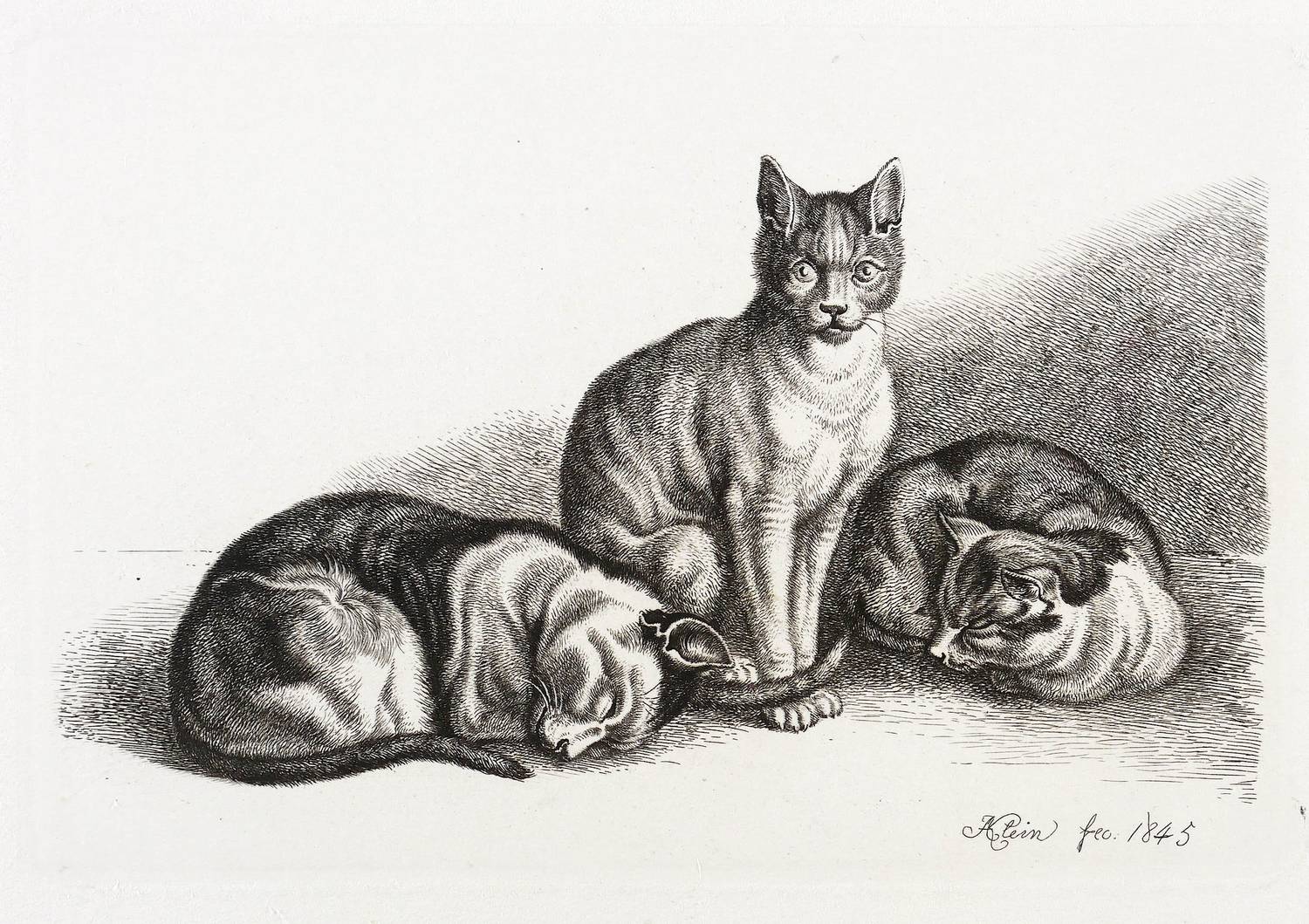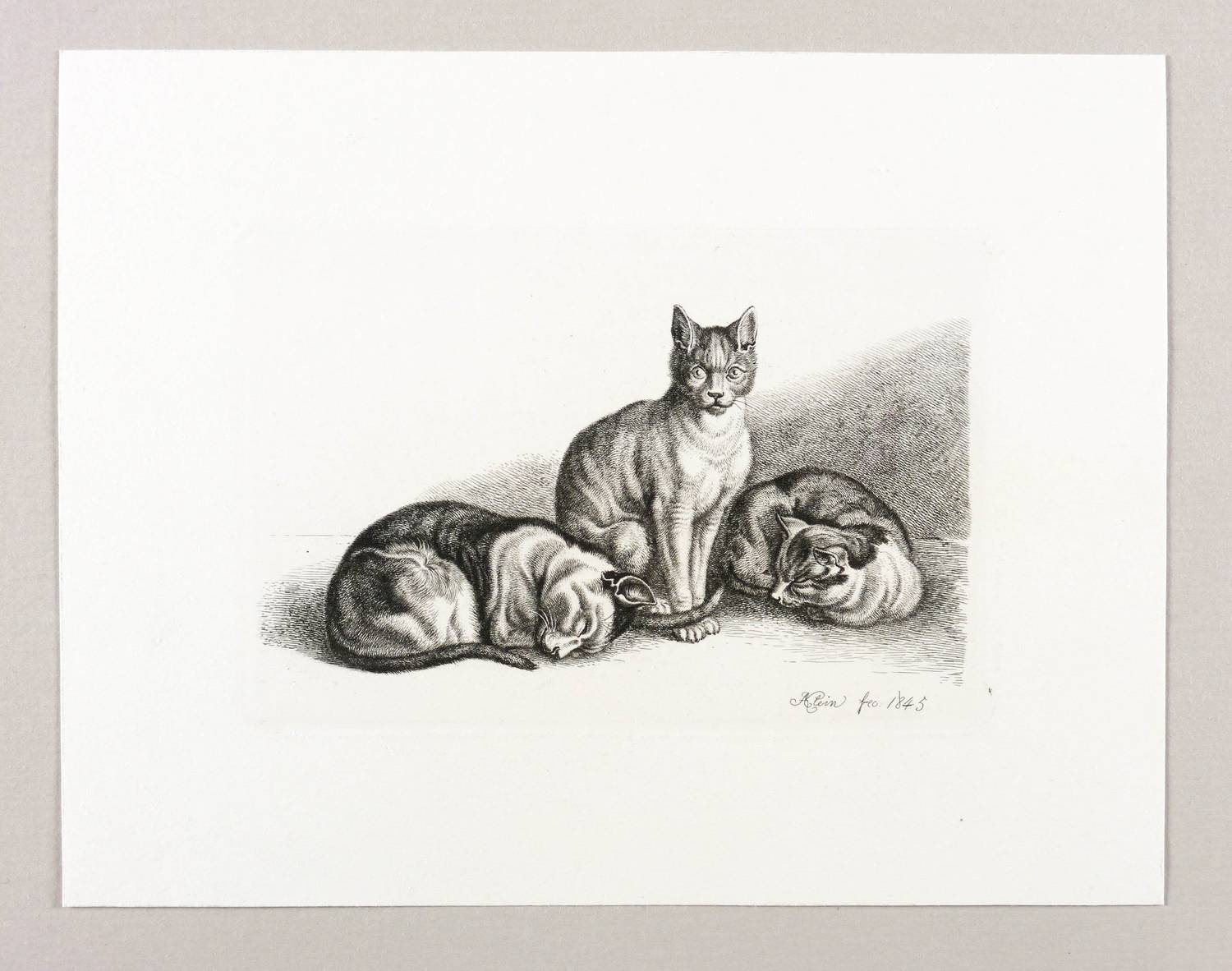 Jahn 339 II (von II). – In der Platte rechts unten signiert und datiert: "JAKlein fec. 1845". Verso Sammlerstempel: "Heymann" (nicht bei Lugt). – Bei Jahn beschrieben als: "Die mittlere sitzt aufrecht zwischen den beiden anderen, welche am Boden schlafen." - Selten. – Schönes Exemplar. Ohne Mängel. Sehr guter hervorragender Zustand.