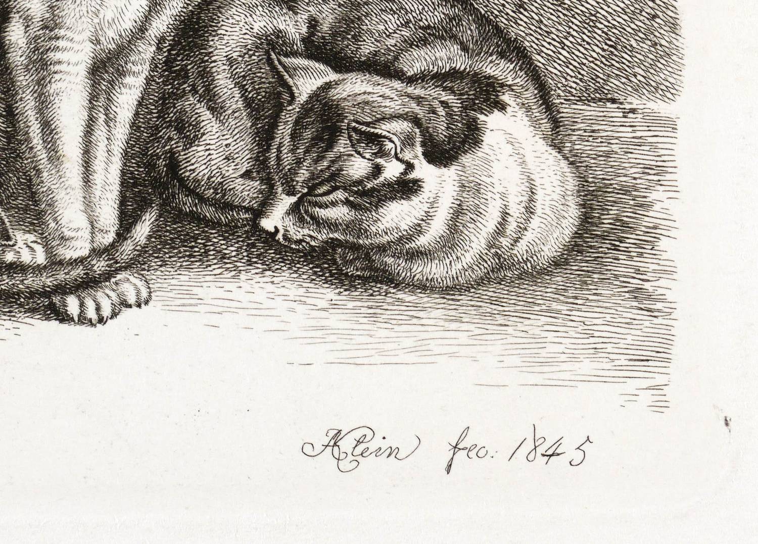 Johann Adam Klein (1792 Nürnberg - 1875 München). Deutscher Maler und Radierkünstler des Biedermeier. Erster Zeichenunterricht mit 8 Jahren bei dem Maler Georg Christoph von Bemmel. Ab 1805 Lehrling im Atelier des Kupferstechers Ambrosius Gabler. 1811 Schüler der von Gustav Philipp Zwinger geleiteten Nürnberger Zeichenschule. 1811-18 Studium an der Kunstakademie in Wien. Während einer Reise an Rhein und Main 1815 Begegnung mit dem Werk des Malers Wilhelm von Kobell. 1818 Reise ins Salzkammergut mit Johann Christoph Erhard, den Brüdern Friedrich Philipp und Heinrich Reinhold und Ernst Welker. 1819/20 Italienaufenthalt. 1839 Umsiedelung nach München und Heirat der Tochter des Kupferstechers Wolf. Mit seinen zahlreichen Tierstücken zählt Klein zu den wichtigsten Radierkünstlern des frühen 19. Jahrhunderts.