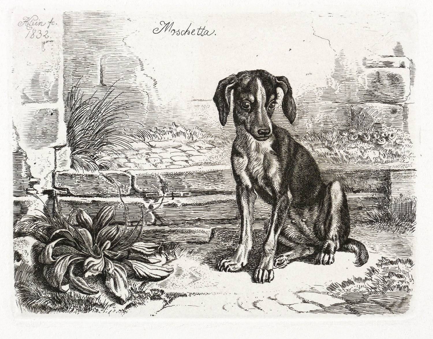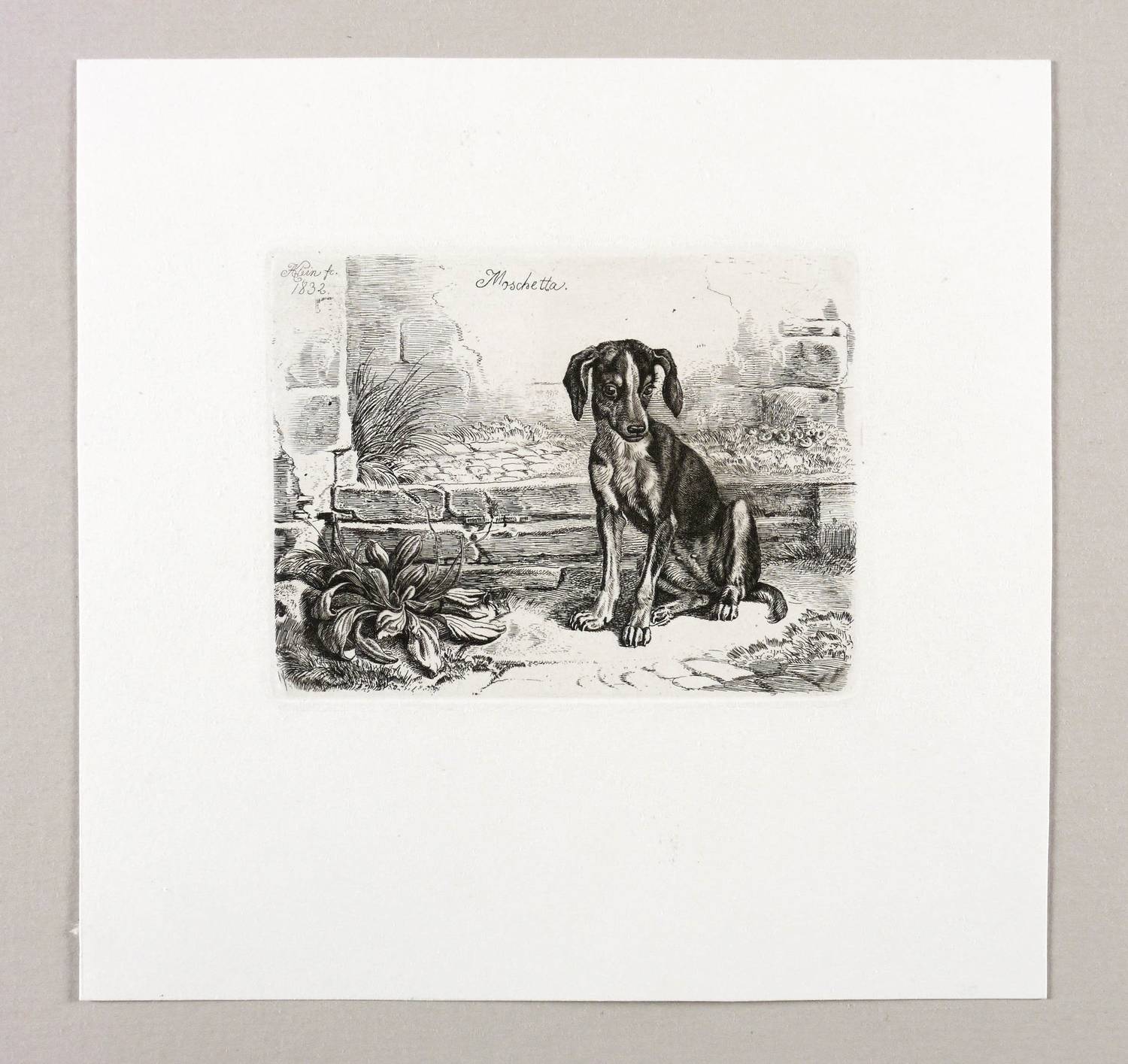 Jahn 299 III (von III). – In der Platte oben links signiert & datiert, mittig oben betitelt. – Bei Jahn beschrieben: ″Nach links sitzende Hündin etwas von vorn gesehen, mit herabhängenden Ohren, heller Brust und Stirn. Hinter derselben drei Treppenstufen vor einer gepflasterten Fläche, über welcher eine Wand sich erhebt. Links eine grossblättrige Pflanze.″ - Aus der ″Folge von sechs Blatt Hunden″, die der Künstler 1832 im Eigenverlag herausgab. – Gutes Exemplar. Sehr guter Zustand.