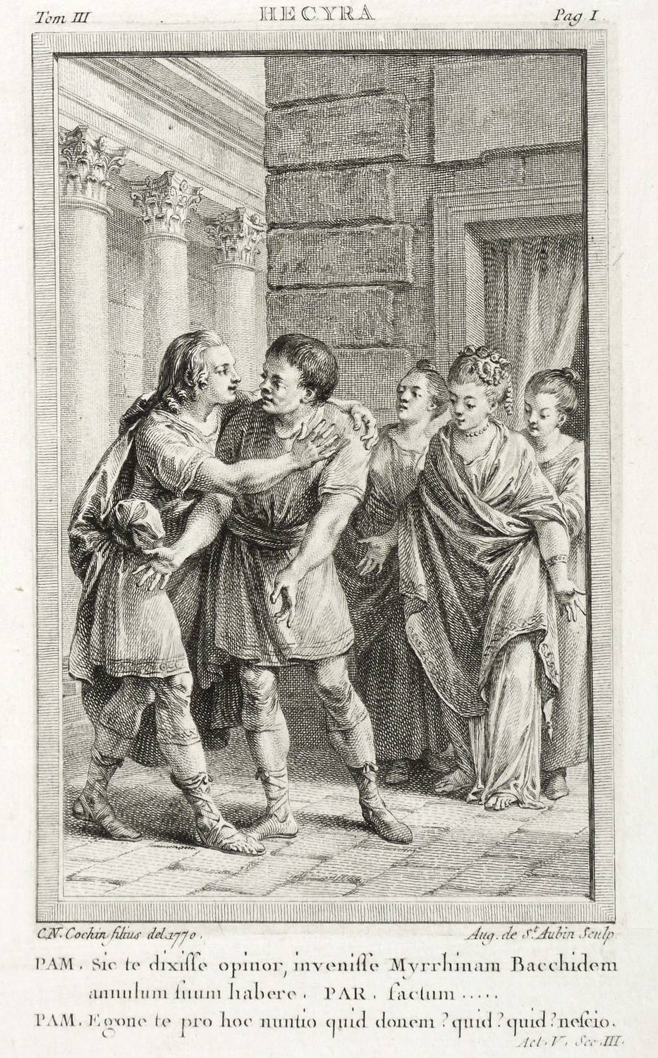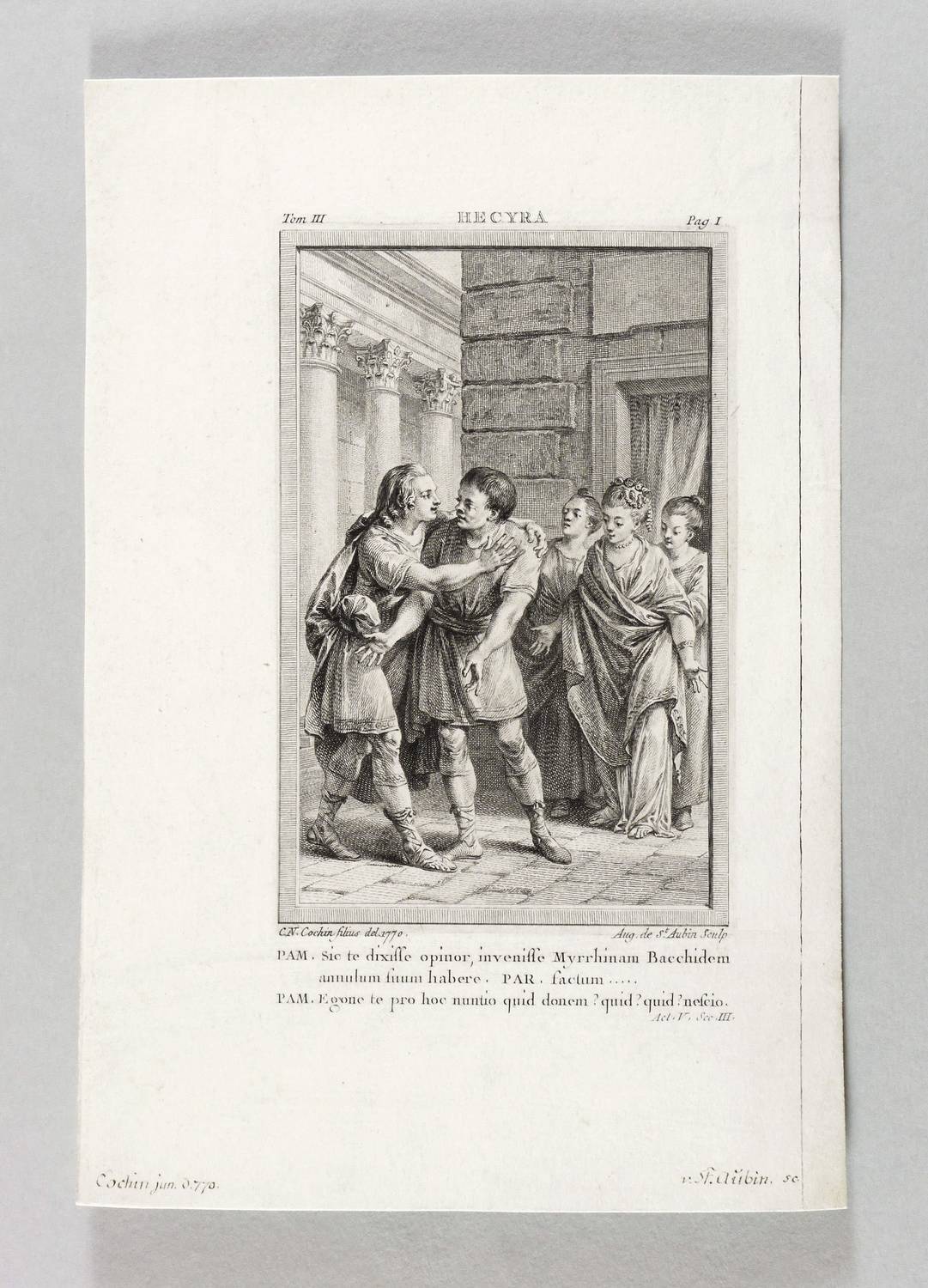In der Platte rechts unten signiert: ″Aug. de St. Aubin Sculp.″ Links bezeichnet: ″C.N. Cochin filius del. 1770.″ Oben bezeichnet: ″HECYRA″. – Sehr guter Zustand.