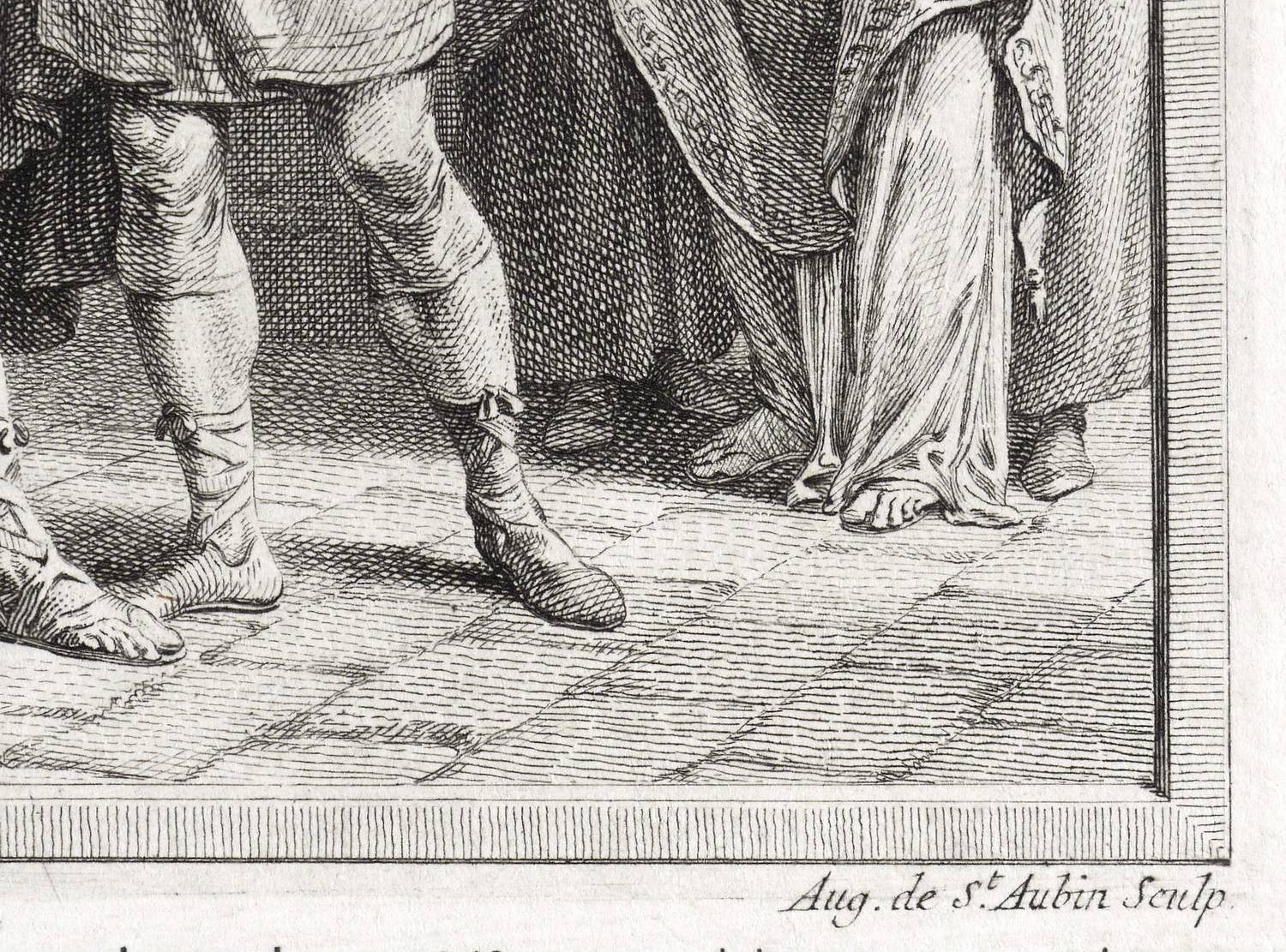 Augustin de Saint-Aubin (1736 Paris - 1807 Paris). Französischer Zeichner und Kupferstecher. Ausbildung bei seinem Bruder Charles Germain de Saint-Aubin. Später Studium bei Étienne Fessard, Nicolas-Henry Tardieu und Laurent Cars. 1752 mit einer Radierung im Salon vertreten. Zahlreiche Aufträge für Exlibris, Frontispiz, Einladungen, Programme und andere kommerzielle Grafik. Dazu Illustrationen für Editionen, wie das "Decameron" von Boccaccio. 1776 zum offiziellen Kupferstecher der Bibliothèque Royale ernannt.