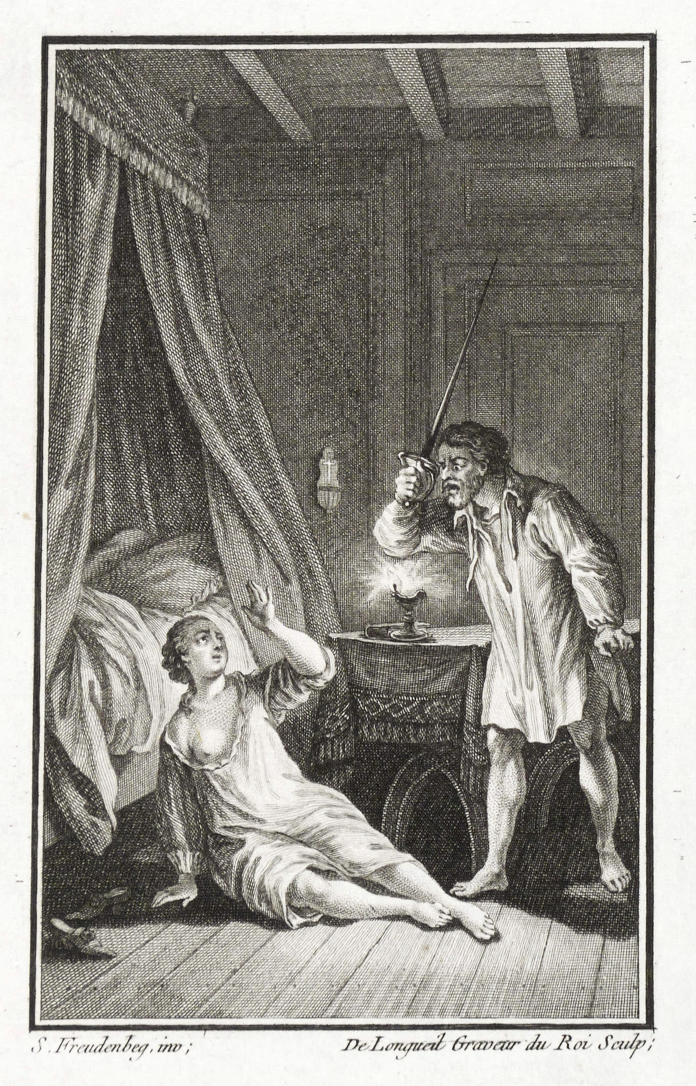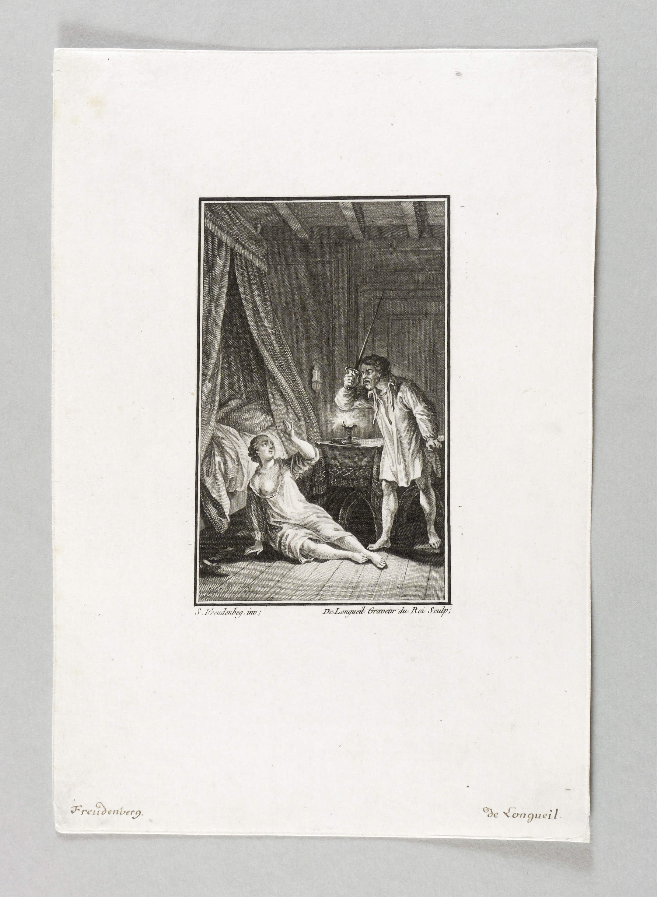 Aus: Margarete von Navarra, Les nouvelles. Heptaméron français (Bern: Walthard & Nouvelle Société Typographique 1780/1781), Bd. 1-3. – In der Platte rechts unten signiert: ″De Longueil Graveur du Roi Sculp.″ In den Blattecken unten in brauner Feder nochmals bezeichnet: ″Freudenberg // de Longueil.″ – Illustration zur reichlich illustrierten ersten Berner Ausgabe des ″Heptaméron″ von Margarete von Navarra. – Sehr guter Zustand.