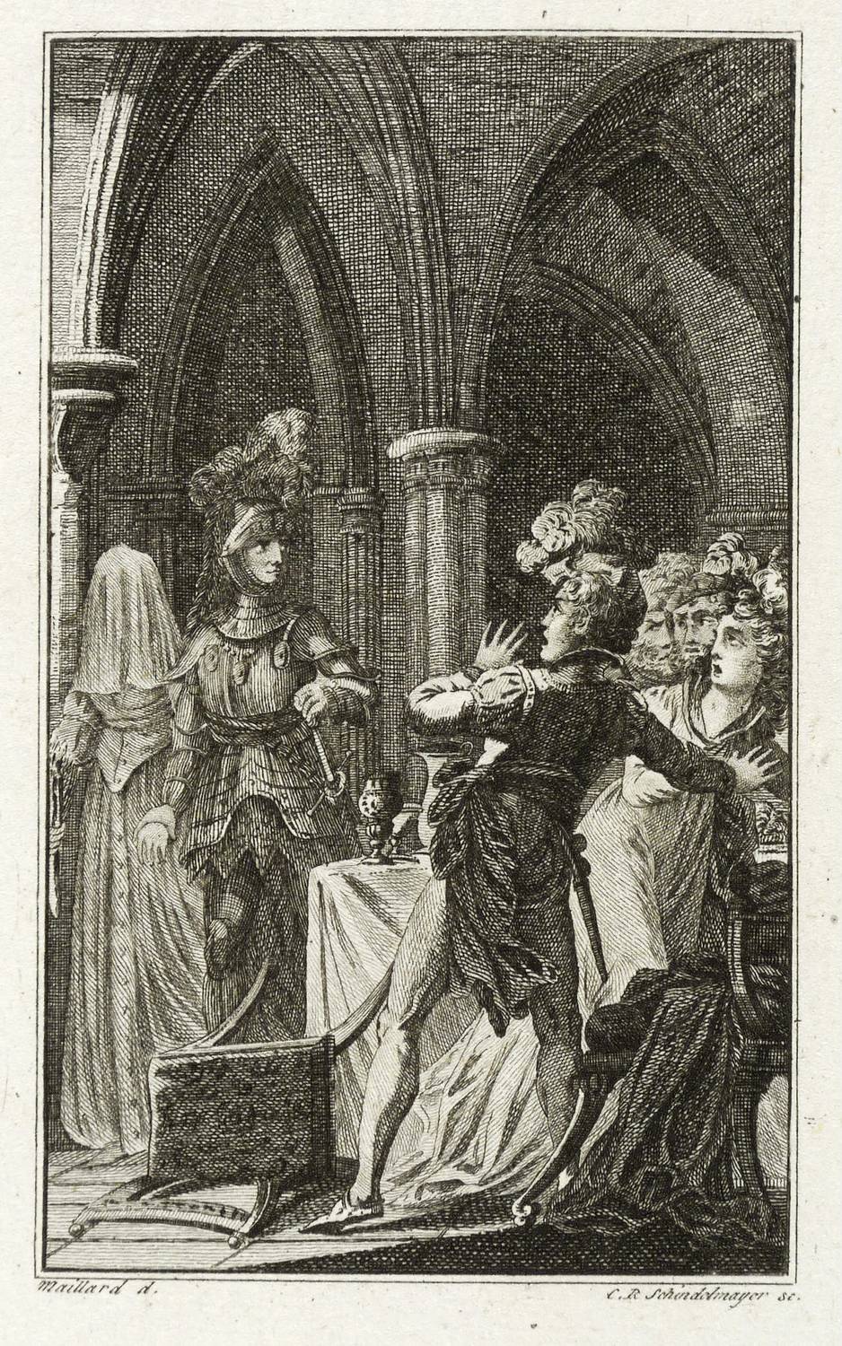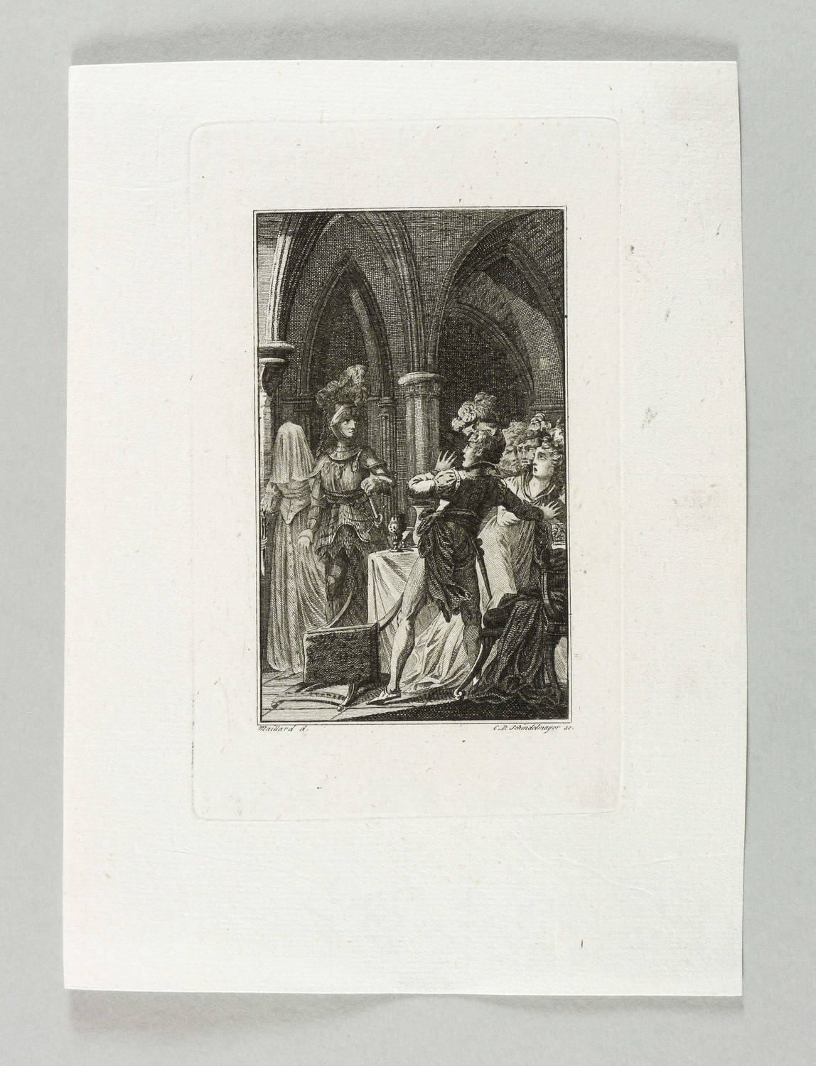Aus: Maria Clementine Spieß, Das Schloß Blandford und seine Bewohner (Leipzig: Verlag der Jos. Poltischen Buchhandlung 1801). – In der Platte rechts unten signiert: "C.R. Schindelmayer sc." Links bezeichnet: "Maillard d." – Sehr guter Zustand.