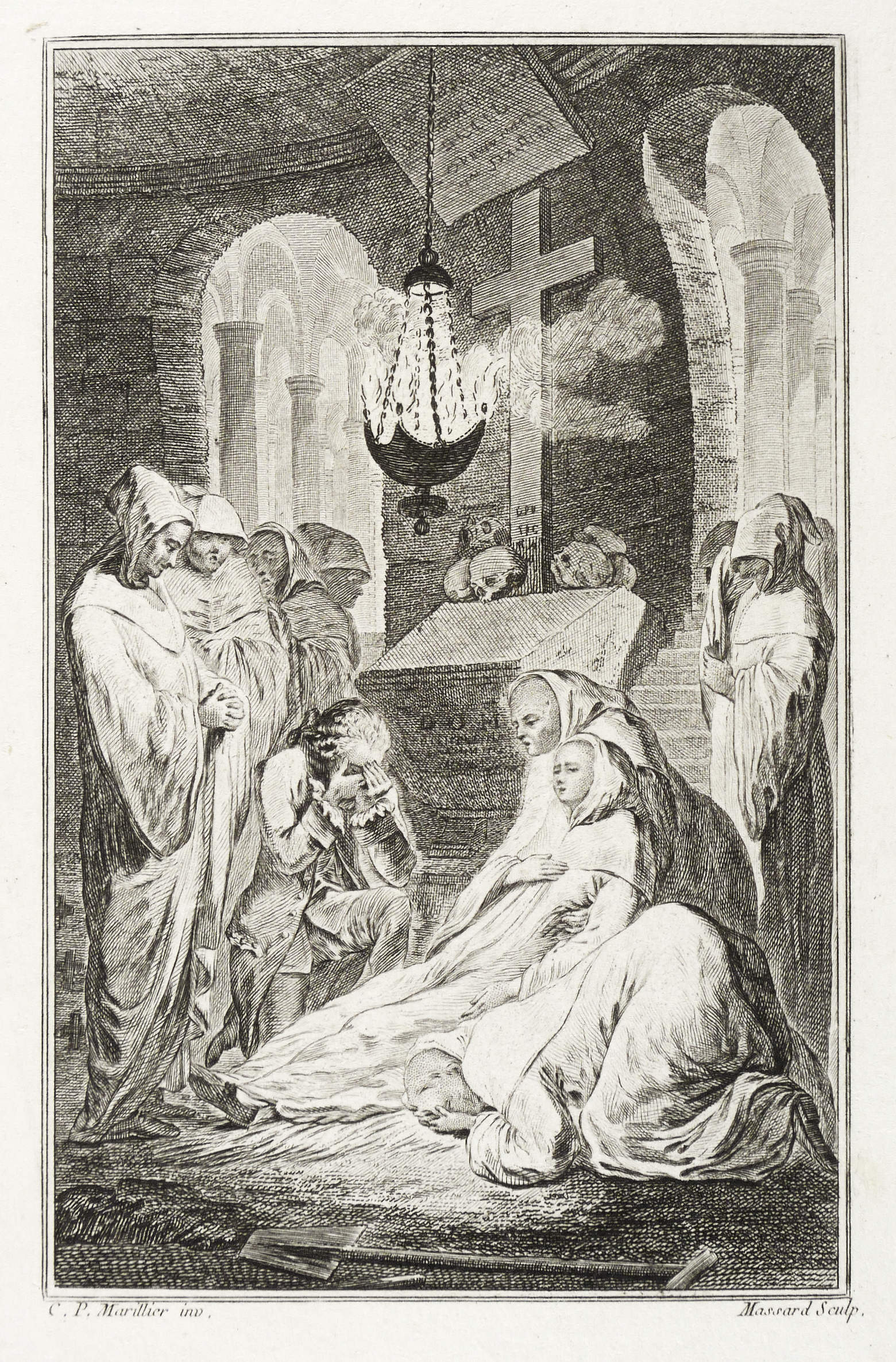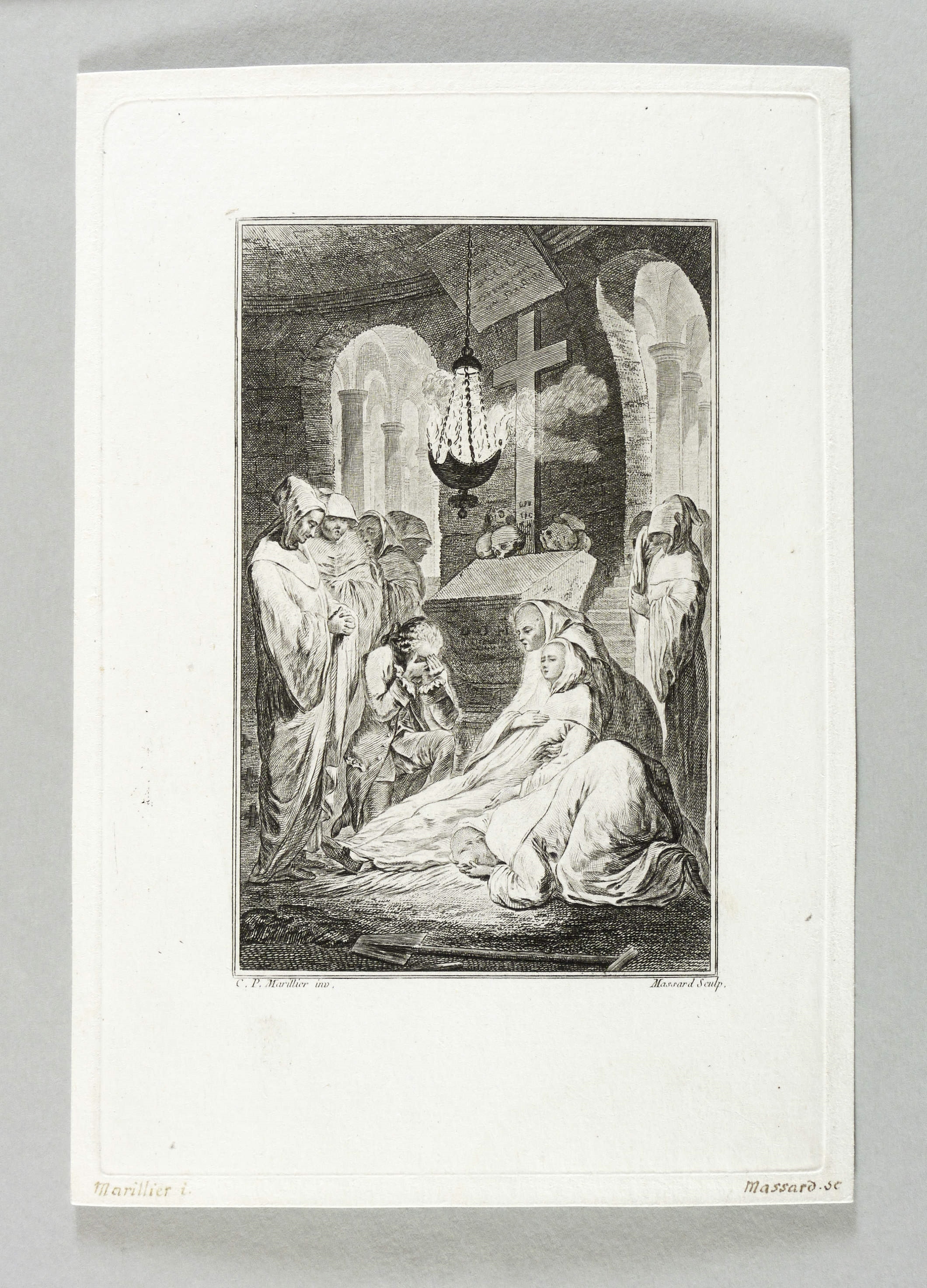 Aus: François-Thomas-Marie de Baculard d’Arnaud, Le comte de Comminge, ou Les amans malheureux (Paris: Le Jay 1768). – In der Platte rechts unten signiert: ″Massard Sculp.″ Links bezeichnet: ″C.P. Marillier inv.″ In den Blattecken unten in brauner Feder bezeichnet: ″Marillier i. / Massard sc.″ – Schmaler Rand um die Platte. Sehr guter Zustand.