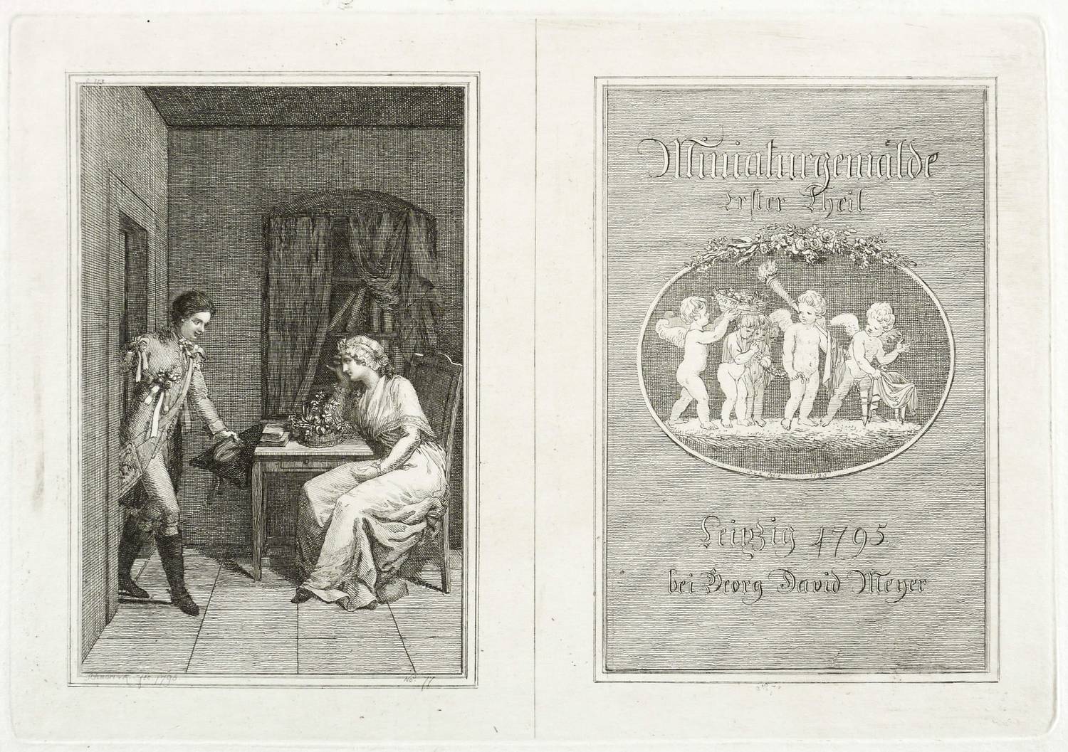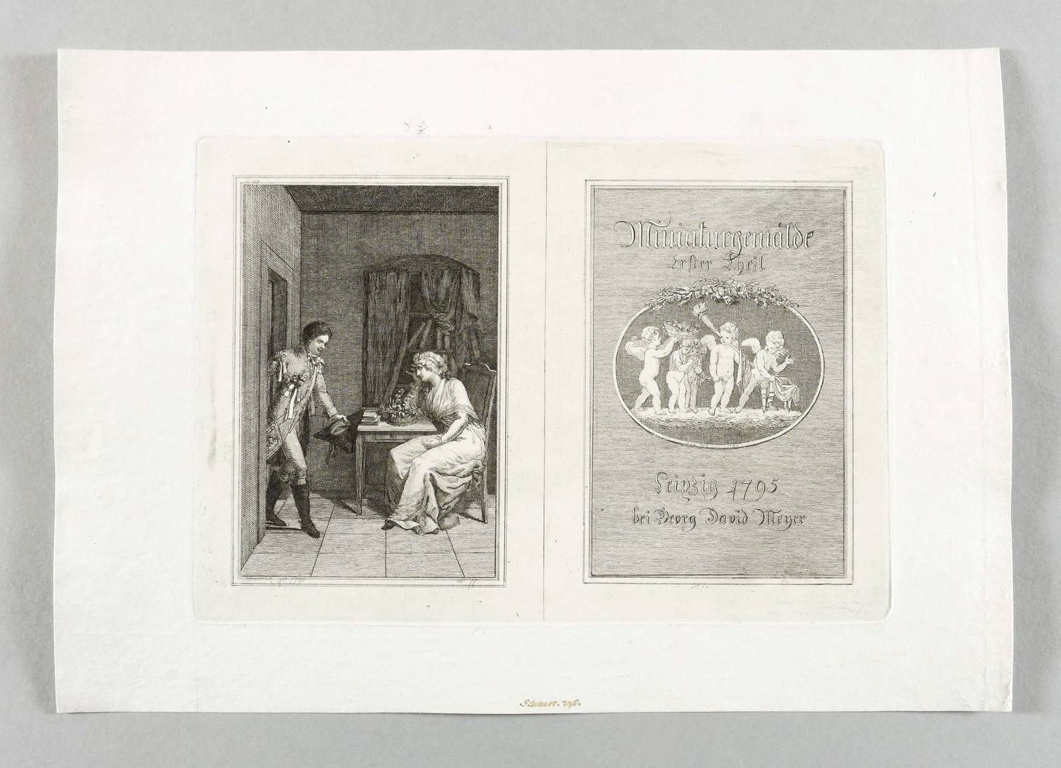 Aus: [Anonym], Miniaturgemälde (Leipzig: Georg David Meyer 1795), Bd. 1. – In der Platte unter der linken Darstellung signiert und datiert: ″Schnorr v. K. fec. 1795.″ – Frontispiz und Titelblatt auf einer Platte zu ″Miniaturgemälde″, einer 1795 bei Georg David Meyer in Leipzig erschienenen anonymen Textsammlung. - Frühe Arbeit des Künstlers. Selten. – Tadellos. Sehr guter Zustand.