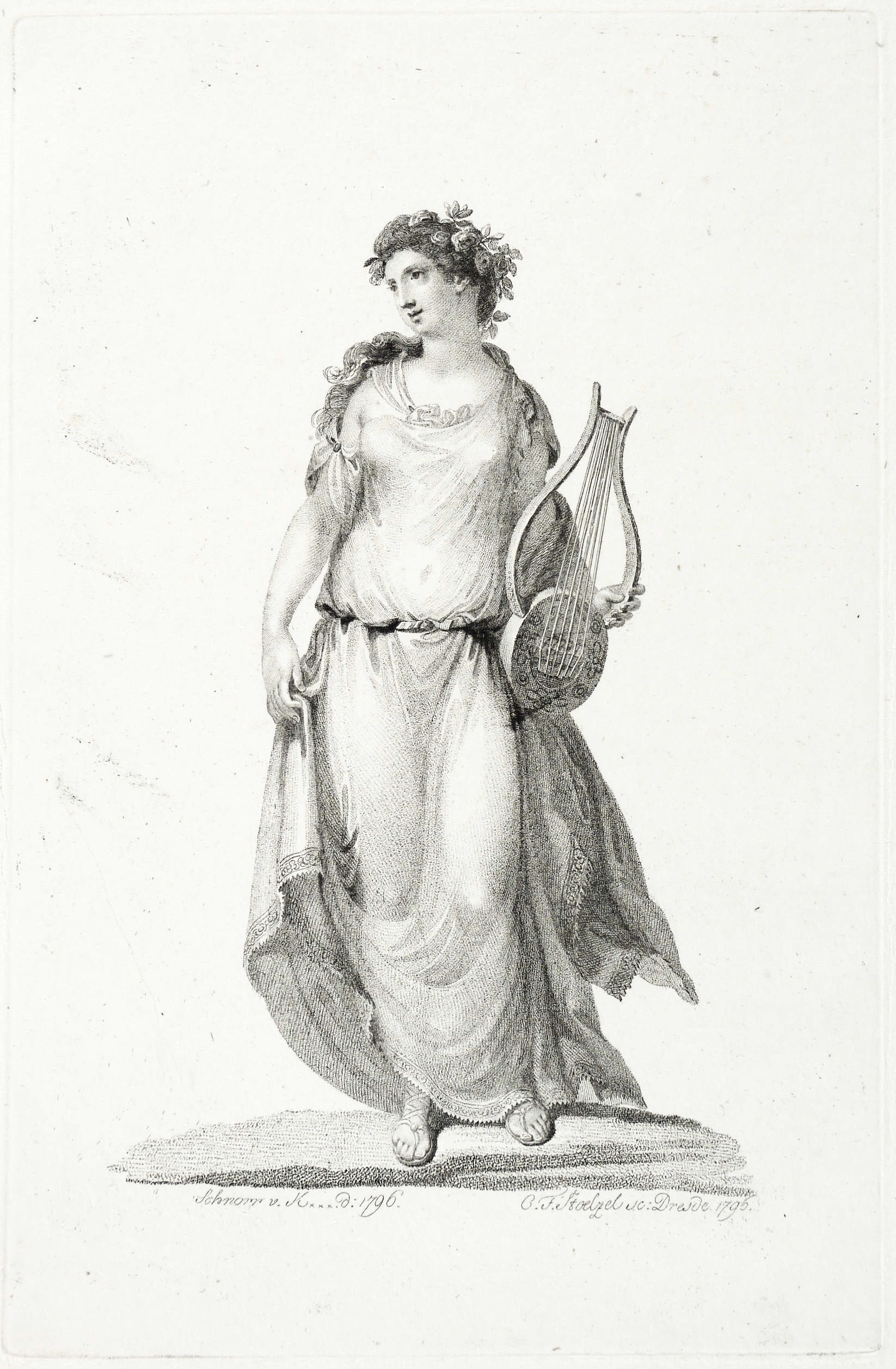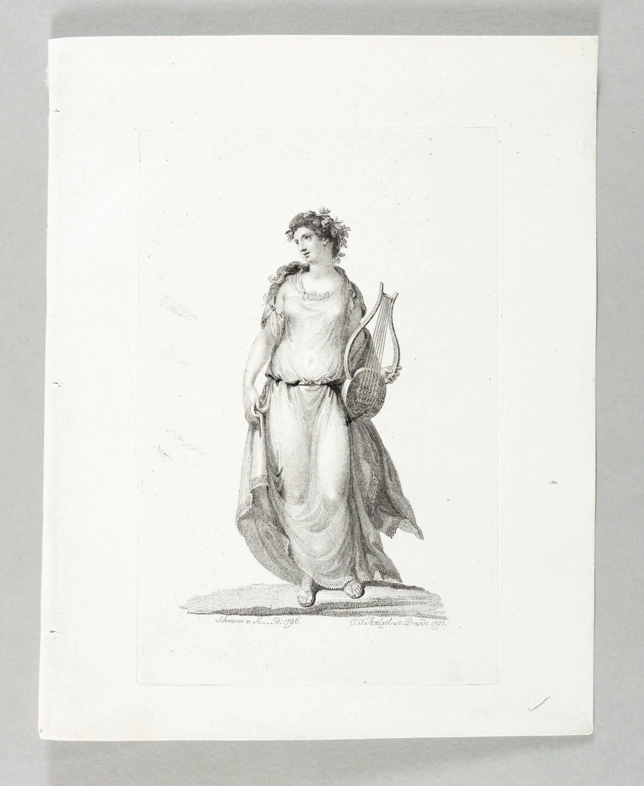 Aus: Johann Friedrich Reichardt, Lieder geselliger Freude (Leipzig: Gerhard Fleischer 1796). – In der Platte links und rechts unten signiert und datiert: ″Schnorr v. K... d: 1796. / C.F. Stoelzel sc: Dresde 1796″. – Darstellung der Erato als Muse der Liebesdichtung und des Liebesliedes. – Breitrandiges Exemplar. Sehr schön erhalten. Sehr guter Zustand.