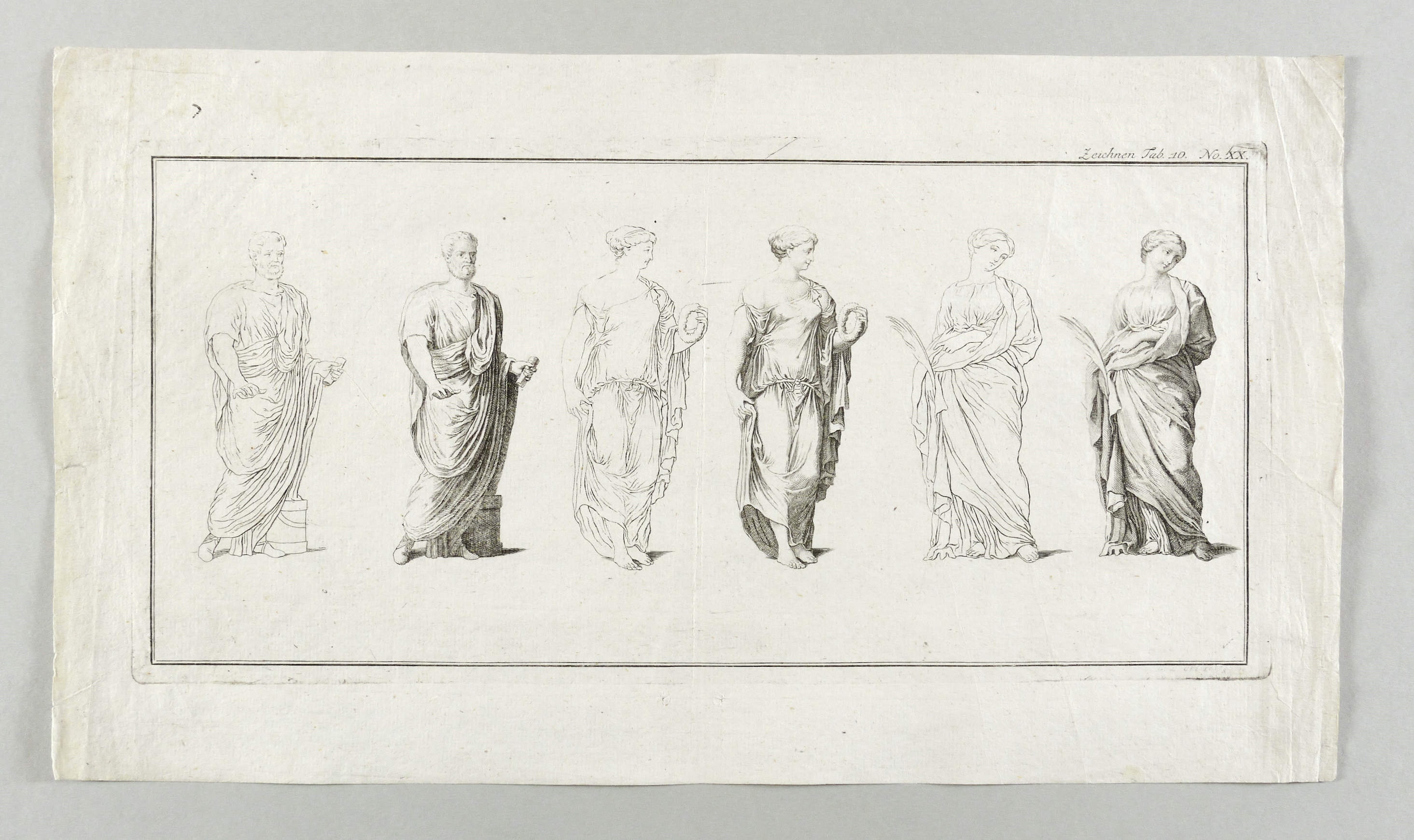 In der Platte rechts unten signiert und datiert: ″G.L. CRUSIUS 56″. Rechts oben bezeichnet: ″Zeichnen Tab. 10. No. XX.″ – Heftspuren im unteren Rand. Mittig augelegene ältere Faltung. Vor allem in den Rändern etwas knickspurig. Insgesamt mäßig guter Zustand.