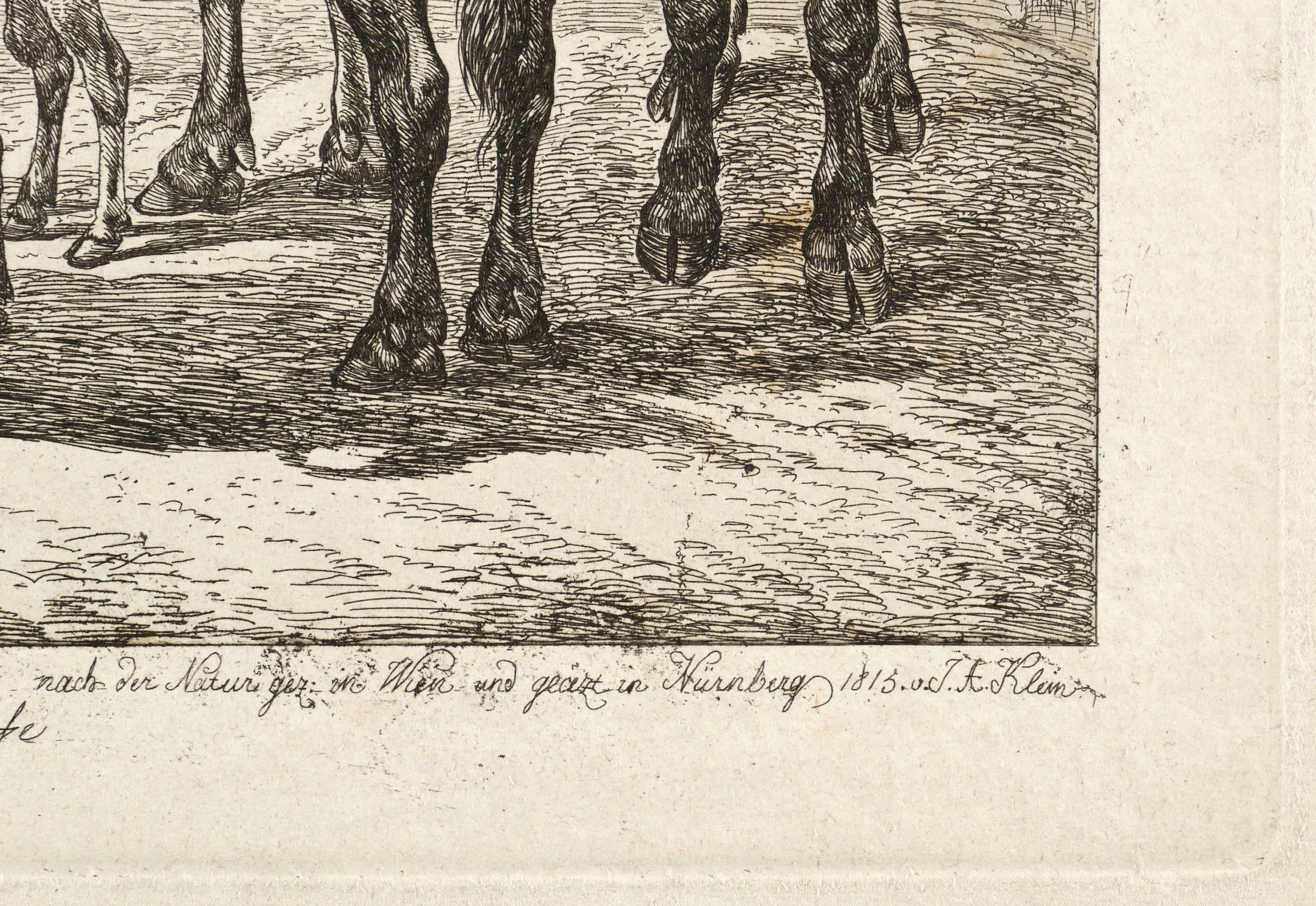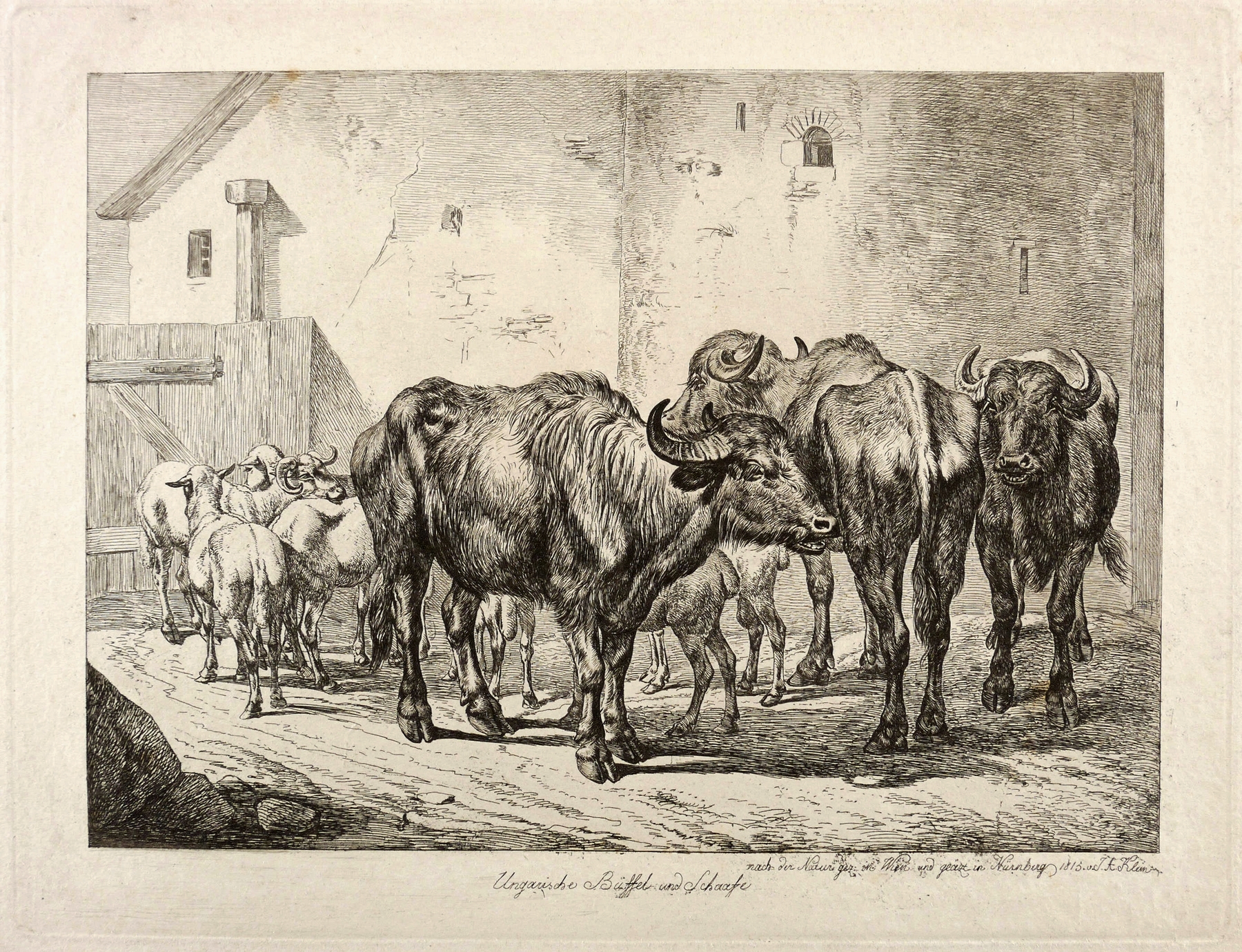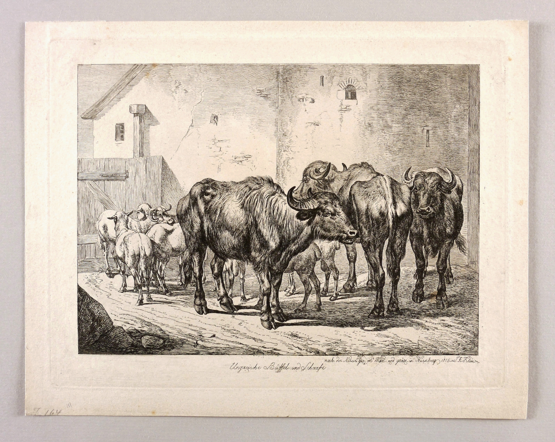 Jahn 164 III (von III). – In der Platte rechts unten signiert & datiert: ″nach der Natur gez: in Wien und geäzt in Nürnberg 1815 v. J.A. Klein″. Wasserzeichen: ″H: OSER SUPER FEIN KL[EIN]″. – Bei Jahn beschrieben als: ″Ungarische Büffel und Schaafe in einem durch ein Thor geschlossenen Hofraum bei Gebäuden stehend. Es sind sieben Schafe und drei Büffel, von welch letzteren einer nach rechts, der zweite von dem Betrachter abwärts und der dritte diesem zugewendet steht.″ – Gutes Exemplar. Nahezu tadellos. Sehr guter Zustand.