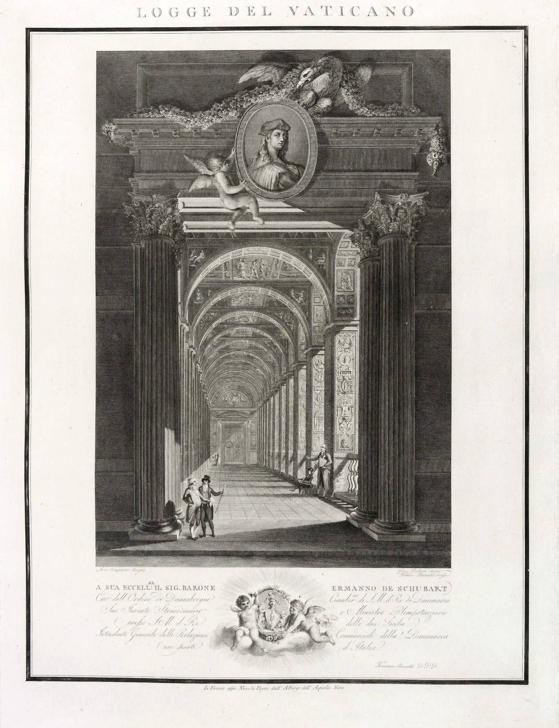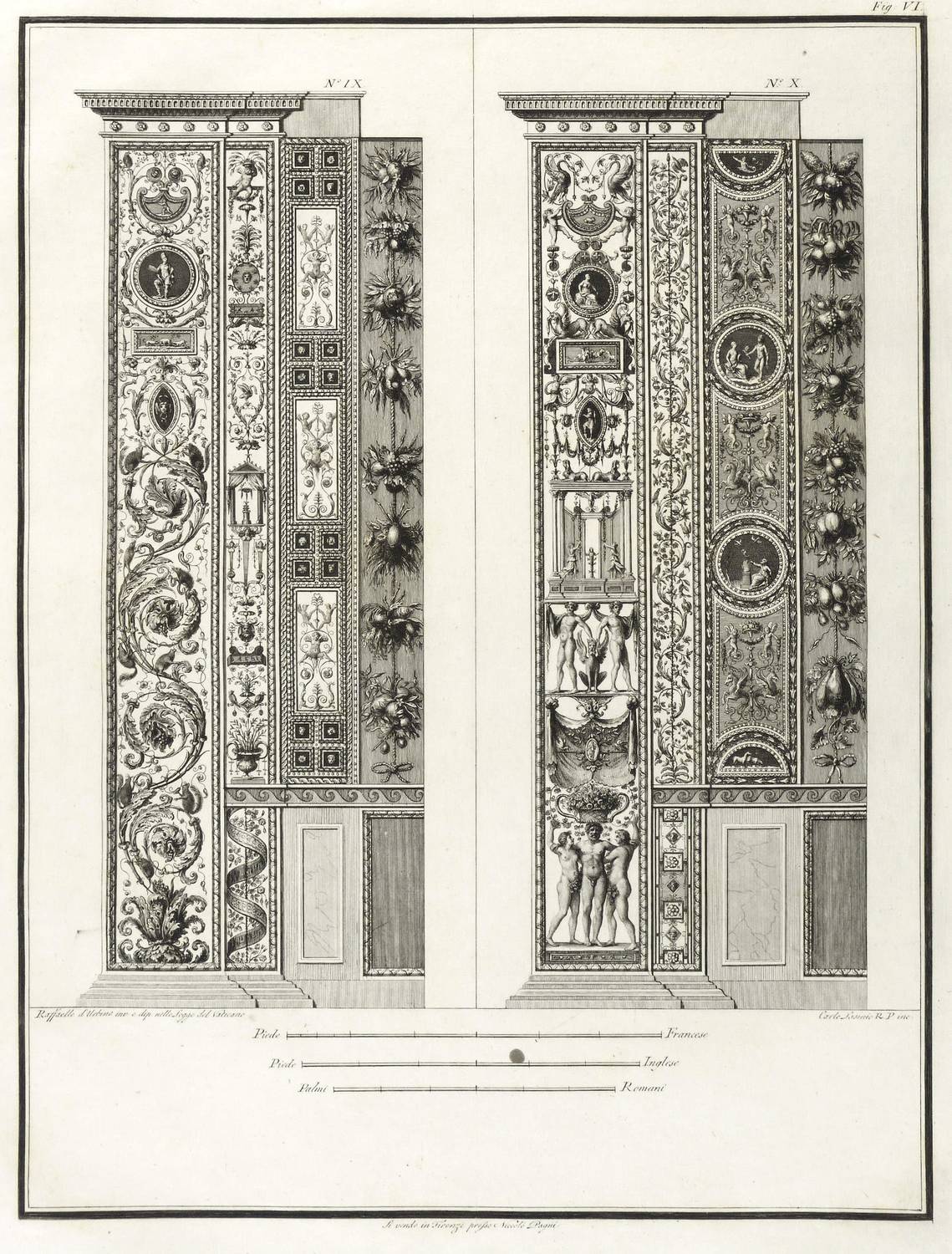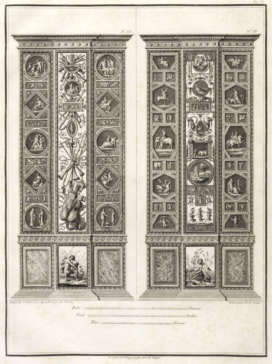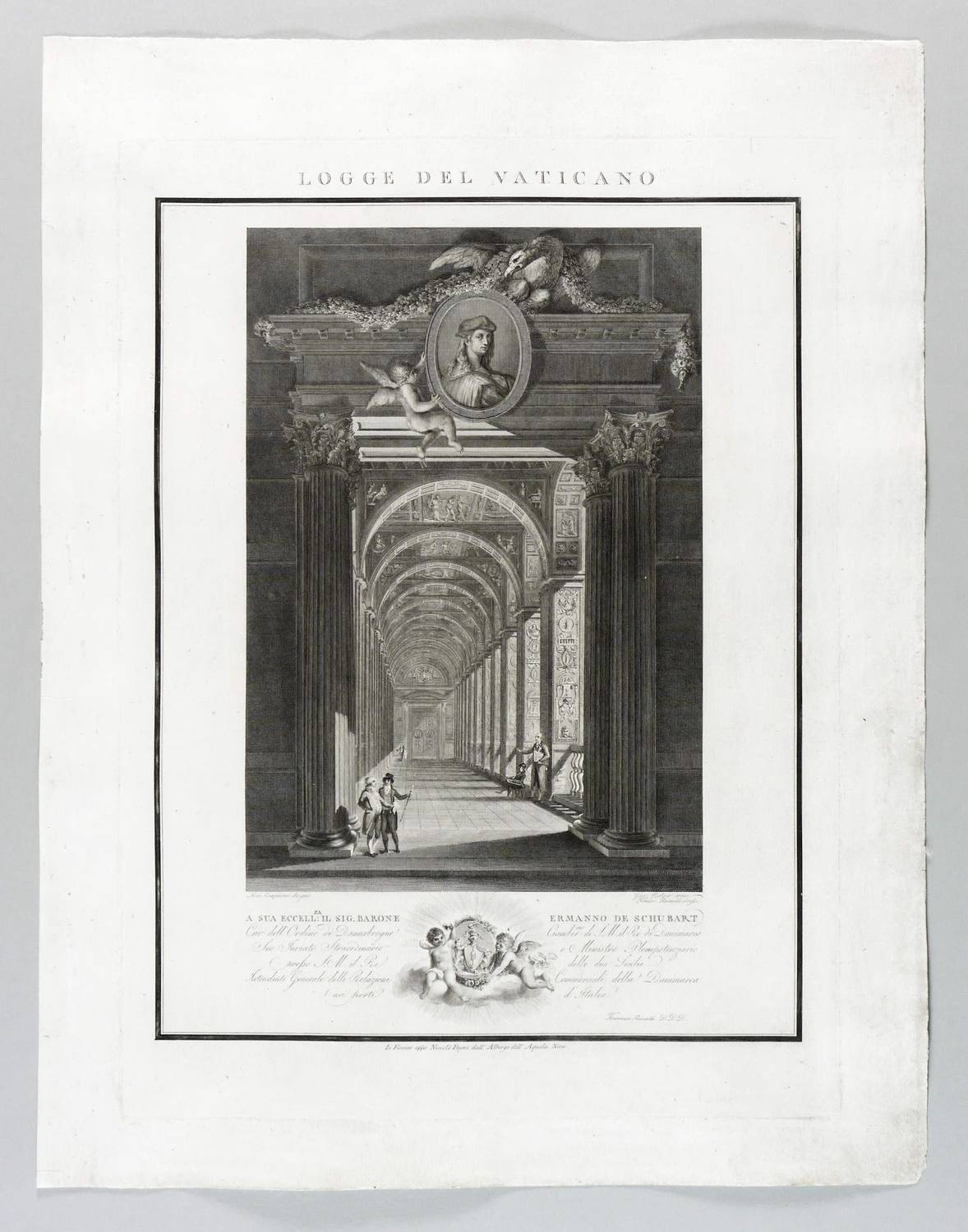 Höper G 21.35/36 (Kopie). – Aus: Carlo Lasinio, Logge del Vaticano (Florenz: Niccolo Pagni 1802). – Titelblatt oben bezeichnet: ″LOGGE DEL VATICANO″, links und rechts unten signiert: ″Luca Comparini disegnò // Giov: Balzar incise / Frañco: Rainaldi diresse″, darunter in zwei Spalten um zwei Putti mit Wappen bezeichnet: ″A SUA ECCELL:ZA IL SIG. BARONE ERMANNO DE SCHUBART / Cav: dell’ Ordine di Dannebrogue Ciamber:no di S.M. il Re di Danimarca / Suo Inviato Straordinario e Ministro Plenipotenziario / presso S.M. il Re delle Sue Sicilie / Intendente Generale delle Relazioni Commerciali della Danimarca / nei porti d’Italia″, rechts darunter: ″Francesco Rainaldi D.D.D.″ sowie unter der Umrandung: ″In Firenze appo: Niccolò Pagni dall’Albergo dell’Aquila Nera″. Die einzelnen Tafeln meist rechts unten signiert: ″Carlo Lasinio R. Prof. inc.″ Tafel Nr. X mit Jahreszahl: ″1802″. – Vollständige Folge des Prachtwerks mit allen 14 Blättern, einem Frontispiz und 13 Tafeln, jeweils Doppeldarstellungen der Pilaster der Loggien-Freskierung von Raffael. Vorbild waren die berühmten ″Loggie di Rafaele nel Vaticano″ (1777) von Giovanni Volpato und Giovanni Ottaviani. (Vgl. Corinna Höper, Wolfgang Brückle, Udo Felbinger, Raffael und die Folgen. Das Kunstwerk in Zeitaltern seiner graph. Reproduzierbarkeit, Stuttgart 2001, S. 478 ff, G 21). – Ohne Einband. Blätter unbeschnitten und originalrandig. Die Tafeln außer dem Titelblatt mit Bindungsspuren bzw. noch zusammengeheftet. Die Blätter meist leicht stockfleckig und mit geringen Altersspuren, selten etwas randrissig, fingerfleckig oder stärker stockfleckig. Insgesamt mäßig guter Zustand.