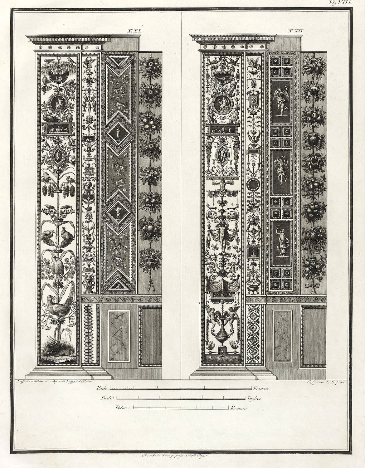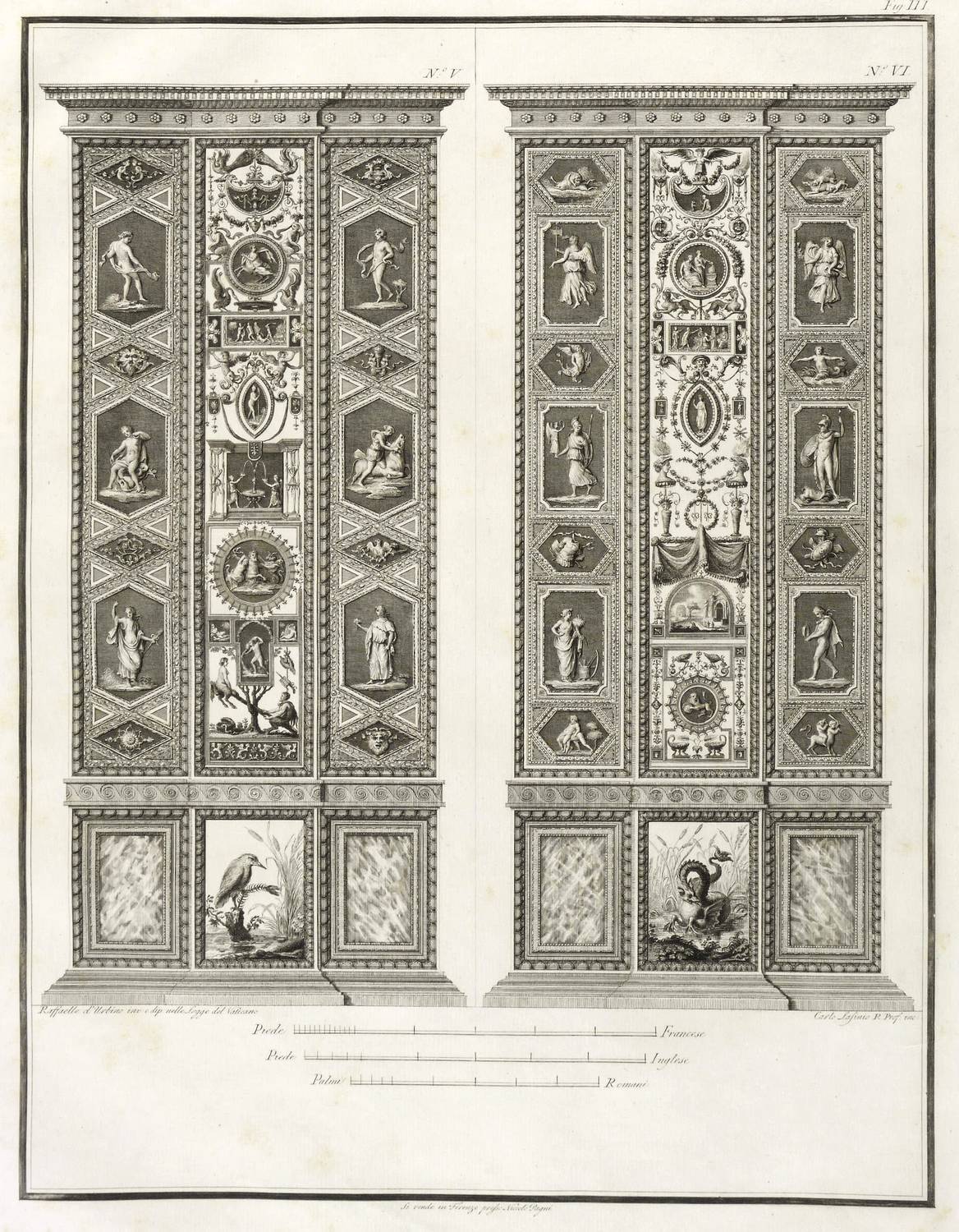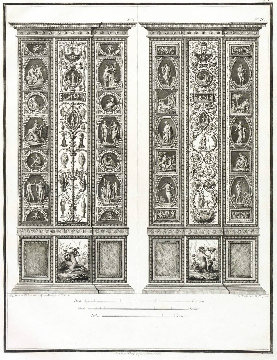 Höper G 21.35/36 (Kopie). – Aus: Carlo Lasinio, Logge del Vaticano (Florenz: Niccolo Pagni 1802). – Titelblatt oben bezeichnet: ″LOGGE DEL VATICANO″, links und rechts unten signiert: ″Luca Comparini disegnò // Giov: Balzar incise / Frañco: Rainaldi diresse″, darunter in zwei Spalten um zwei Putti mit Wappen bezeichnet: ″A SUA ECCELL:ZA IL SIG. BARONE ERMANNO DE SCHUBART / Cav: dell’ Ordine di Dannebrogue Ciamber:no di S.M. il Re di Danimarca / Suo Inviato Straordinario e Ministro Plenipotenziario / presso S.M. il Re delle Sue Sicilie / Intendente Generale delle Relazioni Commerciali della Danimarca / nei porti d’Italia″, rechts darunter: ″Francesco Rainaldi D.D.D.″ sowie unter der Umrandung: ″In Firenze appo: Niccolò Pagni dall’Albergo dell’Aquila Nera″. Die einzelnen Tafeln meist rechts unten signiert: ″Carlo Lasinio R. Prof. inc.″ Tafel Nr. X mit Jahreszahl: ″1802″. – Vollständige Folge des Prachtwerks mit allen 14 Blättern, einem Frontispiz und 13 Tafeln, jeweils Doppeldarstellungen der Pilaster der Loggien-Freskierung von Raffael. Vorbild waren die berühmten ″Loggie di Rafaele nel Vaticano″ (1777) von Giovanni Volpato und Giovanni Ottaviani. (Vgl. Corinna Höper, Wolfgang Brückle, Udo Felbinger, Raffael und die Folgen. Das Kunstwerk in Zeitaltern seiner graph. Reproduzierbarkeit, Stuttgart 2001, S. 478 ff, G 21). – Ohne Einband. Blätter unbeschnitten und originalrandig. Die Tafeln außer dem Titelblatt mit Bindungsspuren bzw. noch zusammengeheftet. Die Blätter meist leicht stockfleckig und mit geringen Altersspuren, selten etwas randrissig, fingerfleckig oder stärker stockfleckig. Insgesamt mäßig guter Zustand.