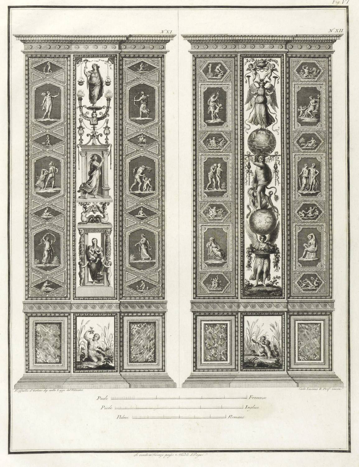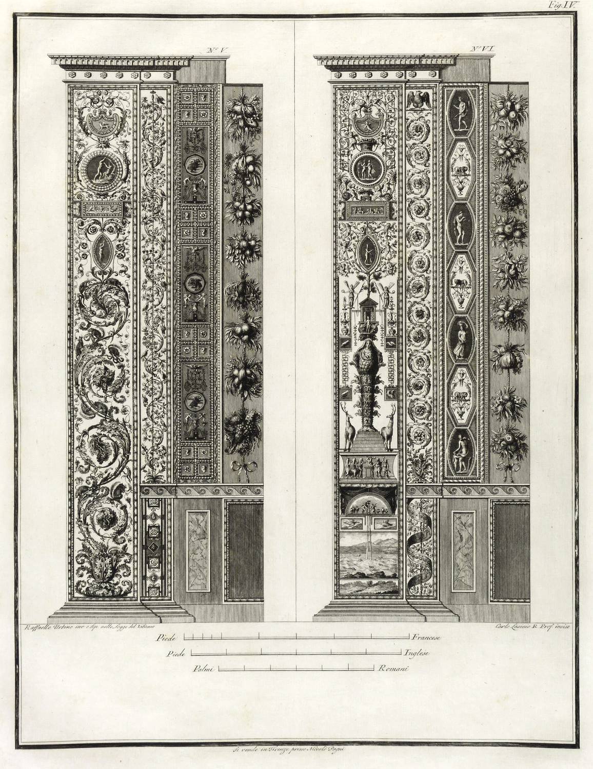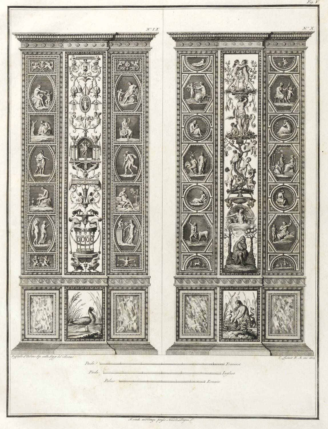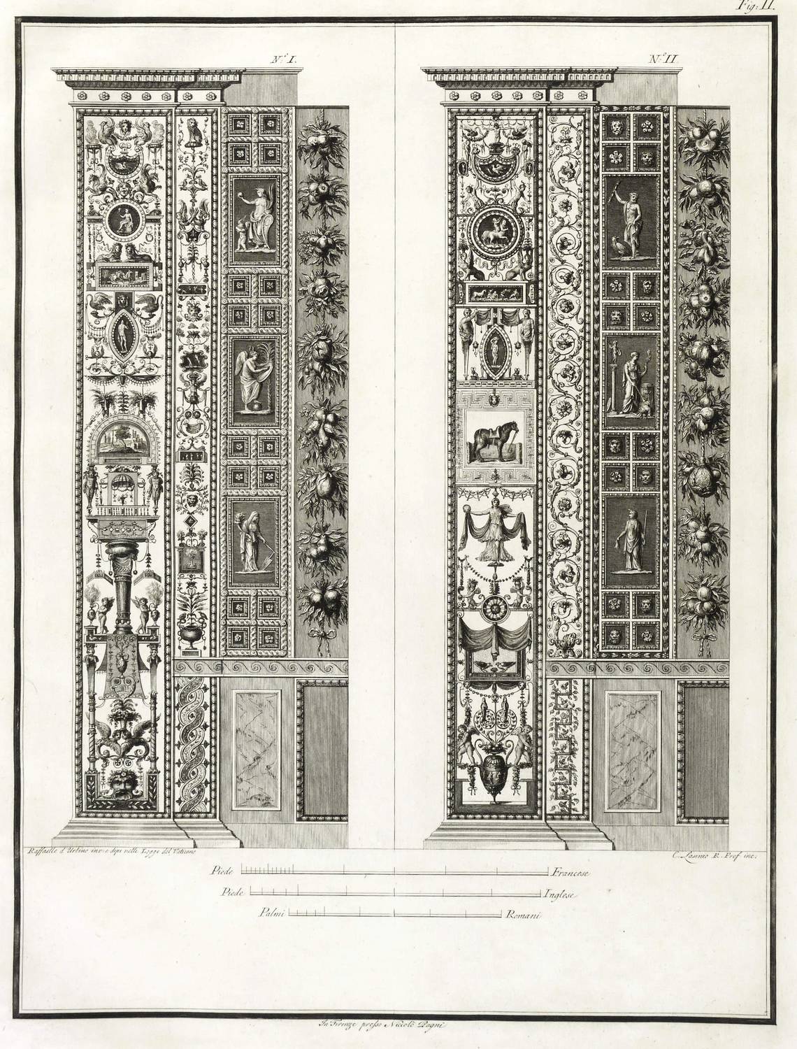 Höper G 21.35/36 (Kopie). – Aus: Carlo Lasinio, Logge del Vaticano (Florenz: Niccolo Pagni 1802). – Titelblatt oben bezeichnet: ″LOGGE DEL VATICANO″, links und rechts unten signiert: ″Luca Comparini disegnò // Giov: Balzar incise / Frañco: Rainaldi diresse″, darunter in zwei Spalten um zwei Putti mit Wappen bezeichnet: ″A SUA ECCELL:ZA IL SIG. BARONE ERMANNO DE SCHUBART / Cav: dell’ Ordine di Dannebrogue Ciamber:no di S.M. il Re di Danimarca / Suo Inviato Straordinario e Ministro Plenipotenziario / presso S.M. il Re delle Sue Sicilie / Intendente Generale delle Relazioni Commerciali della Danimarca / nei porti d’Italia″, rechts darunter: ″Francesco Rainaldi D.D.D.″ sowie unter der Umrandung: ″In Firenze appo: Niccolò Pagni dall’Albergo dell’Aquila Nera″. Die einzelnen Tafeln meist rechts unten signiert: ″Carlo Lasinio R. Prof. inc.″ Tafel Nr. X mit Jahreszahl: ″1802″. – Vollständige Folge des Prachtwerks mit allen 14 Blättern, einem Frontispiz und 13 Tafeln, jeweils Doppeldarstellungen der Pilaster der Loggien-Freskierung von Raffael. Vorbild waren die berühmten ″Loggie di Rafaele nel Vaticano″ (1777) von Giovanni Volpato und Giovanni Ottaviani. (Vgl. Corinna Höper, Wolfgang Brückle, Udo Felbinger, Raffael und die Folgen. Das Kunstwerk in Zeitaltern seiner graph. Reproduzierbarkeit, Stuttgart 2001, S. 478 ff, G 21). – Ohne Einband. Blätter unbeschnitten und originalrandig. Die Tafeln außer dem Titelblatt mit Bindungsspuren bzw. noch zusammengeheftet. Die Blätter meist leicht stockfleckig und mit geringen Altersspuren, selten etwas randrissig, fingerfleckig oder stärker stockfleckig. Insgesamt mäßig guter Zustand.