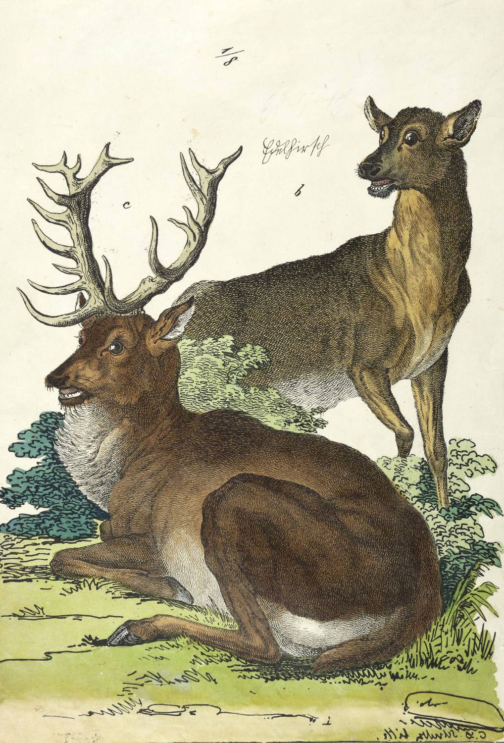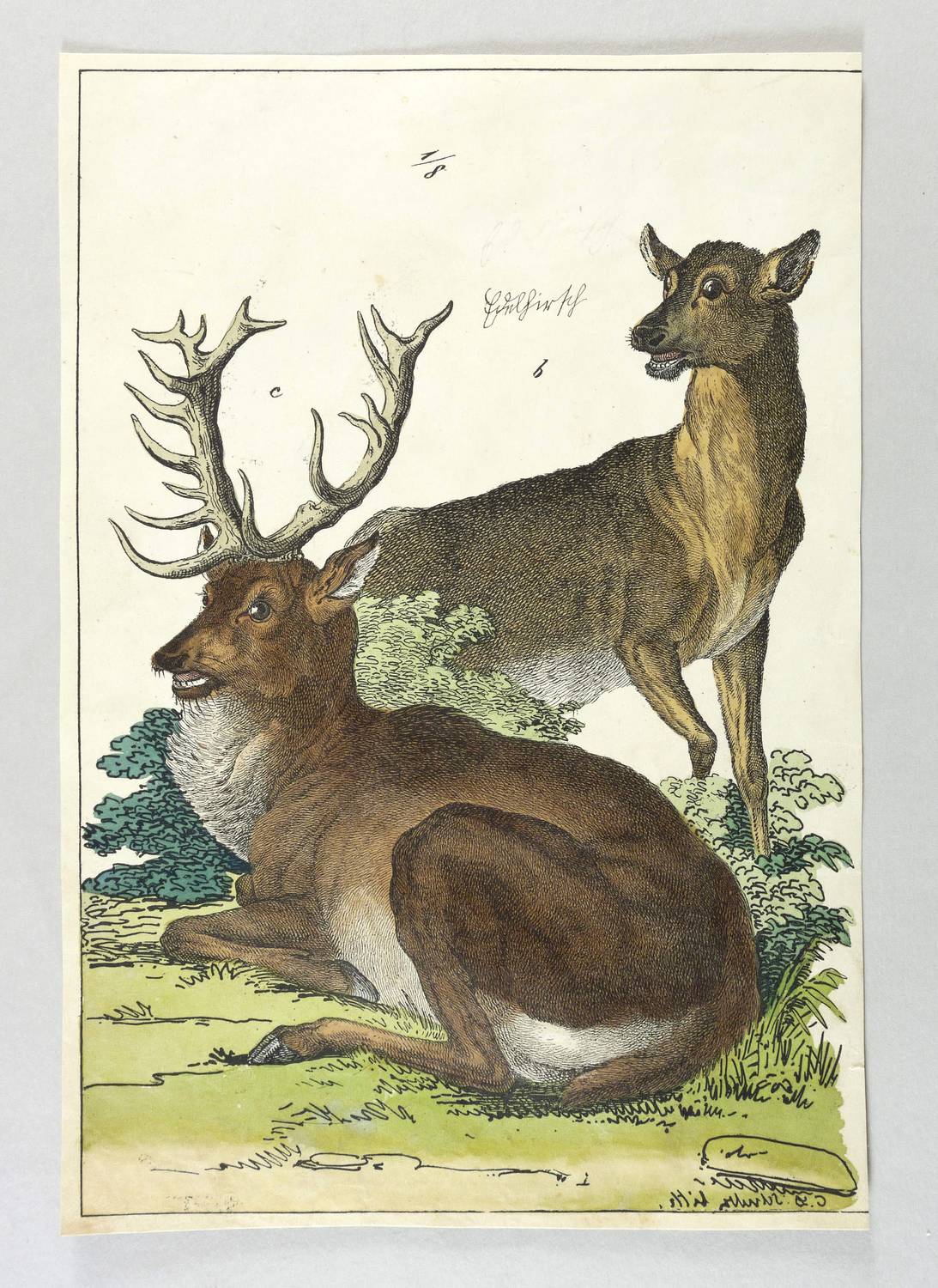 Aus: Naturgeschichte der Säugethiere in Bildern. treu theils nach d. Natur, theils nach d. ausgezeichn. zoolog. Bildersammlungen gez., fein u. getreu color. zum Anschauungsunterricht für d. Jugend [...] (Eßlingen & Stuttgart: Schreiber & Schill 1854). – Oberhalb der Darstellung mit schwarzer Tusche bezeichnet. – Papier leicht fleckig und teils gebräunt. Stark beschnitten. Noch guter Zustand.