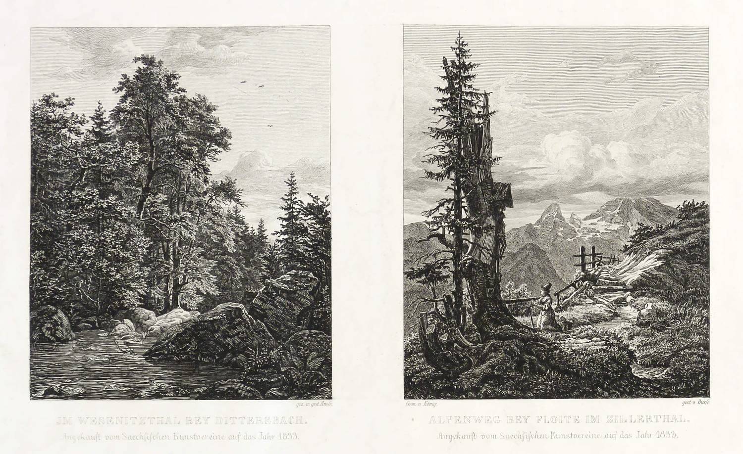 Kovalevski B-C 110a. Kovalevski B-C 110b. – Aus: Bilderchronik des Sächsischen Kunstvereins (Dresden: Sächsischer Kunstverein 1828-1836). – Jeweils rechts unterhalb der Darstellung signiert und direkt unterhalb betitelt und bezeichnet. – Zwei Darstellungen von einer Platte. – Originalrandiges Blatt. Im Randbereich teils schwach angeschmutzt. Sonst aber guter Zustand.