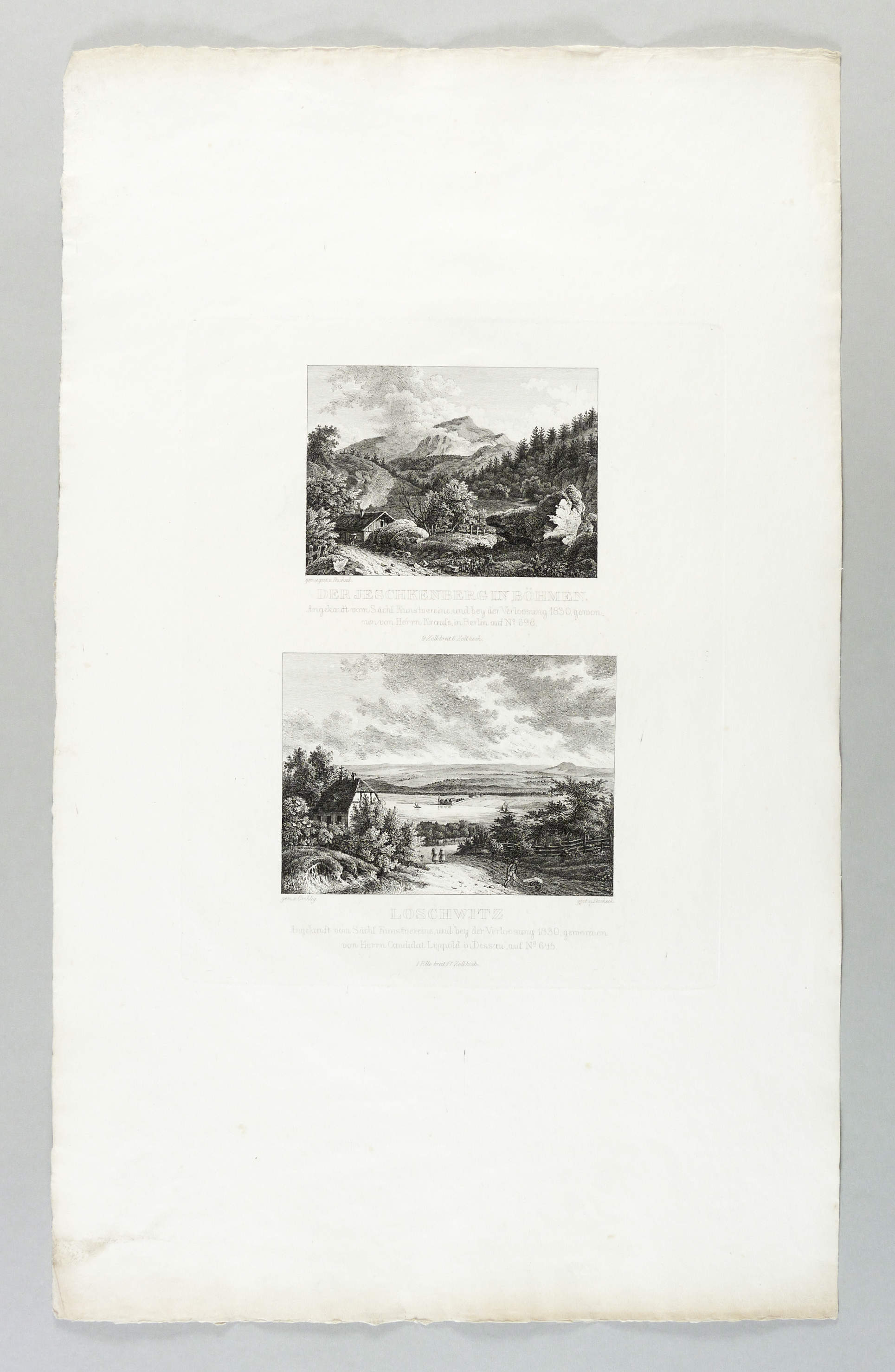 1830. Kupferstich / Radierung. – Landschaftsdarstellung, von Carl Pescheck. – 54 x 33,5 cm (Blatt), 8,9 x 12,3 cm (Darstellung / erste), 10,1 x 14,0 cm (Darstellung / zweite), 28,2 x 22,8 cm (Platte).