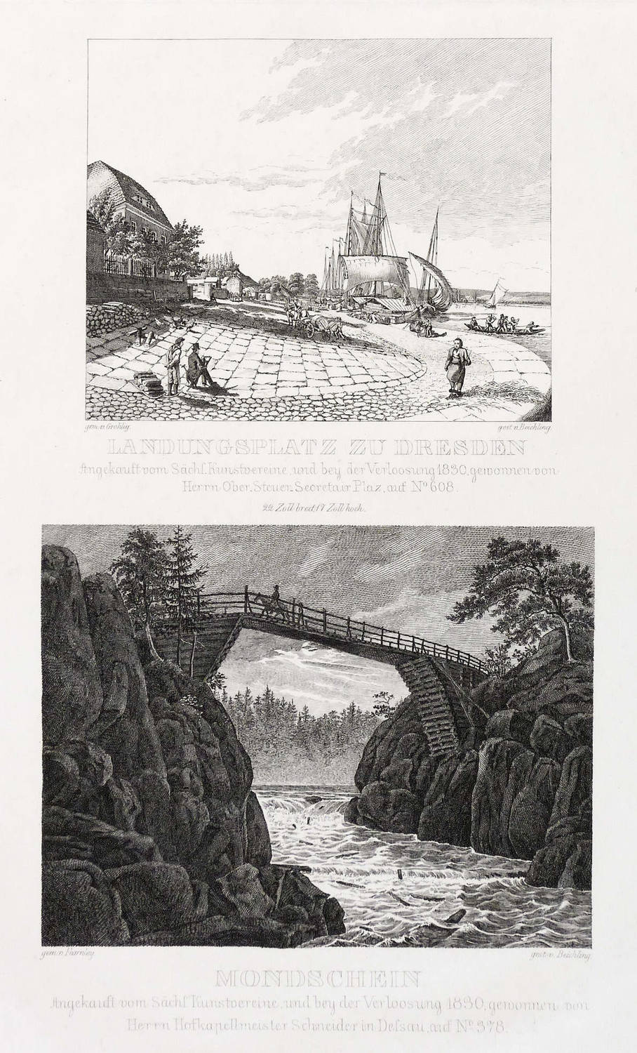Kovalevski B-C 62b. Kozakiewicz B-C 62a. – Aus: Bilderchronik des Sächsischen Kunstvereins (Dresden: Sächsischer Kunstverein 1828-1836). – Jeweils rechts unterhalb der Darstellung signiert und direkt unterhalb betitelt und bezeichnet. – Zwei Darstellungen von einer Platte. – Blatt im Randbereich teils leicht angeschmutzt. Sonst aber guter Zustand.
