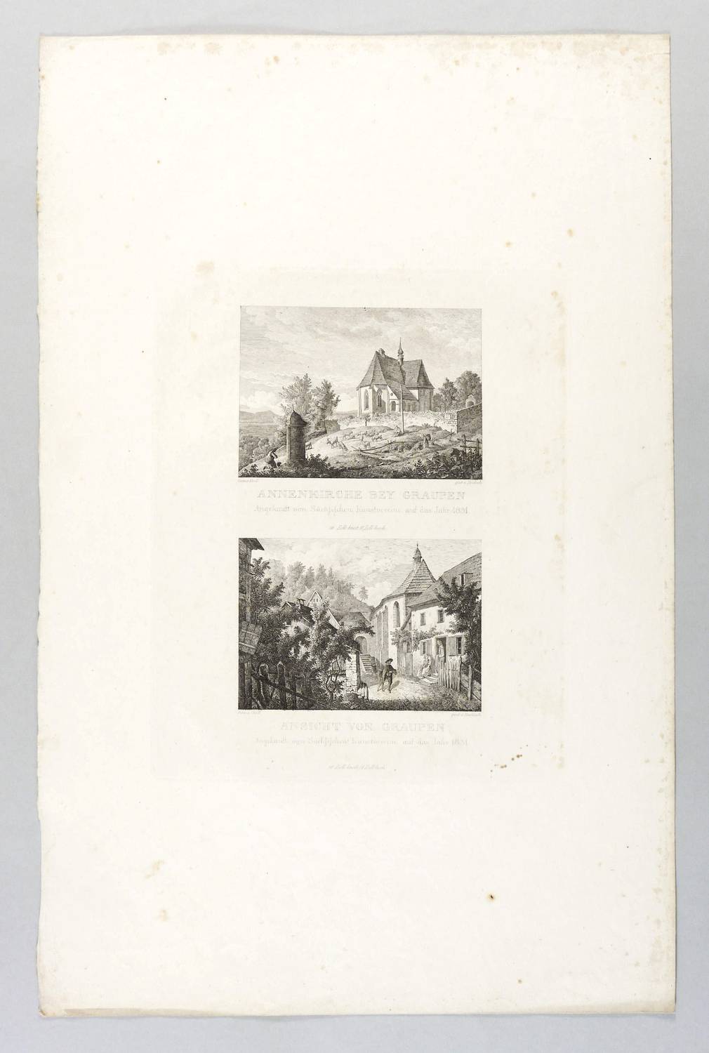 Kozakiewicz B-C 62a. Kovalevski B-C 62b. – Aus: Bilderchronik des Sächsischen Kunstvereins (Dresden: Sächsischer Kunstverein 1828-1836). – Jeweils rechts unterhalb der Darstellung signiert und direkt unterhalb betitelt und bezeichnet. – Zwei Darstellungen von einer Platte. – Blatt vereinzelt leicht fleckig. Sonst aber guter Zustand.