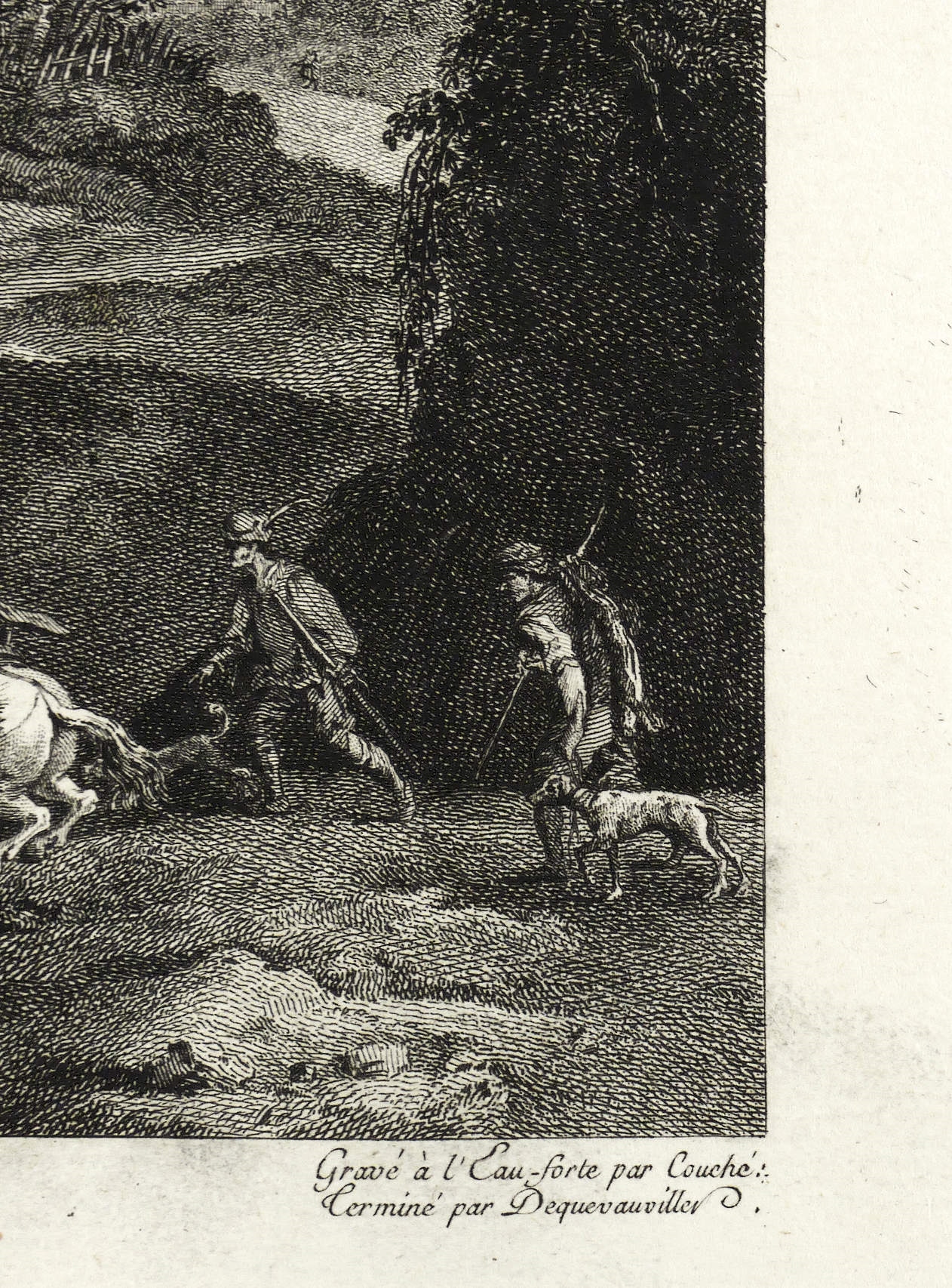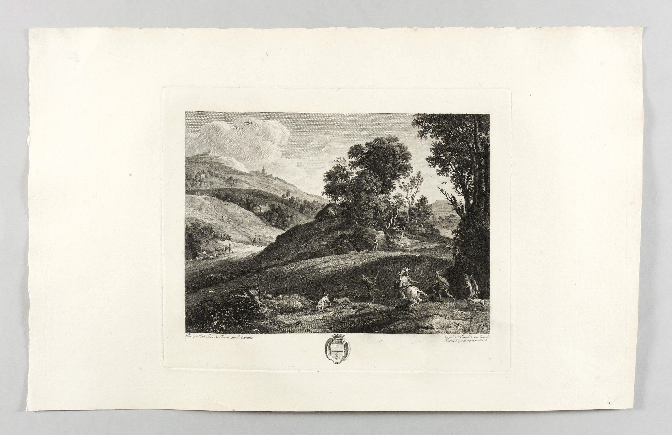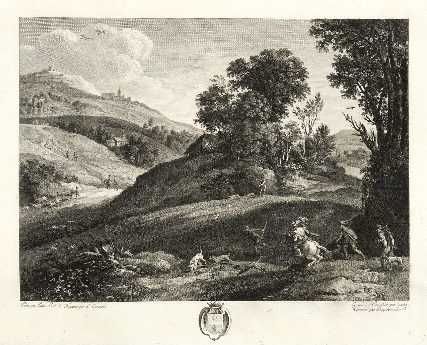 Dequevauvillier, François & Couché, Jacques. – Nach Paul Bril & Lodovico Carracci. – „Landschaft mit Hasenjagd”.