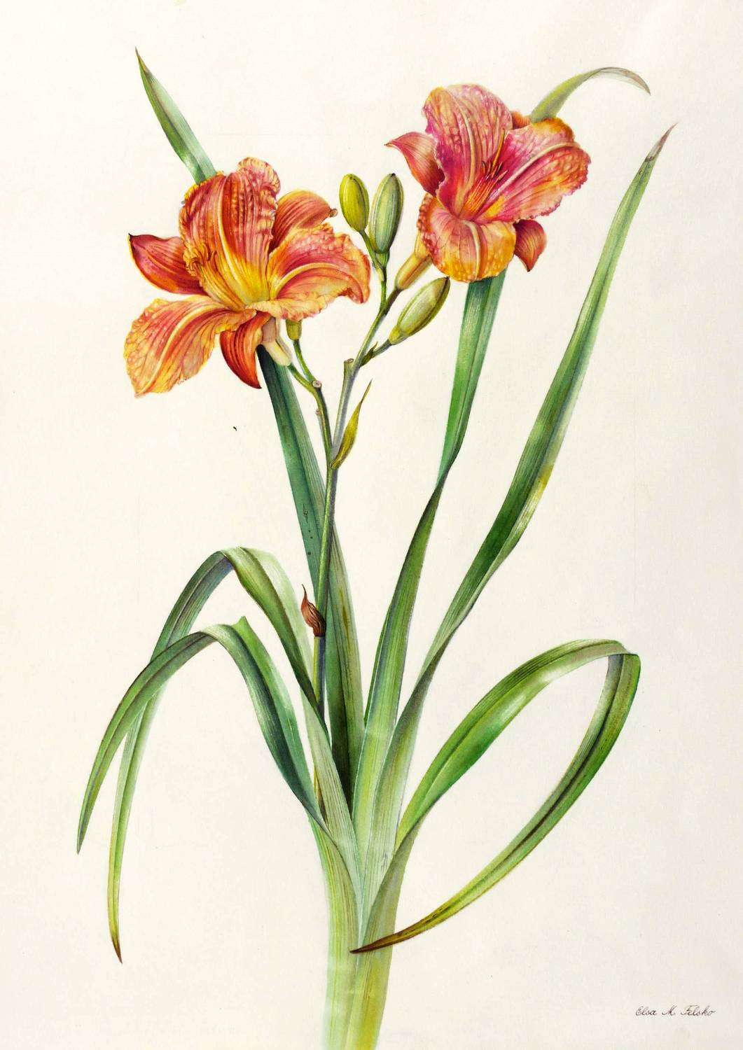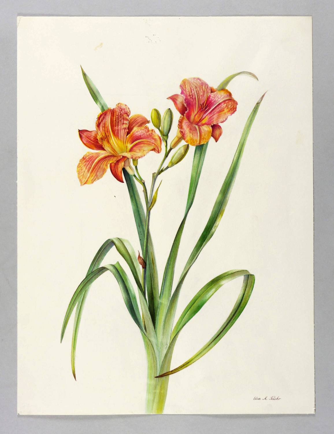 Rechts unten in brauner Feder signiert: ″Elsa M. Felsko″. Verso bezeichnet: ″Gelbrote Taglilie / Hemerocallis fulva″ – Botanisches Aquarell von allerhöchster zeichnerischer wie koloristischer Qualität. – Blatt verso mit leichten Montageresten. Sehr guter Zustand.