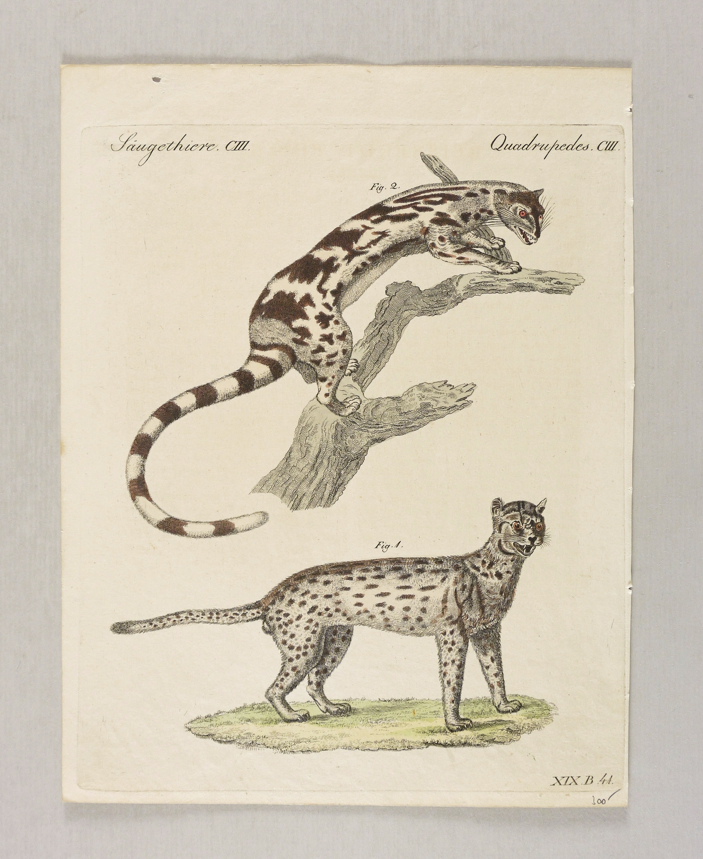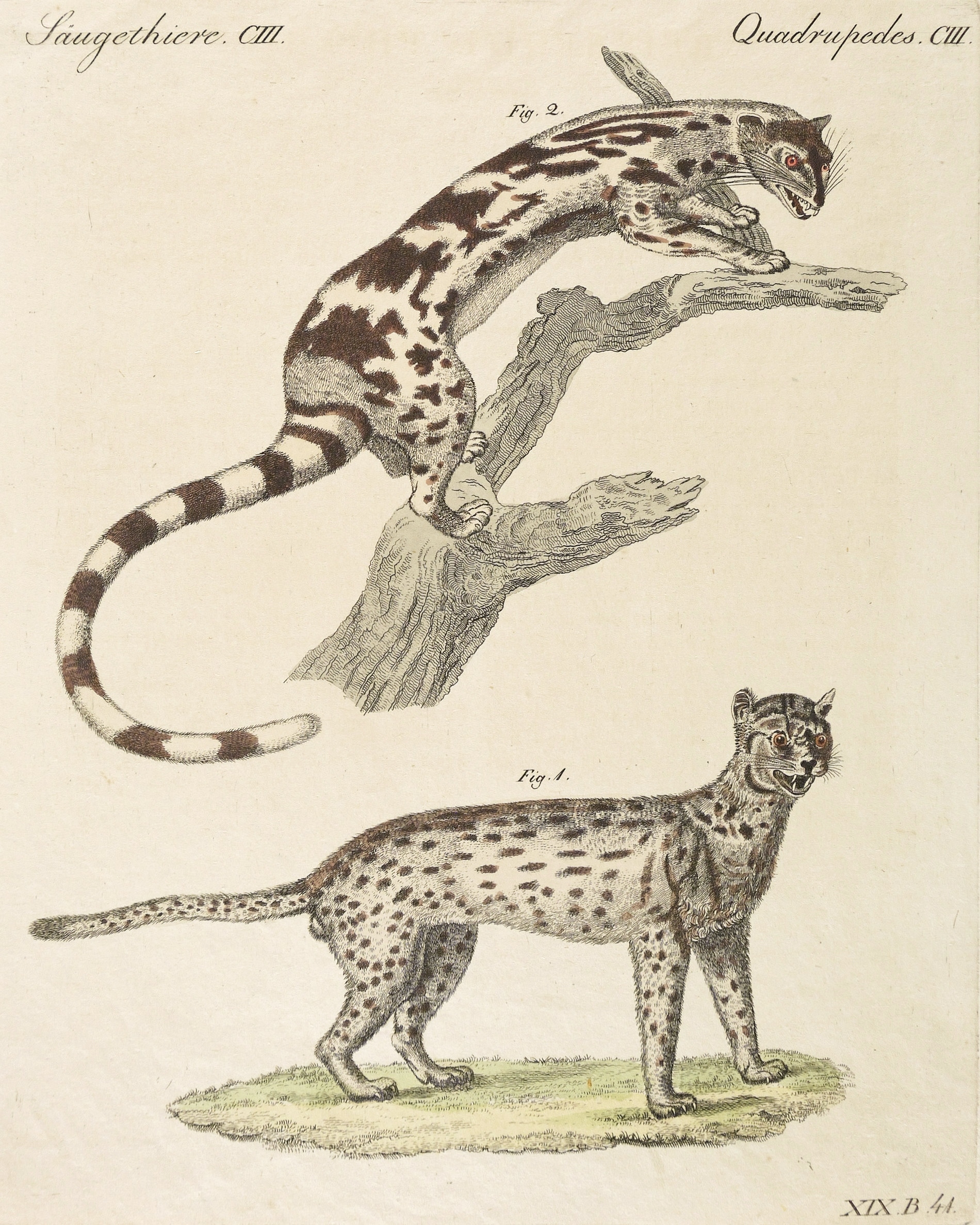 Aus: Bilderbuch für Kinder. enthaltend eine angenehme Sammlung von Thieren, Pflanzen, Blumen, Früchten, Mineralien, Trachten und allerhand andern unterrichtenden Gegenständen aus dem Reiche der Natur, der Künste und Wissenschaften; alle nach Originalen gestochen und mit einer k (Weimar / Gotha: Expedition des Journals des Luxus und der Moden / Ettingerische Buchhandlung 1790-1830). – Sundakatze (Prionailurus javanensis), Synonym: Felis javanensis. Bänderlinsang (Prionodon linsang), Synonym: Felis gracilis. - Mit Textblatt. – Guter Zustand.