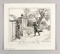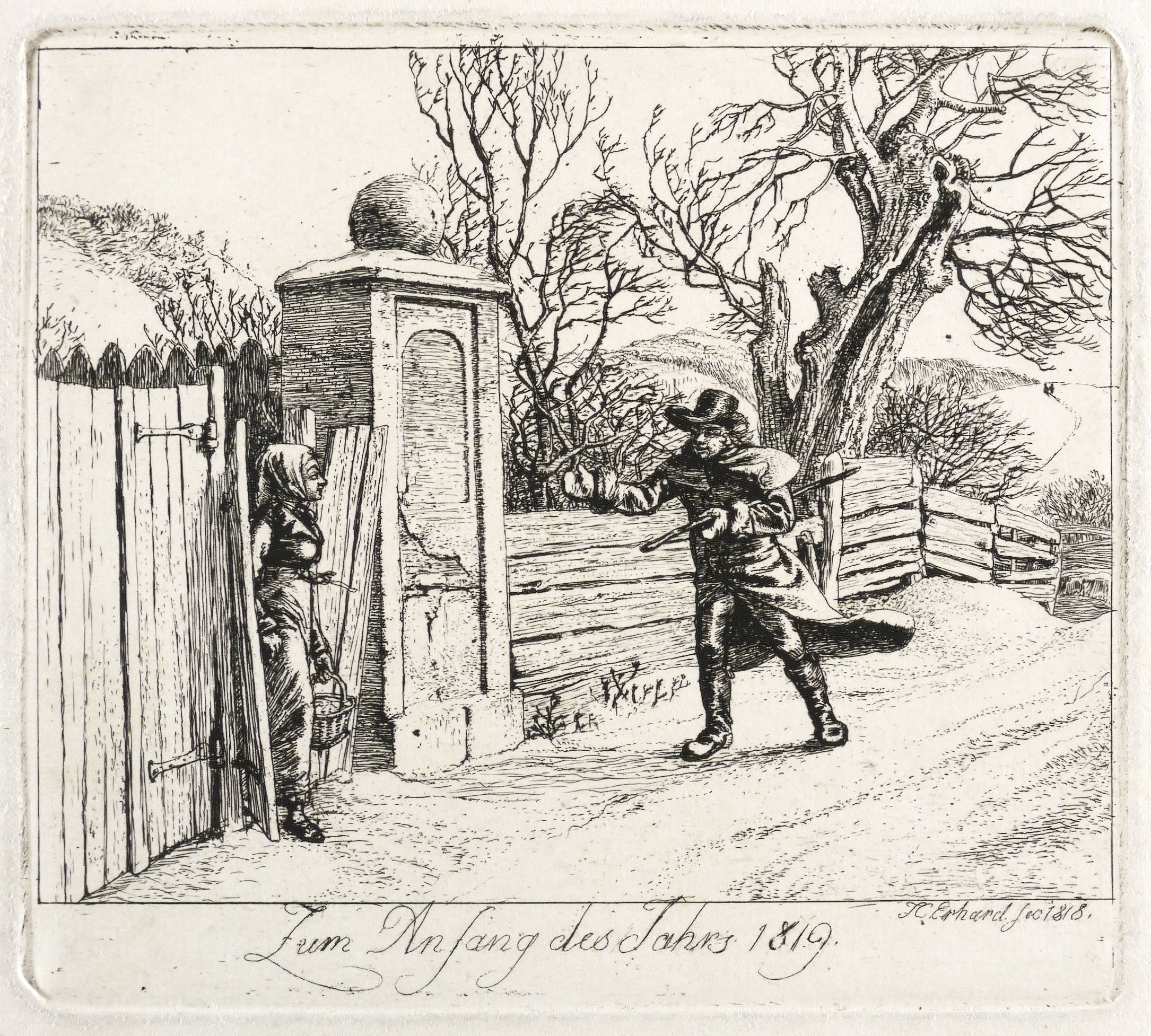 Apell 56 II (von II). – In der Platte rechts unten signiert und datiert: ″JC Erhard fec 1818″. Im Plattenrand unten Inschrift: ″Zum Anfang des Jahres 1819″. In der Blattecke links unten in Bleistift bezeichnet: ″Apell. Nr. 56 II″. Verso nochmals Werknummer und Titel. – Schöner kontrastreicher Abzug vom zweiten Zustand der Platte mit allen Vollendungen und den gereinigten nicht druckenden Partien. Nicht aus den posthum bei Ferdinand Bauer in Wien herausgegebenen ″40 Ansichten″ von 1857. – Eine der bekanntesten druckgrafischen Arbeiten des Künstlers. – Provenienz: Sammlung Friedrich Julius Arndt (genannt Fritz Arndt, 1856-1919, Besitzer des Klosterguts Oberwartha bei Dresden), danach Sammlung Dr. Theodor Arndt, Dresden-Blasewitz. – Verso leichte Montagereste. Hervorragend erhalten. Sehr guter Zustand.