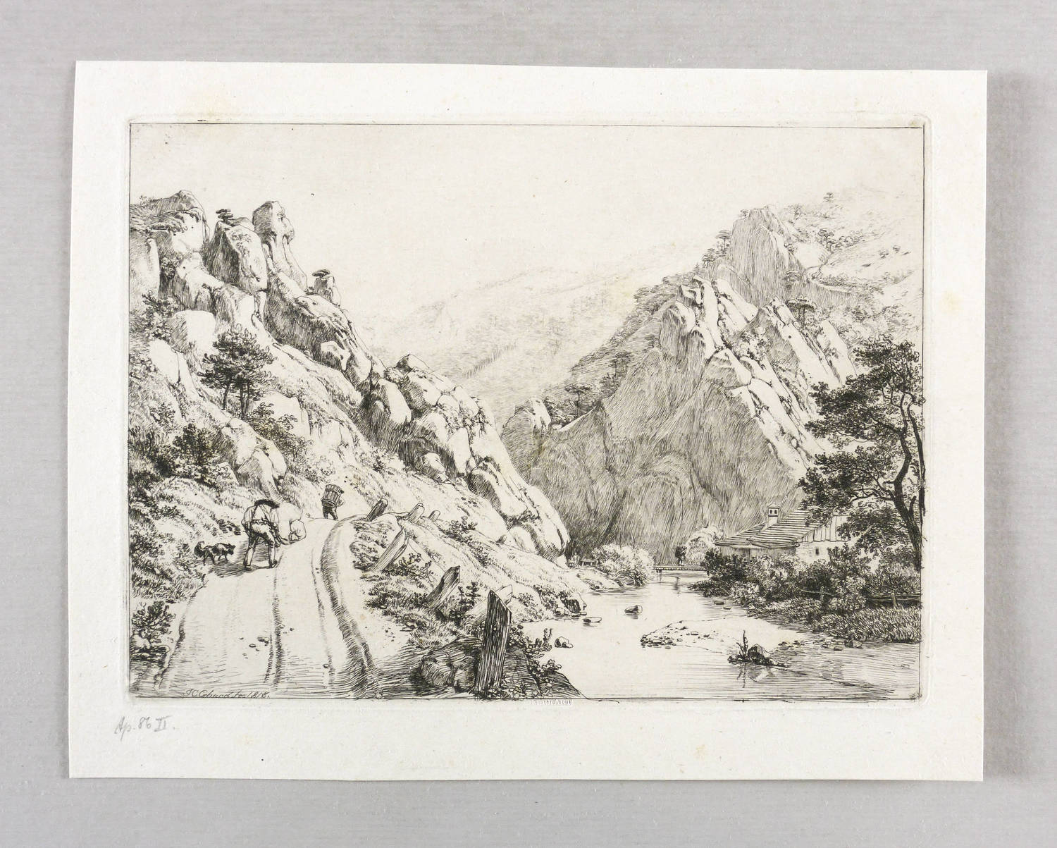 Apell 86 II (von II). – In der Platte links unten im Weg signiert und datiert: ″JC Erhard fec 1818″. Direkt darunter in Bleistift bezeichnet: ″Ap[ell]. 86 II″. Verso nochmals Werknummer und Titel. – Abzug vom zweiten Zustand der Platte mit den Vollendungen aller Gegebenheiten, insonderheit der beiden rechts im Mittelgrund stehenden Häuser. – Die als Naturpark gestaltete Landschaft Brühl (heute Hinterbrühl) entwickelte sich im 19. Jahrhundert zu einer Sommerfrische für's Wiener Bürgertum und wurde beliebter Aufenthalt für Künstlern wie Franz Schubert, Ludwig van Beethoven oder Ferdinand Georg Waldmüller. – Provenienz: Sammlung Friedrich Julius Arndt (genannt Fritz Arndt, 1856-1919, Besitzer des Klosterguts Oberwartha bei Dresden), danach Sammlung Dr. Theodor Arndt, Dresden-Blasewitz. – Verso leichte Montagereste. Hervorragend erhalten. Sehr guter Zustand.