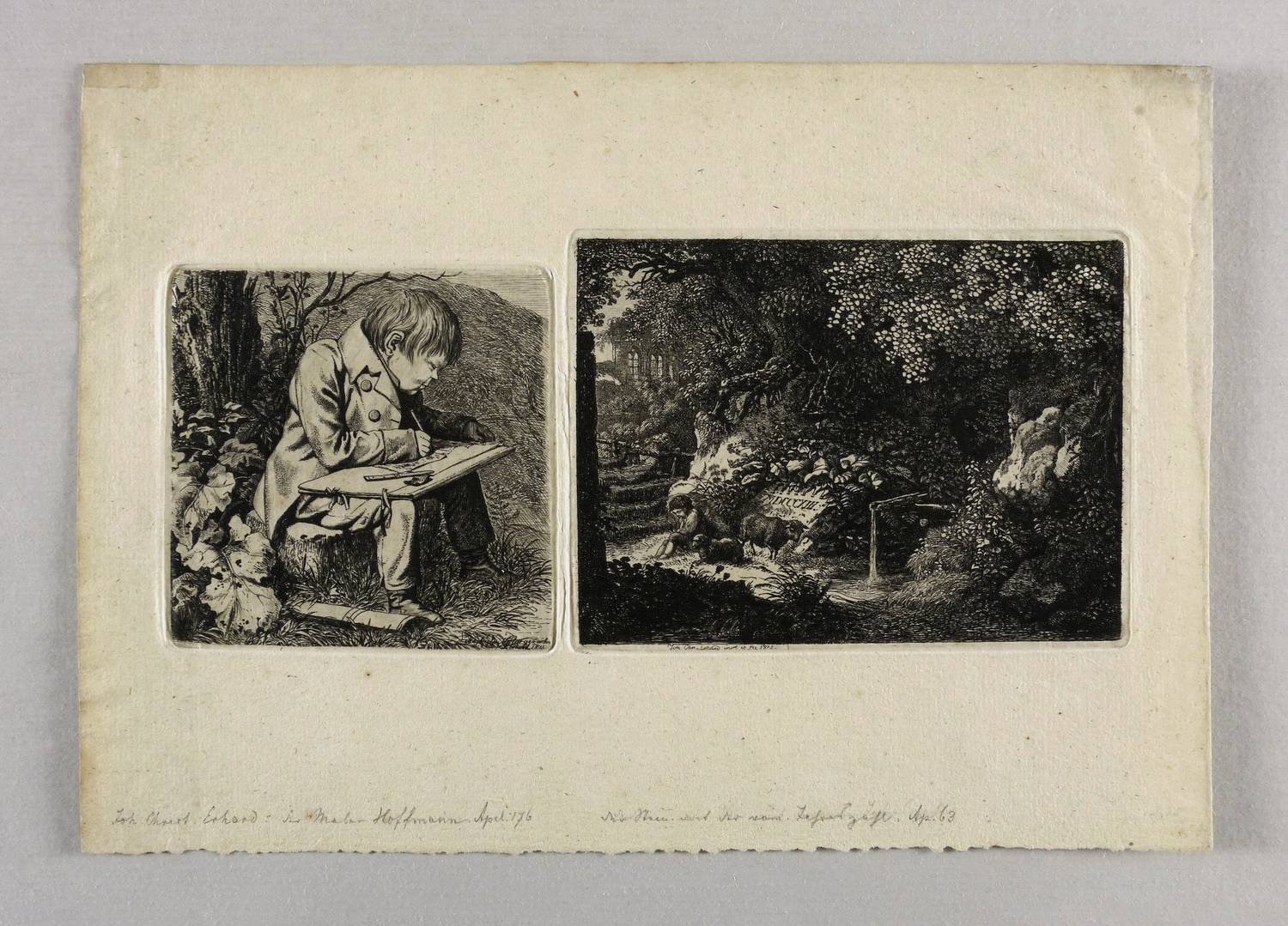 Apell 176 IV (von IV). – In der Platte rechts unten signiert und datiert: ″Nach der Natur gezeichn. u. rad. v. JC Erhard 1815″. Direkt darunter in Bleistift bezeichnet: ″Joh. Christ. Erhard: Der Maler Hoffmann. Apel[l] 176″. Die zweite Platte ebenfalls signiert und datiert. Wasserzeichen Fleur-de-Lys. – Erhard zeigt seinen kleinwüchsigen Künstlerfreund in diesem rührenden Porträt, wie dieser zum ersten Mal en plein air arbeitete. Das geht aus einer Notiz auf der Vorzeichnung zu dieser Radierung hervor. – Vorzüglicher Abzug vom vierten und letzten Zustand der Platte mit allen Vollendungen inklusive der zwei Nadelstriche auf der linken Schulter. – Hauptblatt des Künstlers! – Beigegeben die rechts daneben auf demselben Blatt abgezogene frühe Radierung Erhard's ″Der Stein mit der römischen Jahreszahl″ (1812, Apell 63 III, 10,3 x 13,7 cm). – Provenienz: Sammlung Friedrich Julius Arndt (genannt Fritz Arndt, 1856-1919, Besitzer des Klosterguts Oberwartha bei Dresden), danach Sammlung Dr. Theodor Arndt, Dresden-Blasewitz. – Verso unscheinbare Montagereste. Hervorragend erhalten. Sehr guter Zustand.