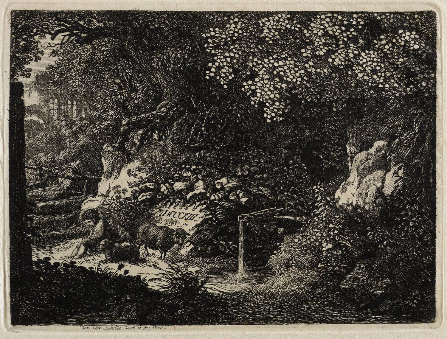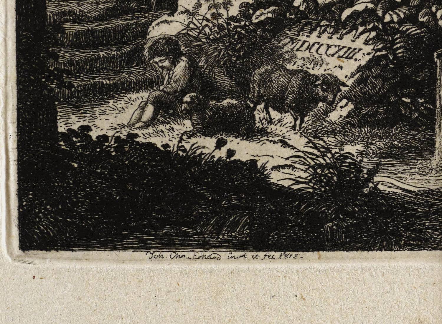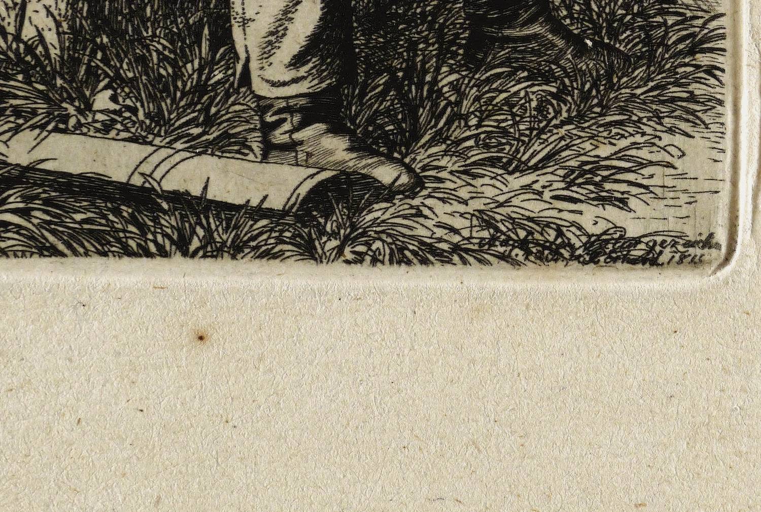 1815. Radierung / Strichätzung & Kaltnadel, in Schwarz, auf feinem gelbem Bütten. – Originale Künstlergrafik, von Johann Christoph Erhard. – 19,5 x 27,8 cm (Blatt), 9,6 x 9,6 cm (Darstellung / Platte).