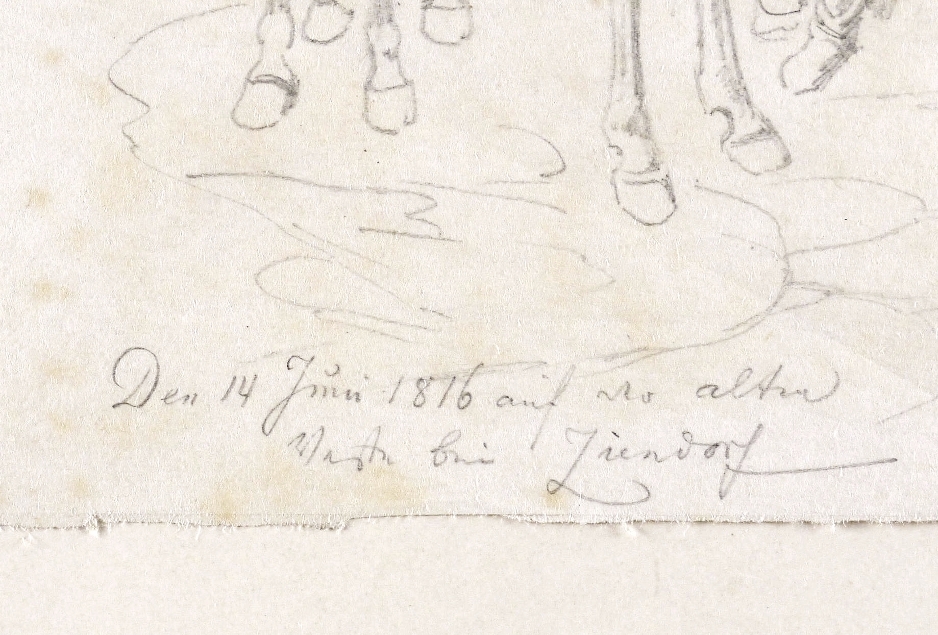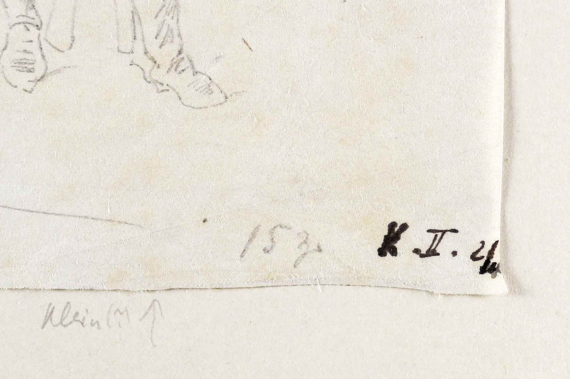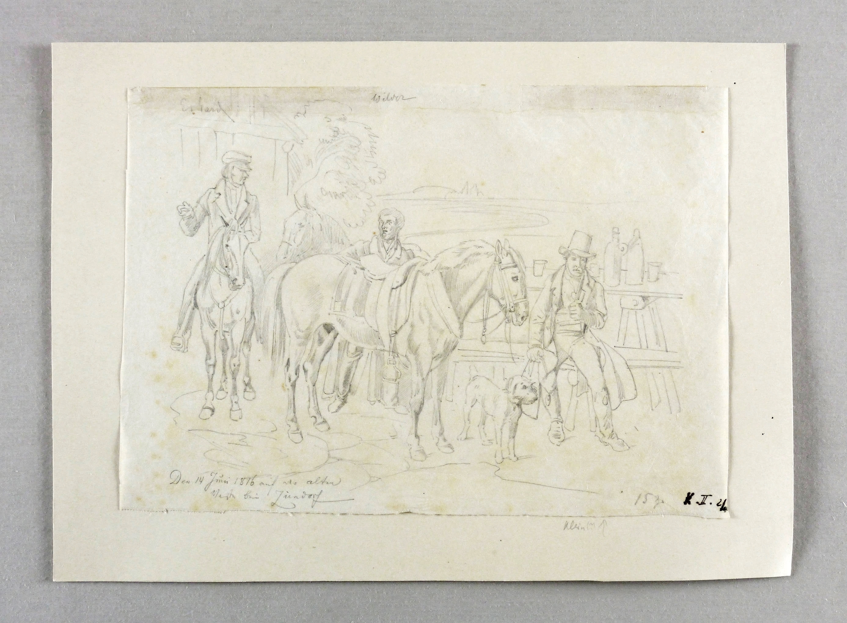 Im unteren Rand links eigenhändig in Bleistift bezeichnet: ″Den 14 Juni 1816 auf der alten / Veste bei Zirndorf″. Links oben über dem aufsitzenden Reiter ebenfalls eigenhändige Inschrift: ″Erhard″. Mittig über dem abgesessenen Reiter: ″Wilder″. In Feder und brauner Tusche rechts unten in der Blattecke nummeriert: ″K. II. 26″. Auf dem Trägerkarton von fremder Hand unter dem schon auf der Bank Sitzenden: ″Klein″. – Kurz vor seiner zweiten großen Wienreise unternahm Johann Adam Klein im Juni 1816 mit seinen Freunden Georg Christoph Wilder und Johann Christoph Erhard eine letzte Wanderung in das Nürnberger Umland. Die Künstlerfreunde kehrten auf der Alten Veste bei Zirndorf ein, einer Festungsruine und beliebten Raststelle westlich von Nürnberg. Die Zeichnung zeigt links Erhard hoch zu Ross, Wilder beim Satteln und Klein selbst Pfeife rauchend auf einer Bank. Von diesem Ausflug existiert eine weitere Zeichnung von Klein, welche die Freunde bei der Martersäule in Fürth festhält (siehe: Jutta Tschoeke (Hg.), Romantische Entdeckungen. Johann Adam Klein, Ausst.-Kat. Nürnberg 2006, Nr. 29). In der Grafischen Sammlung der Museen der Stadt Nürnberg liegen vergleichbare Transparentpausen des Künstlers. – Provenienz: 1947 Kunstantiquariat C.G. Boerner in Leipzig, danach Sammlung Dr. Theodor Arndt, Dresden-Blasewitz. – Beigegeben ein maschinenschriftliches Schreiben der Leipziger Kunsthandlung C.G. Boerner vom 8. März 1947 an den Sammler Dr. Theodor Arndt in Dresden mit Bezug auf ″die Bleistift-Zeichnung von Klein″ und das damit verbundene Angebot zum Erwerb. – Im oberen Rand mit Papiergelenken auf Trägerkarton montiert. Größeres, aber nicht stark ausgeprägtes Eselsohr in der linken unteren Blattecke. Guter Zustand.