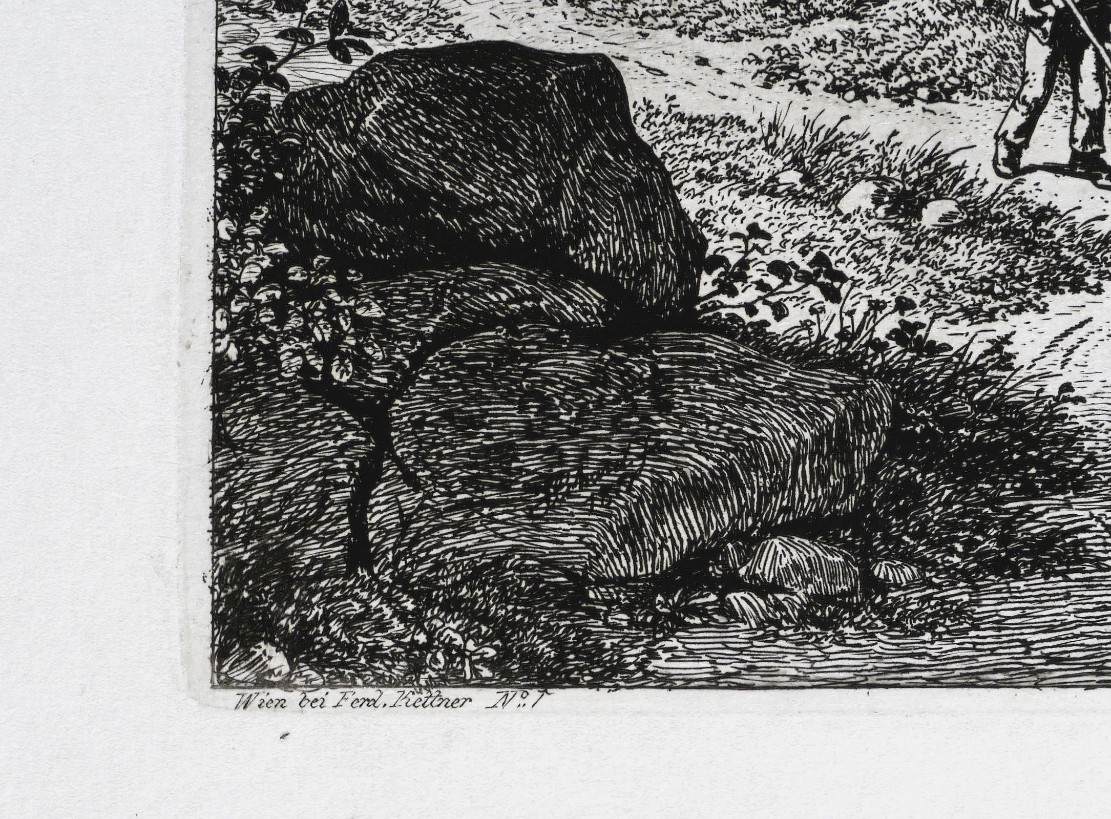 Apell 83 VI (von VI). – In der Platte links unten im großen Stein signiert und datiert: ″JC. Erhard fec. 1817.″ Links unter der Darstellung gestochene Verlegeradresse: ″Wien bei Ferd. Kettner No. 1″. In der linken unteren Blattecke von Sammlerhand in Bleistift bezeichnet: ″Apell Nr. 83 / IV″. An der Plattenkante rechts unten Besitzstempel Fürst Leopold I. von Anhalt-Dessau in Schwarz (1676-1747, Lugt L.1708b). – Schöner kraftvoll zeichnender Abzug vom vierten und letzten Zustand der Platte mit den Vollendungen aller Gegebenheiten, inklusive der Adresse von Ferdinand Kettner. – Provenienz: Sammlung der Fürsten von Anhalt-Dessau (der Stempel von Leopold I. fand nach dessen Tod weiter Verwendung, vermutlich unter Leopold IV. Friedrich, 1794-1871), dann Sammlung Friedrich Julius Arndt (genannt Fritz Arndt, 1856-1919, Besitzer des Klosterguts Oberwartha bei Dresden), danach Sammlung Dr. Theodor Arndt in Dresden-Blasewitz. – Ohne Tadel. Insgesamt sehr guter Zustand.