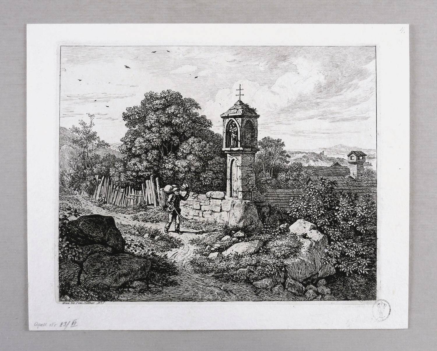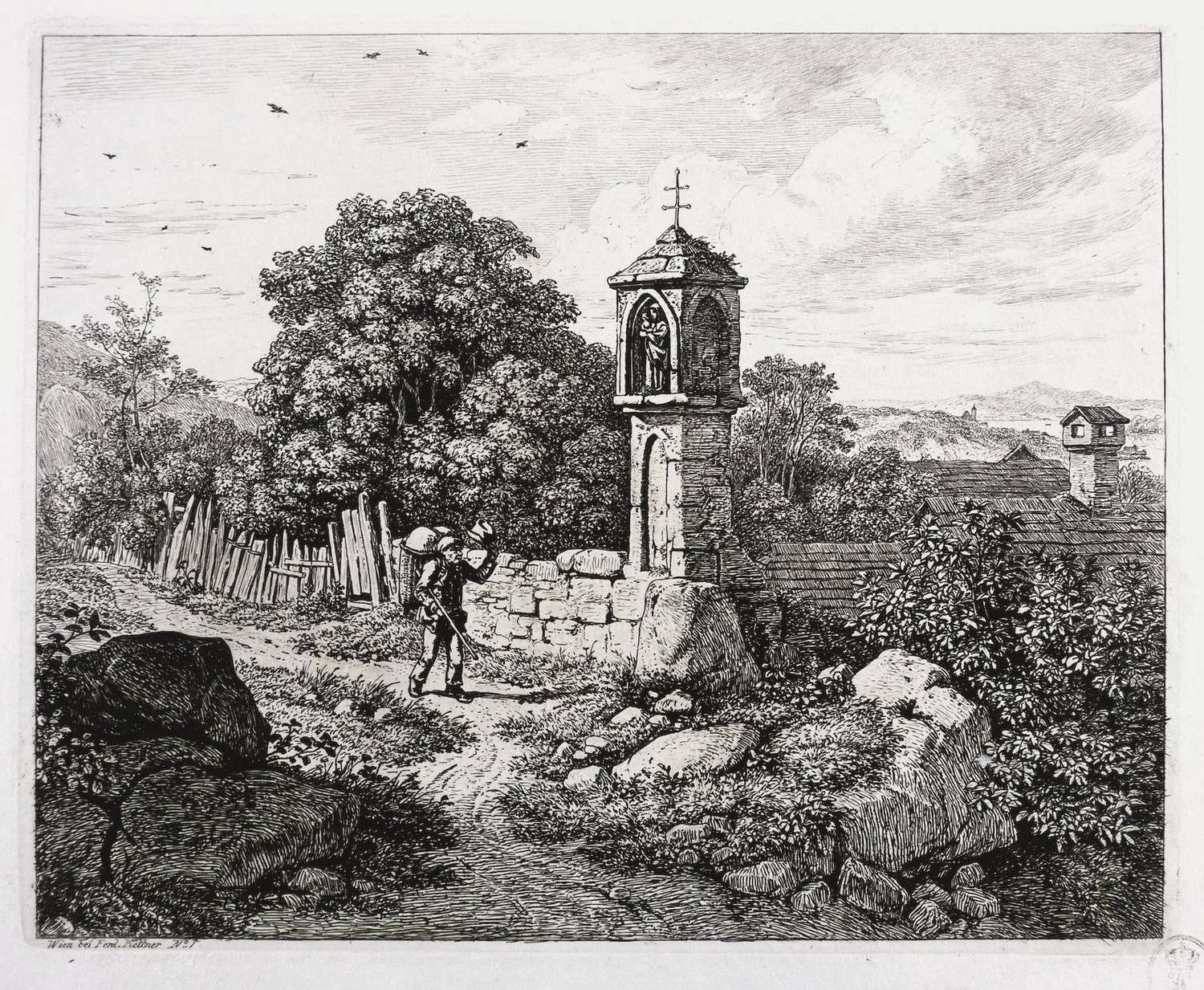 1817. Radierung / Strichätzung & Kaltnadel, in Schwarz, auf hellgelbem Velin. – Originale Künstlergrafik, von Johann Christoph Erhard. – 16,2 x 20,1 cm (Darstellung / Einfassungslinie), 19,5 x 24,2 cm (Blatt), 16,8 x 20,5 cm (Platte).