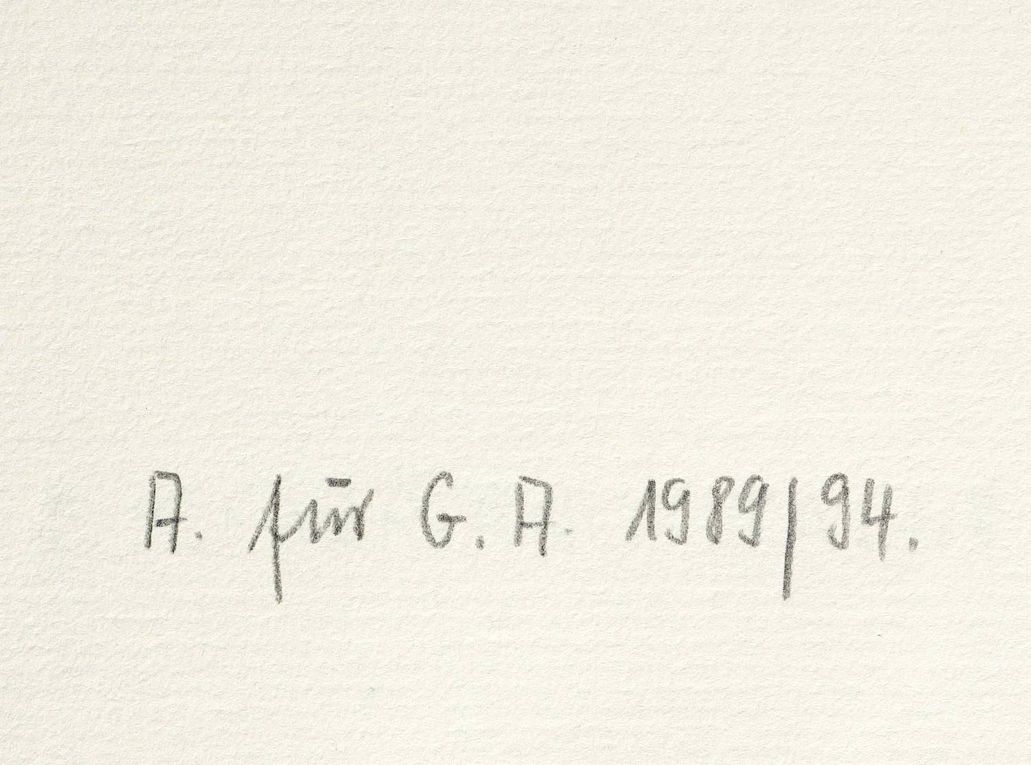 Janda L 130. – Nicht handsigniert. Unterhalb Trockenstempel des Künstlers. Links unten in Bleistift Signatur von Anneliese Ströch: ″A. für G.A. 1989/94.″ – Aus einer Auswahl vom Künstler kurz vor seinem Tod 1989 für eine Mappenedition vorbereiteter Lithografien, deren Druck Horst Arloth in Leipzig besorgte. - Von dieser Lithografie existieren nur insgesamt 15 zu Lebzeiten sowie 17 posthum gedruckte Exemplare. – Tadelloser Zustand.