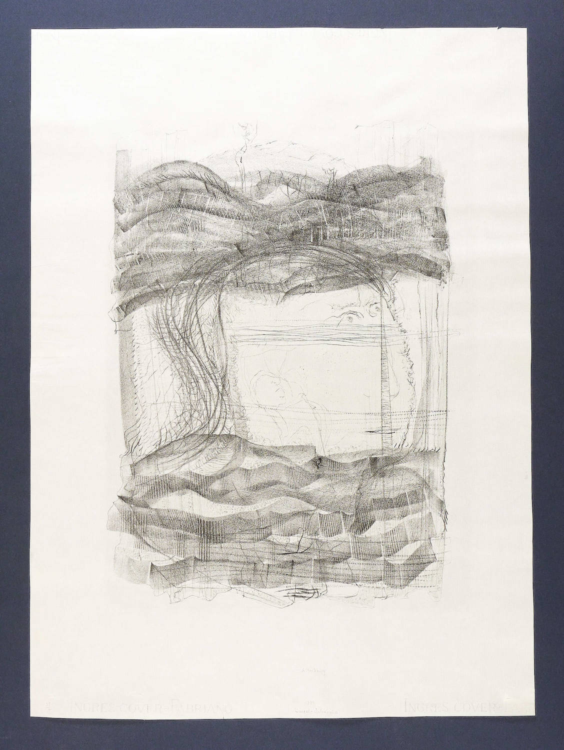 1971. Farblithografie / Kreide- & Pinsellithografie, in zartem Hellblau & Schwarz, auf leichtem Fabriano-Bütten. – Originale Künstlergrafik, von Gerhard Altenbourg. – Auflage Exemplar Nr. 98/150. – 46,0 x 33,6 cm (Darstellung / Druckbild), 65 x 47 cm (Blatt).