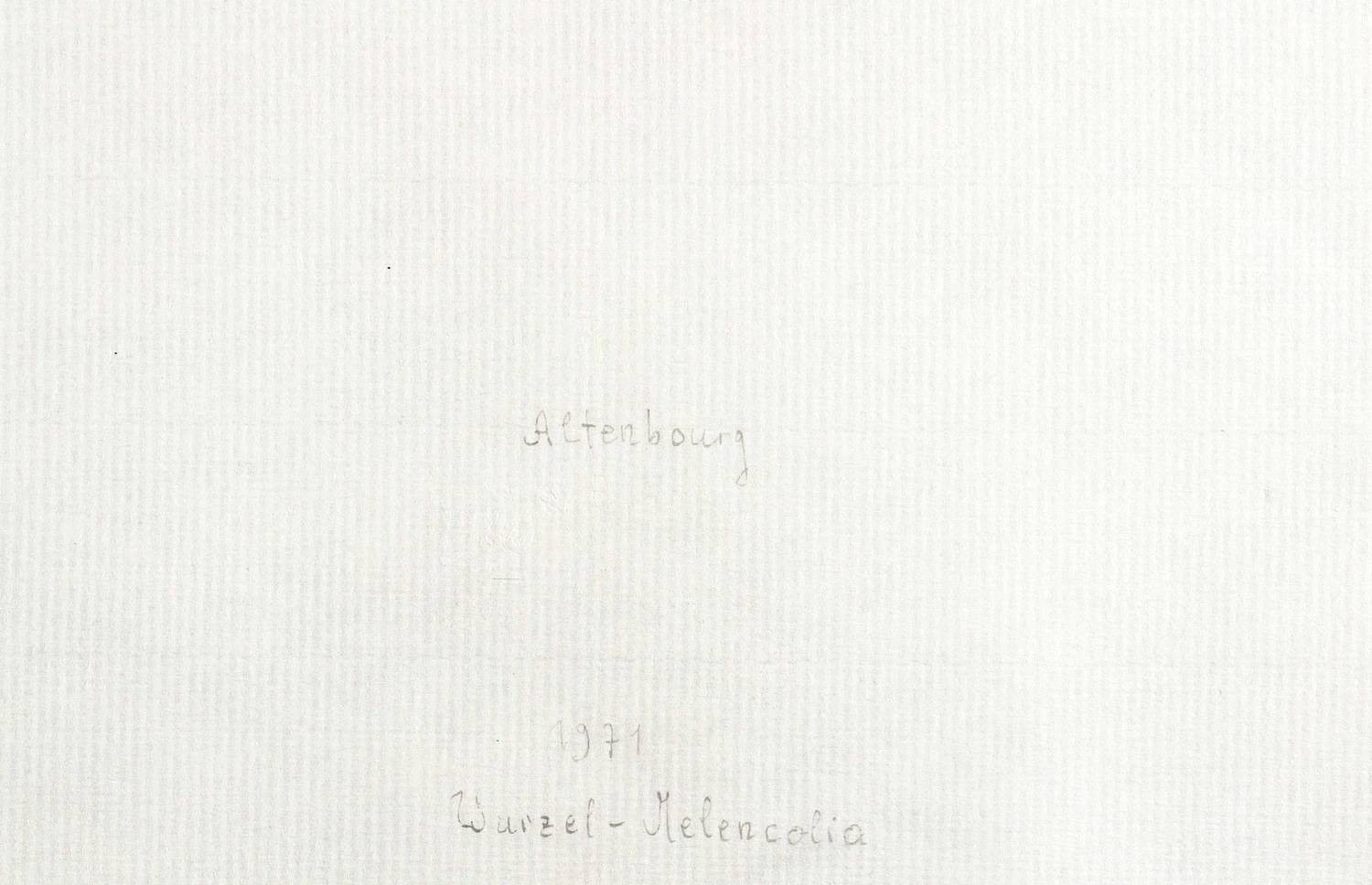 Mehnert 181. Janda 145 II 2 (von 2). – Unterhalb in grauer Feder signiert, datiert und betitelt: ″Altenbourg / 1971 / Wurzel-Melencolia″. Dazu Trockenstempel des Künstlers. In der Blattecke links unten Auflagenbezeichnung. – Das feine Büttenpapier im äußeren unten Rand mit leichten Läsuren. Seitlich partiell geringfügig gewellt. Insgesamt guter Zustand.