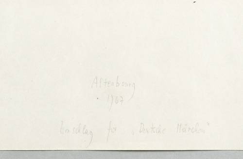 Janda L 120 II 2 b. – Unterhalb in Bleistift signiert und datiert: ″Altenbourg / 1967″. Darunter bezeichnet: ″Umschlag für 'Deutsche Märchen'″. Links Auflagenbezeichnung. Im Stein Inschrift. – Einer von vier Probedrucken. Zusammendruck der Steine I und II. Die 50 Auflagen-Exemplare zur Deckel-Gestaltung der Mappe ″Deutsche Märchen″ (Kabinettpresse Berlin) blieben unsigniert. – Papier im Rand bisweilen leicht bestoßen. Sonst ohne Mängel. Guter Gesamtzustand.