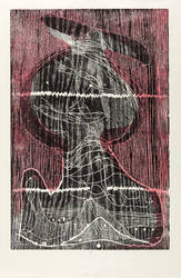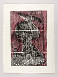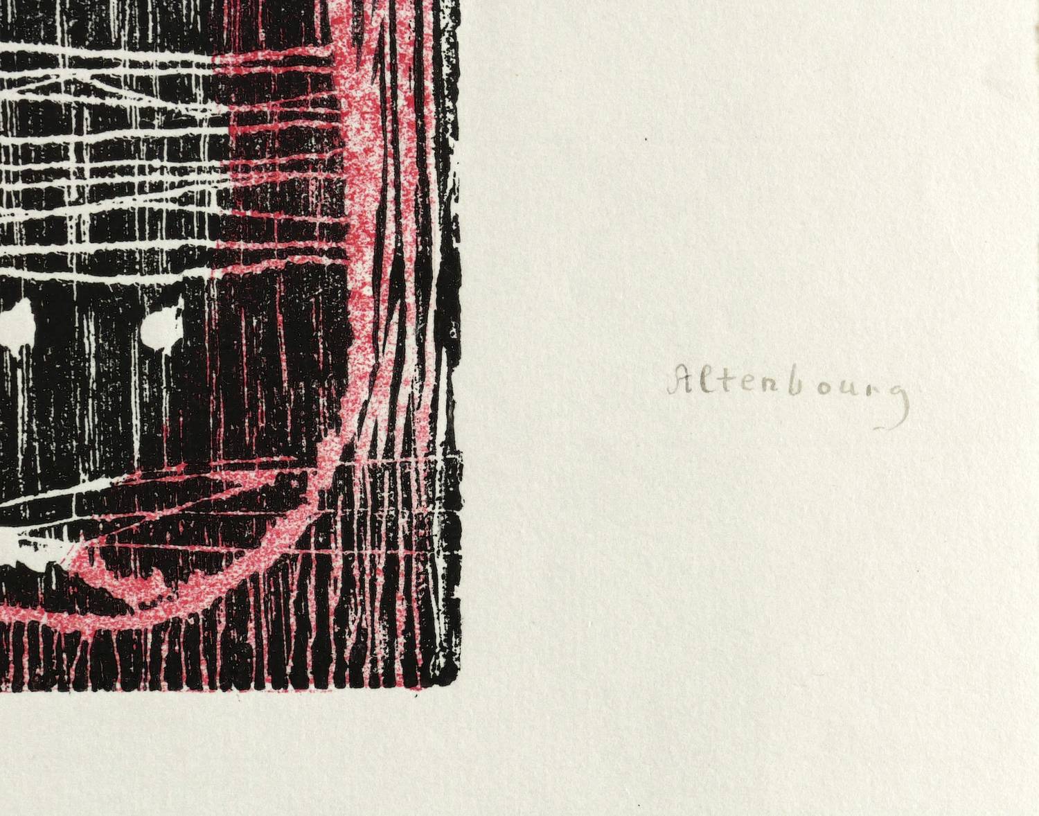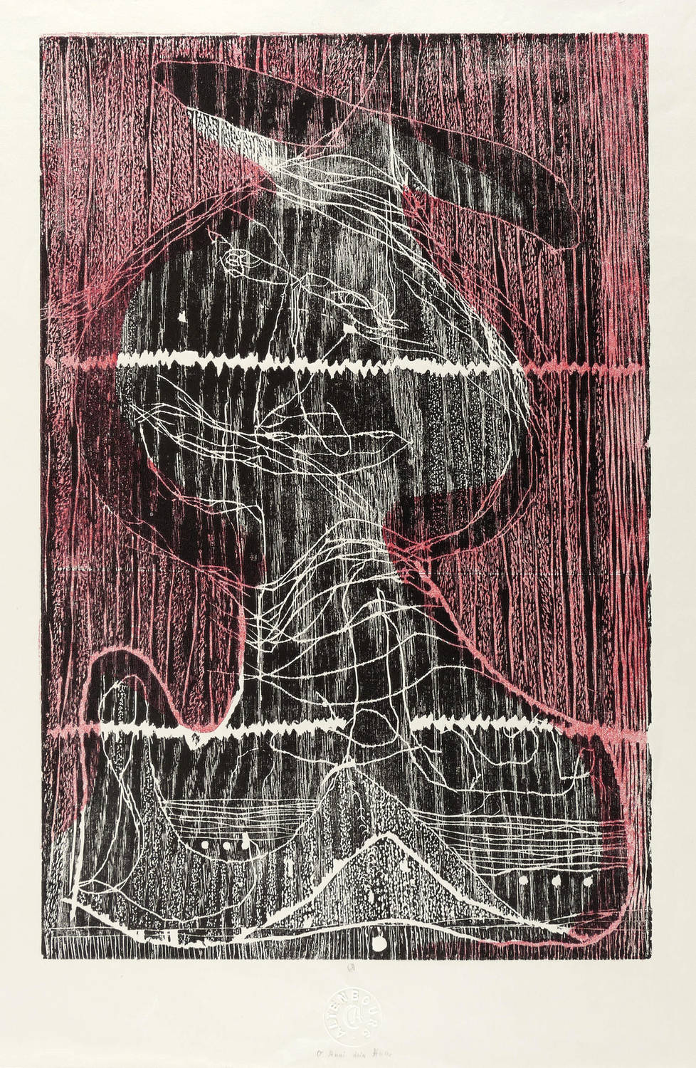 1978. Farbholzschnitt, in Hellrot & Schwarz, auf zartem Spechthausen-Bütten. – Originale Künstlergrafik, von Gerhard Altenbourg. – Auflage Exemplar Nr. 1/1. – 38,2 x 25,4 cm (Darstellung / Druckstock), 48 x 36 cm (Blatt).