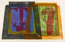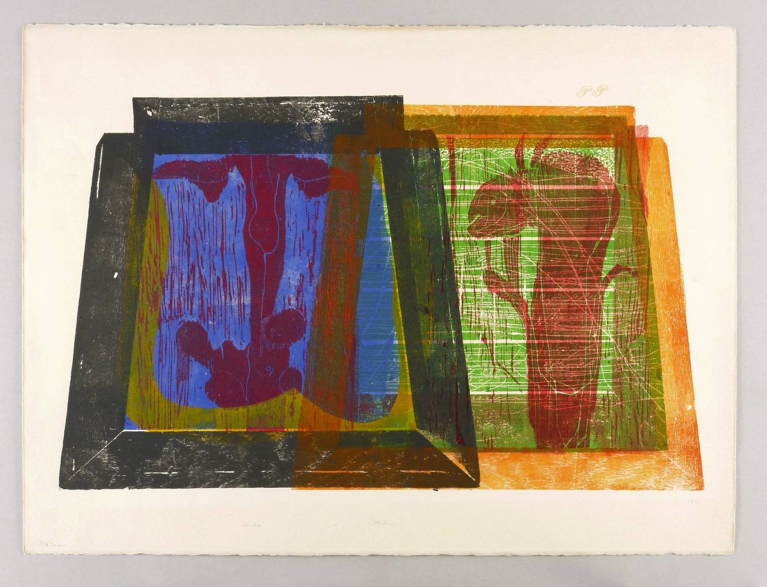 1973. Farbholzschnitt, in 7 Farben, von 7 Stöcken, auf chamois Arches France. – Originale Künstlergrafik, von Gerhard Altenbourg. – Auflage Exemplar Nr. 5/14. – 42,4 x 69,3 cm (Darstellung / Druckstock), 57 x 77 cm (Blatt).